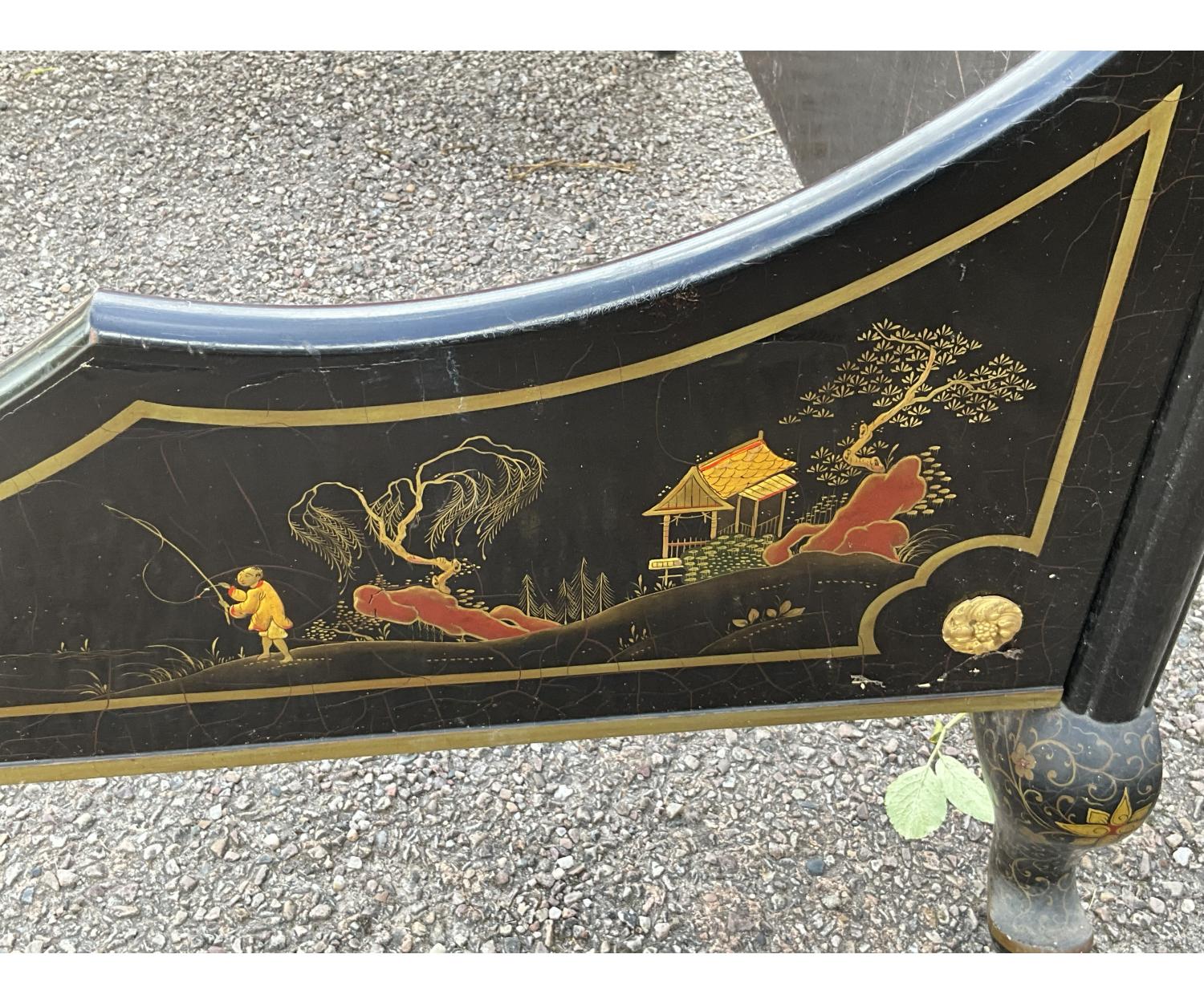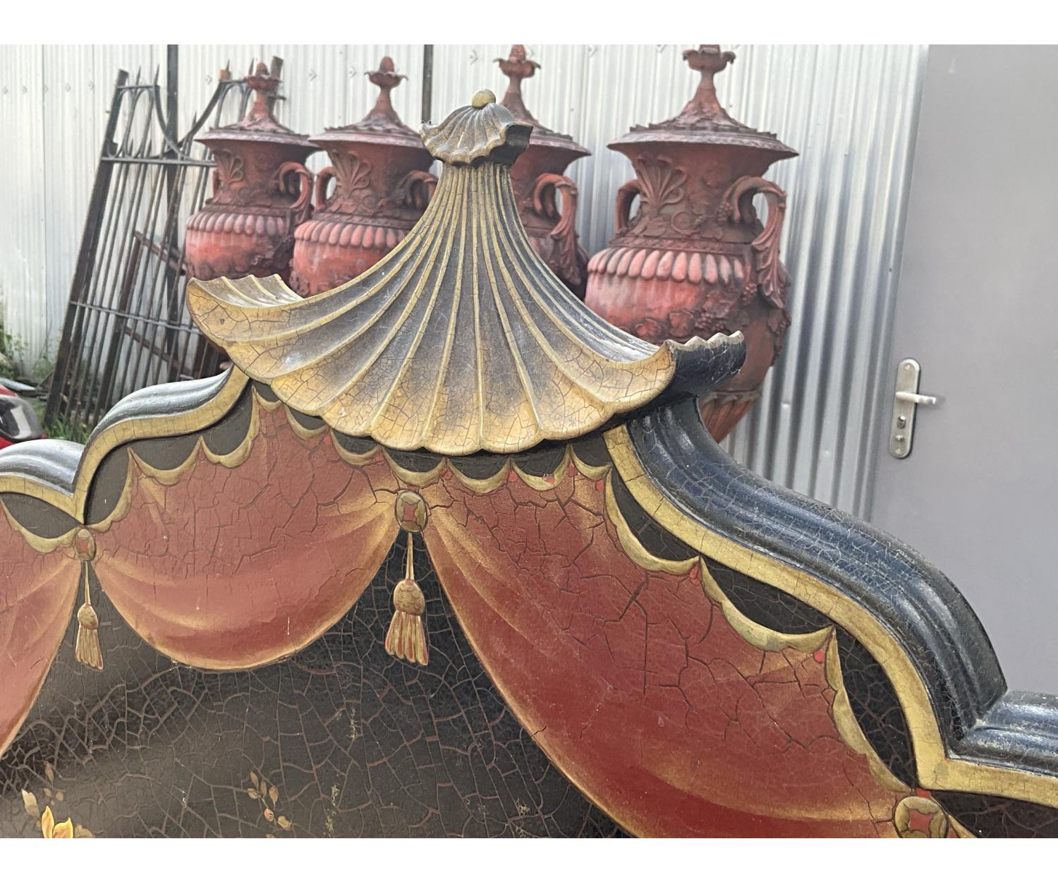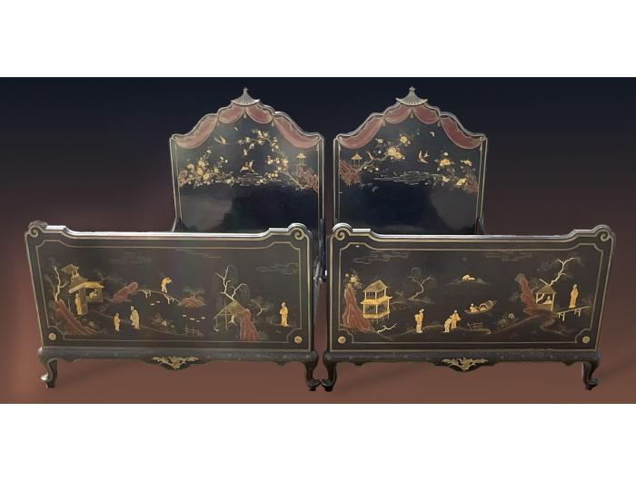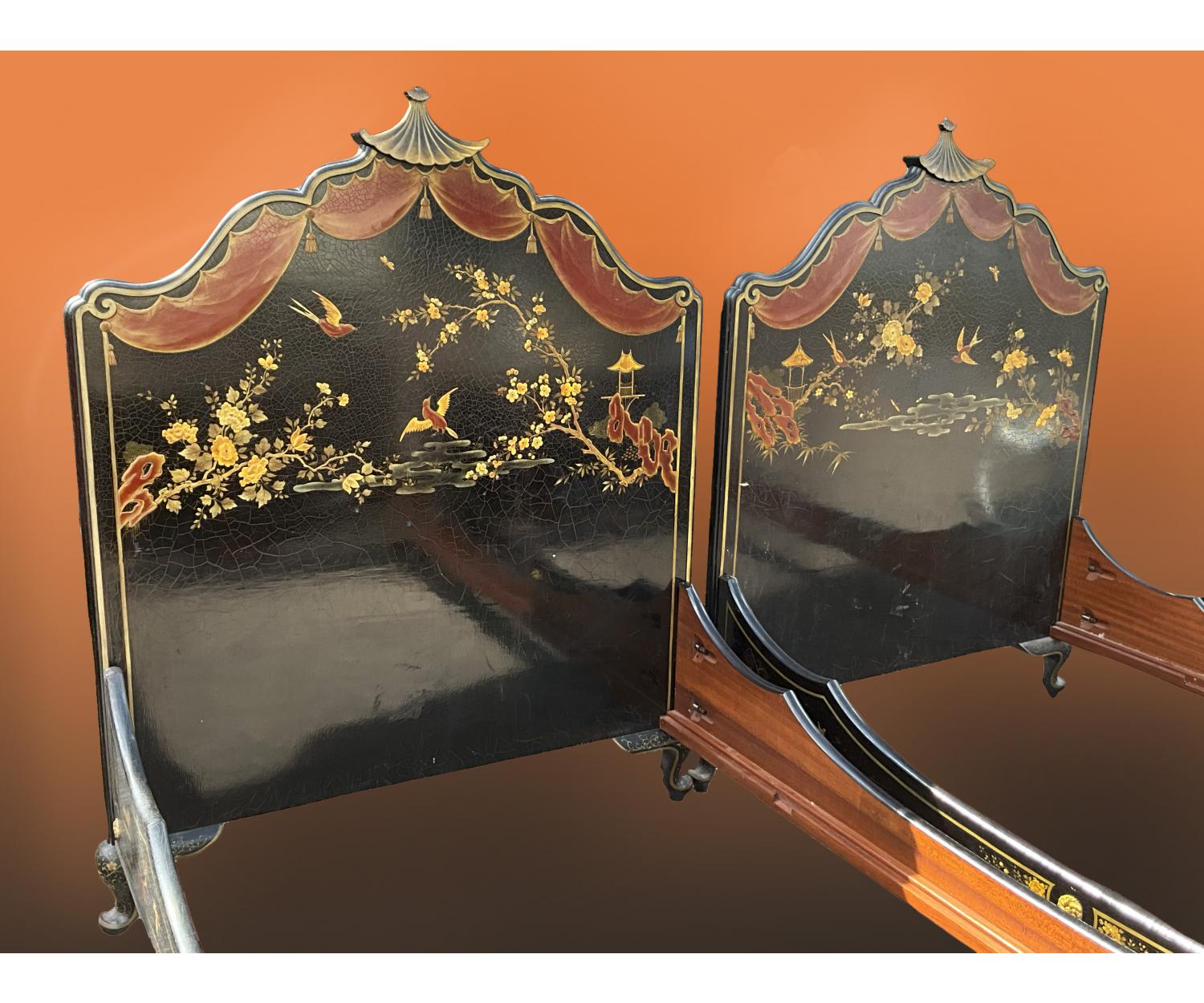 A pair of beautifully decorative and colourful continental single beds in Japanese taste. Stamped G.V.Pillinini. Lacquered with attractive chinoiserie details. Dimensions inside W 116cm x 200cm (3'10'' x 6'6'') Outside to outside 130cm x 211cm.