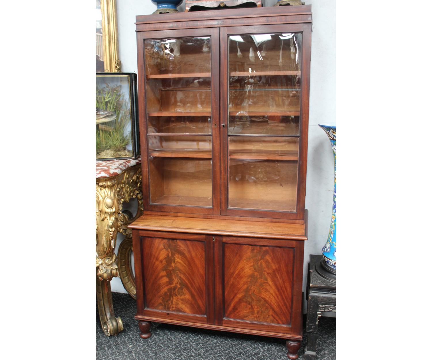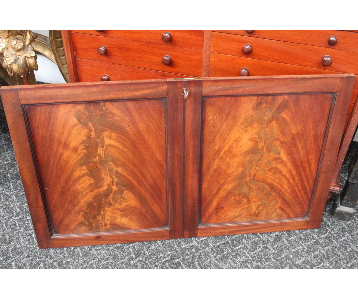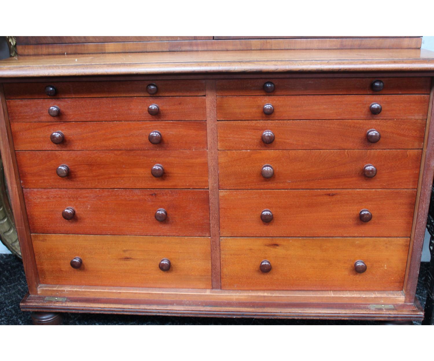 A Mahogany Bookcase. Top has two glazed doors and three fitted shelves. Base has a lift out two panel door enclosing two banks of six graduated drawers, Circa 1860