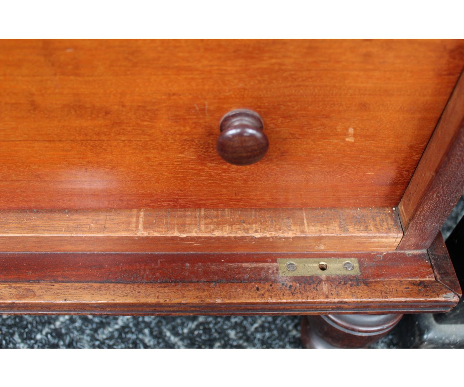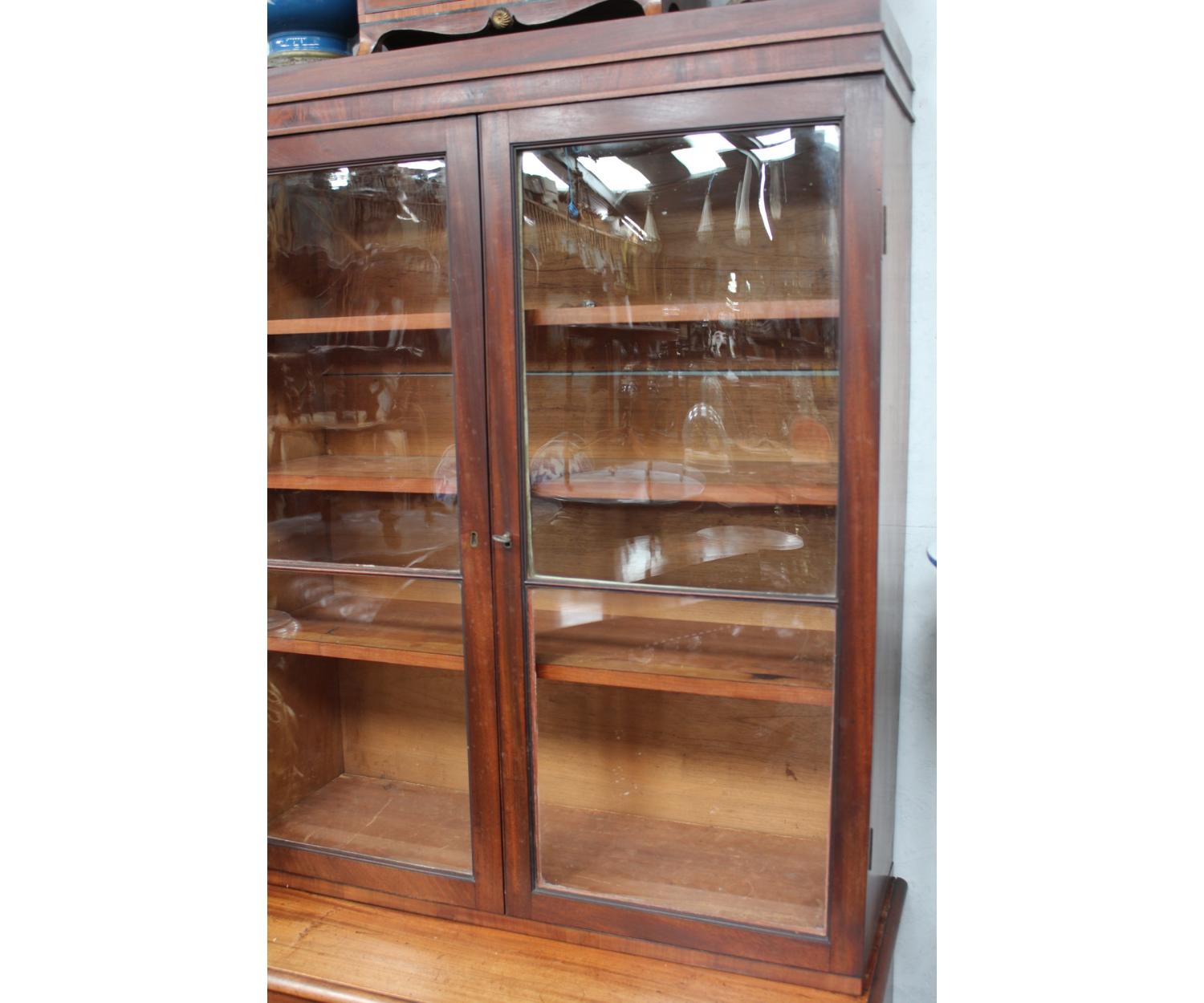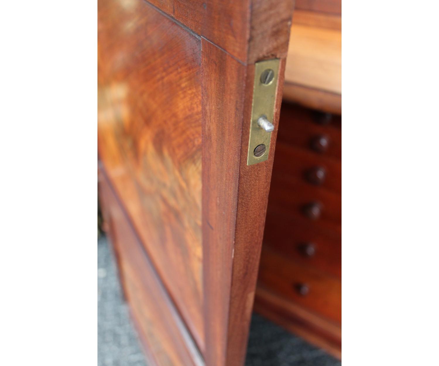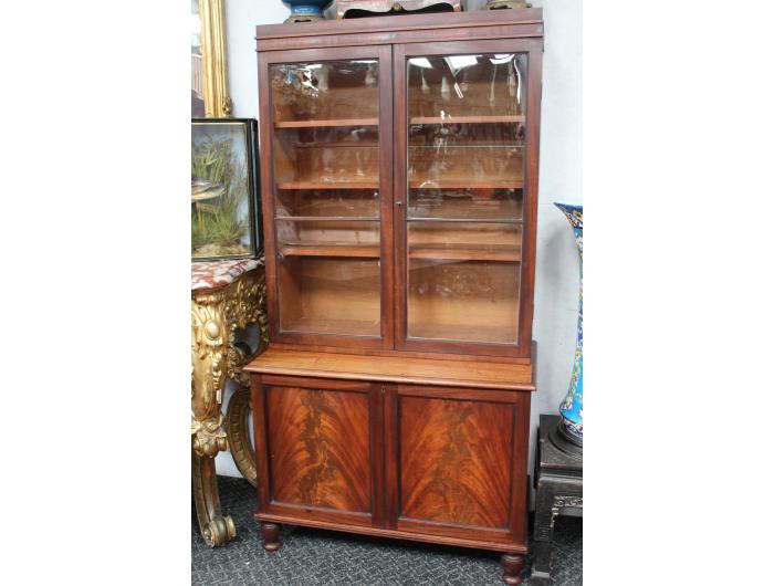 A Mahogany Bookcase. Top has two glazed doors and three fitted shelves. Base has a lift out two panel door enclosing two banks of six graduated drawers, Circa 1860