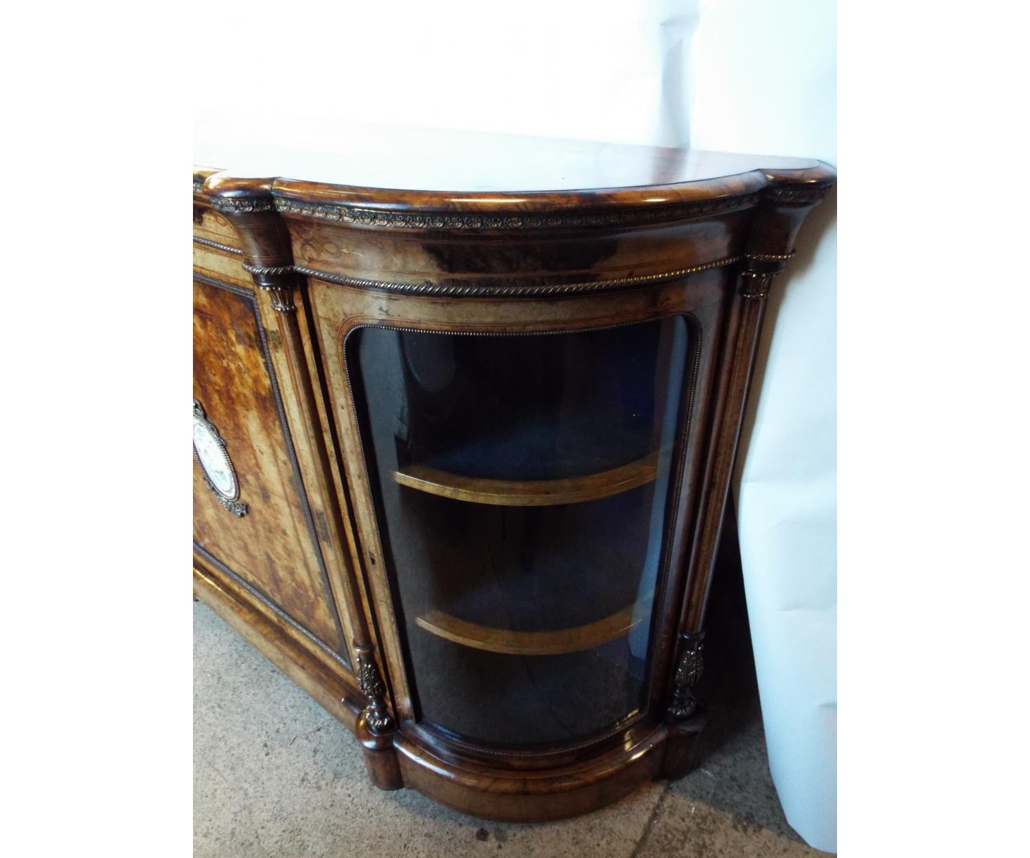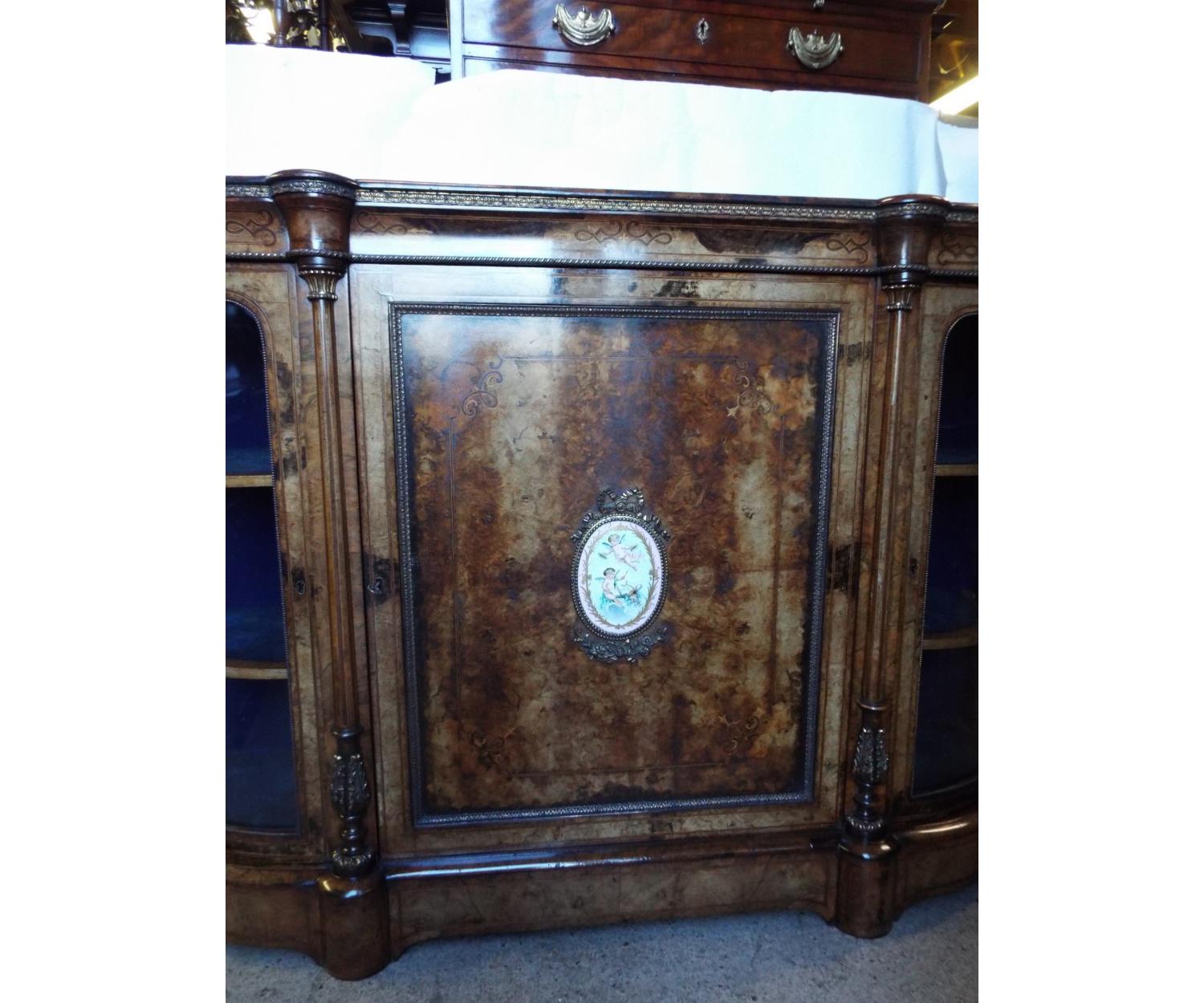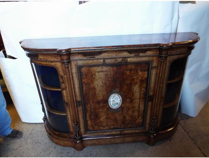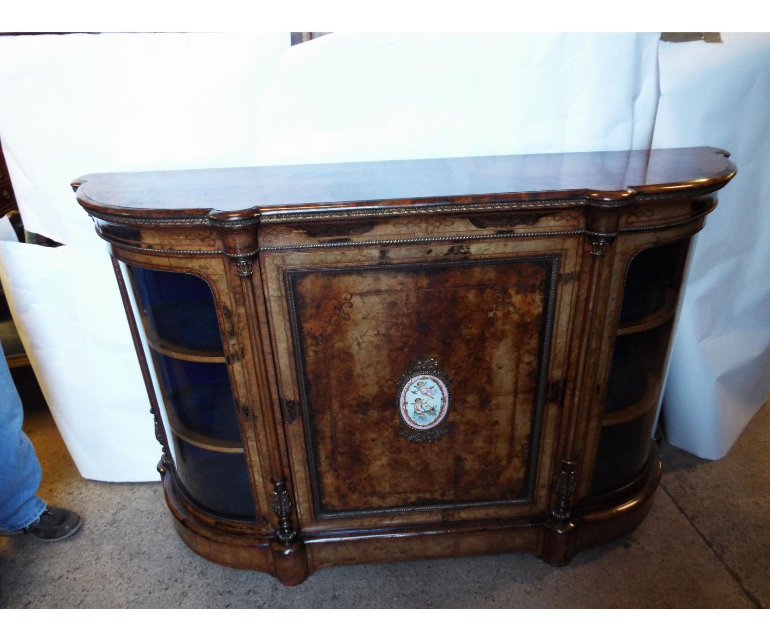 Walnut Credenza. Two bow glass doors flanking central panel door with plaque decorated with inlay. Has brass bordered doors and frieze. Circa 1860