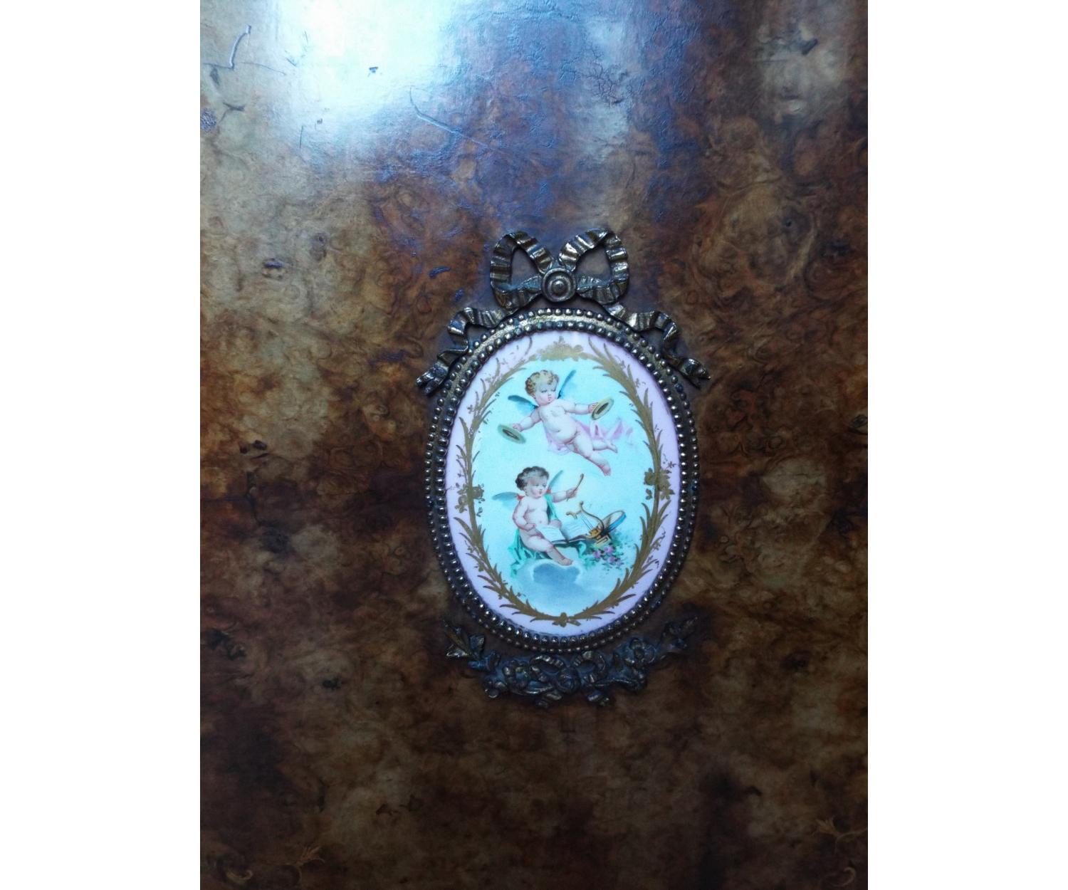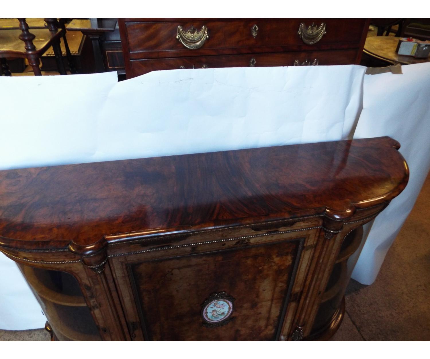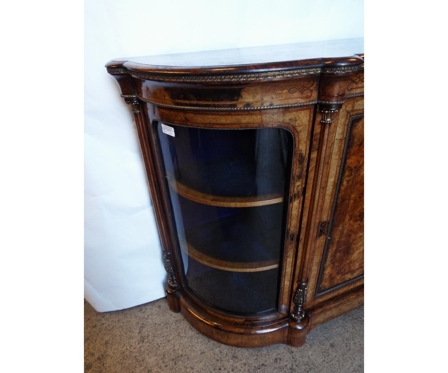 Walnut Credenza. Two bow glass doors flanking central panel door with plaque decorated with inlay. Has brass bordered doors and frieze. Circa 1860