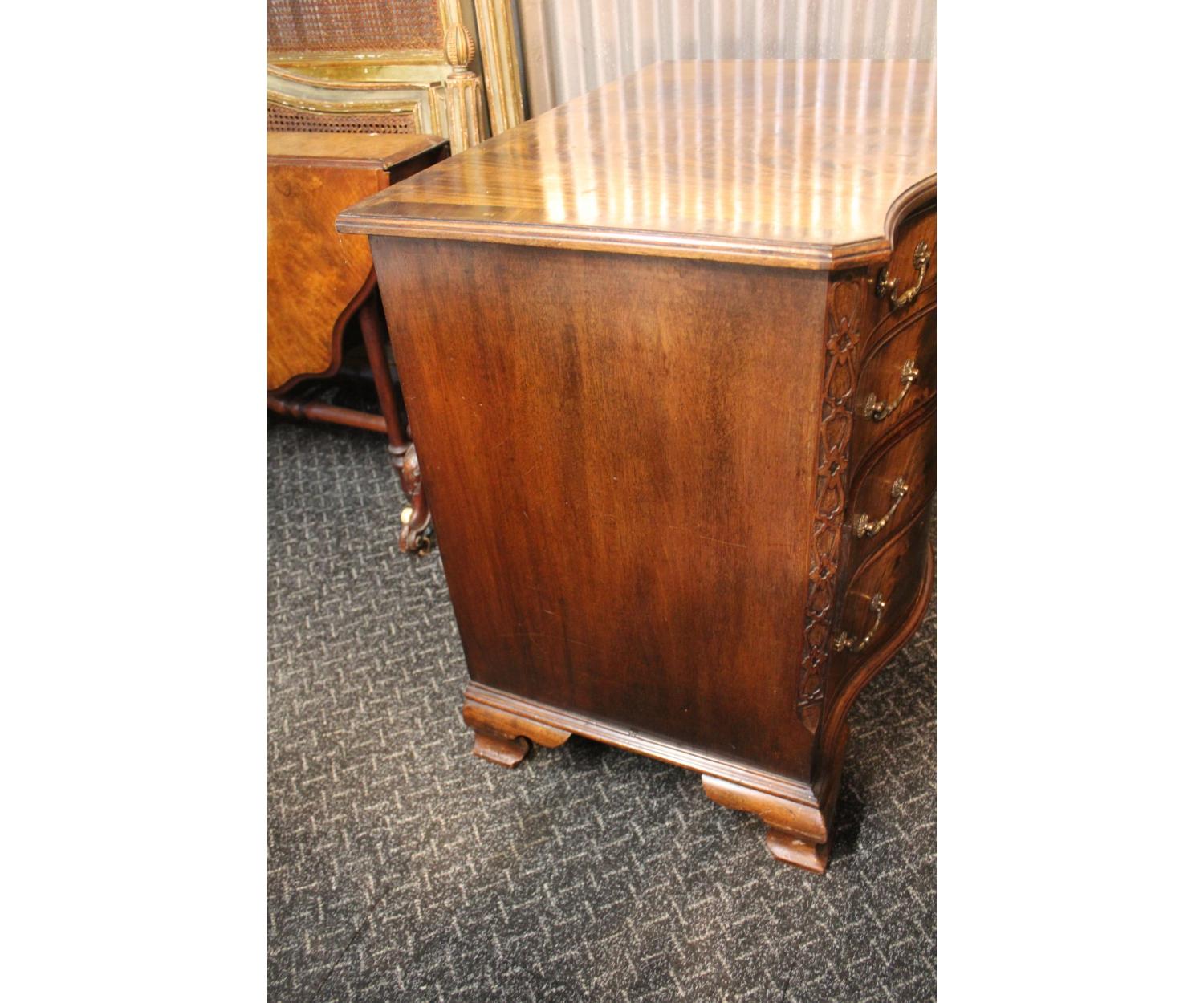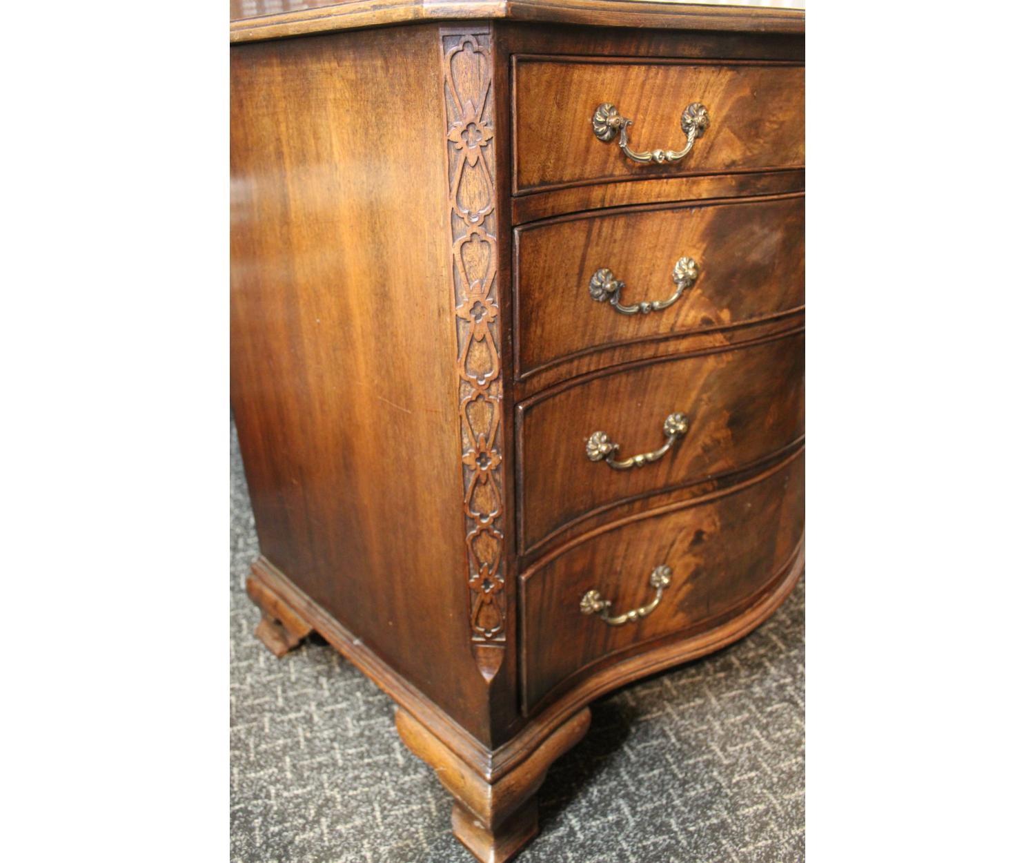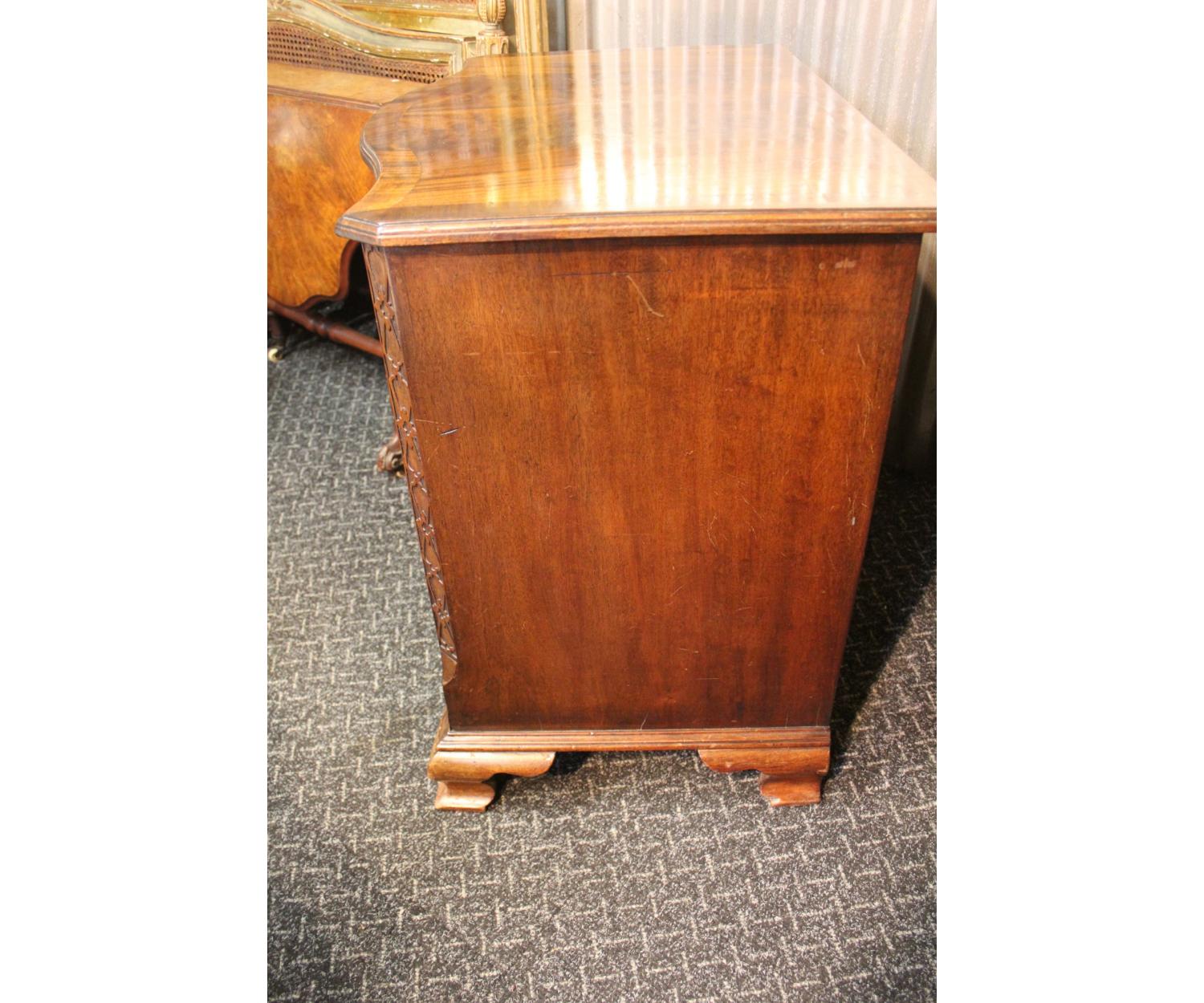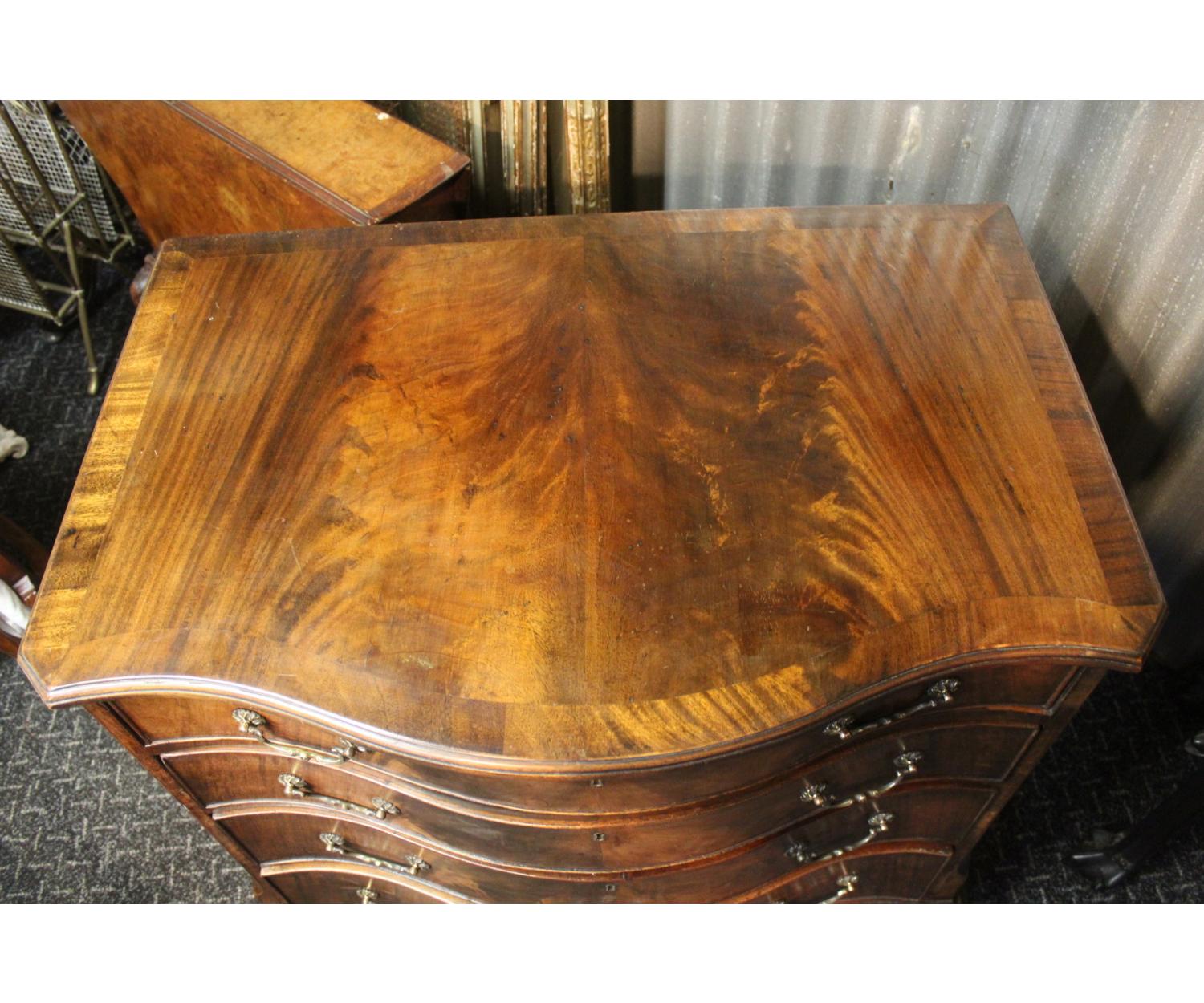 Mahogany Serpentine Chest of four long graduated drawers. Has cross banded top, canted corners and stands on bracket feet. Circa 1900