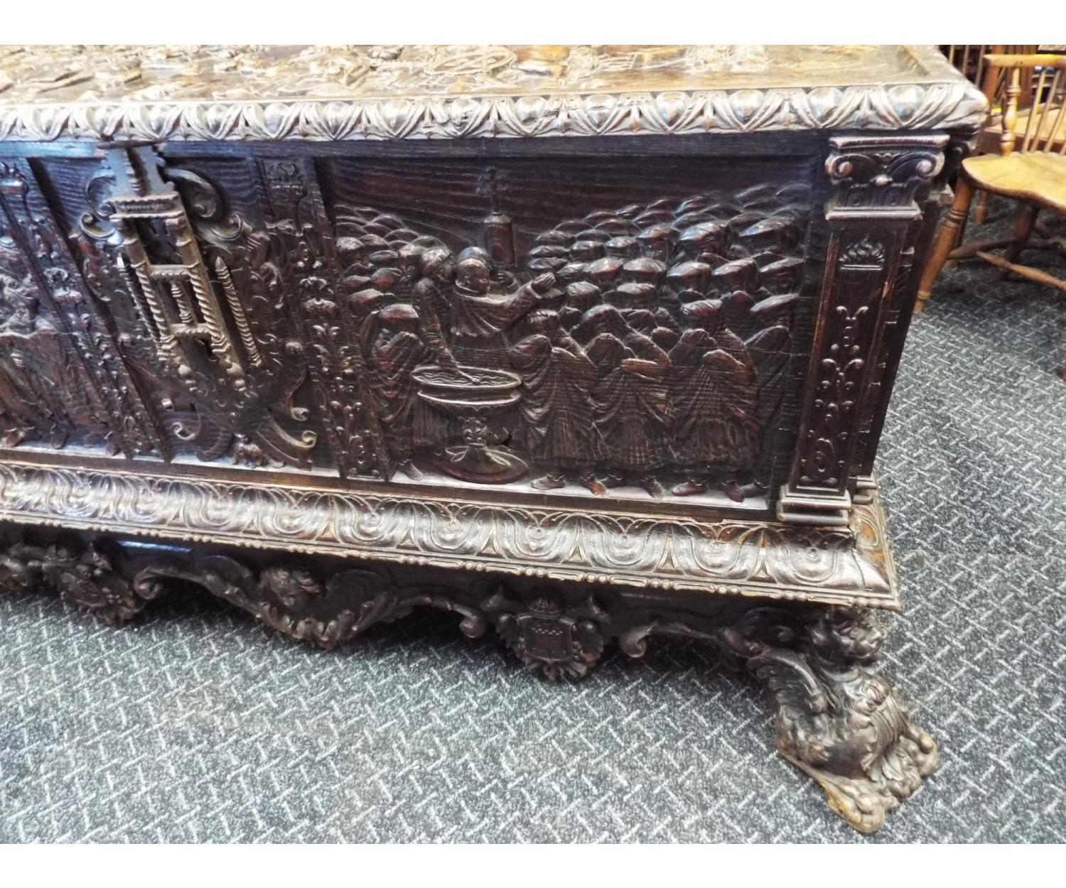 A carved chestnut cassonne. 19th century in a 17th century style. French