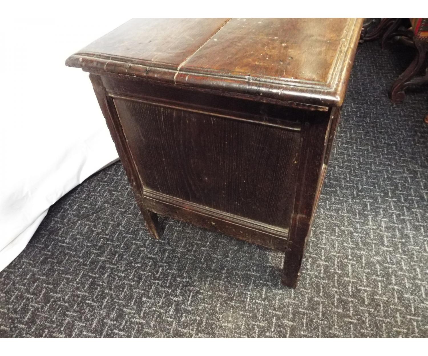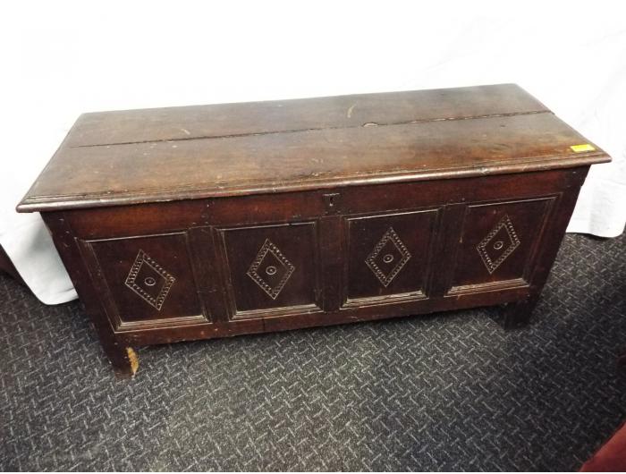 Oak coffer four carved panels to the front and plain panel sides, Circa 1680