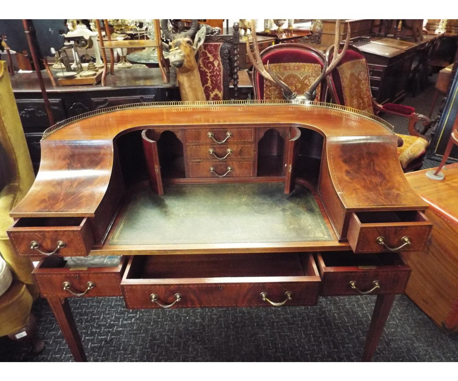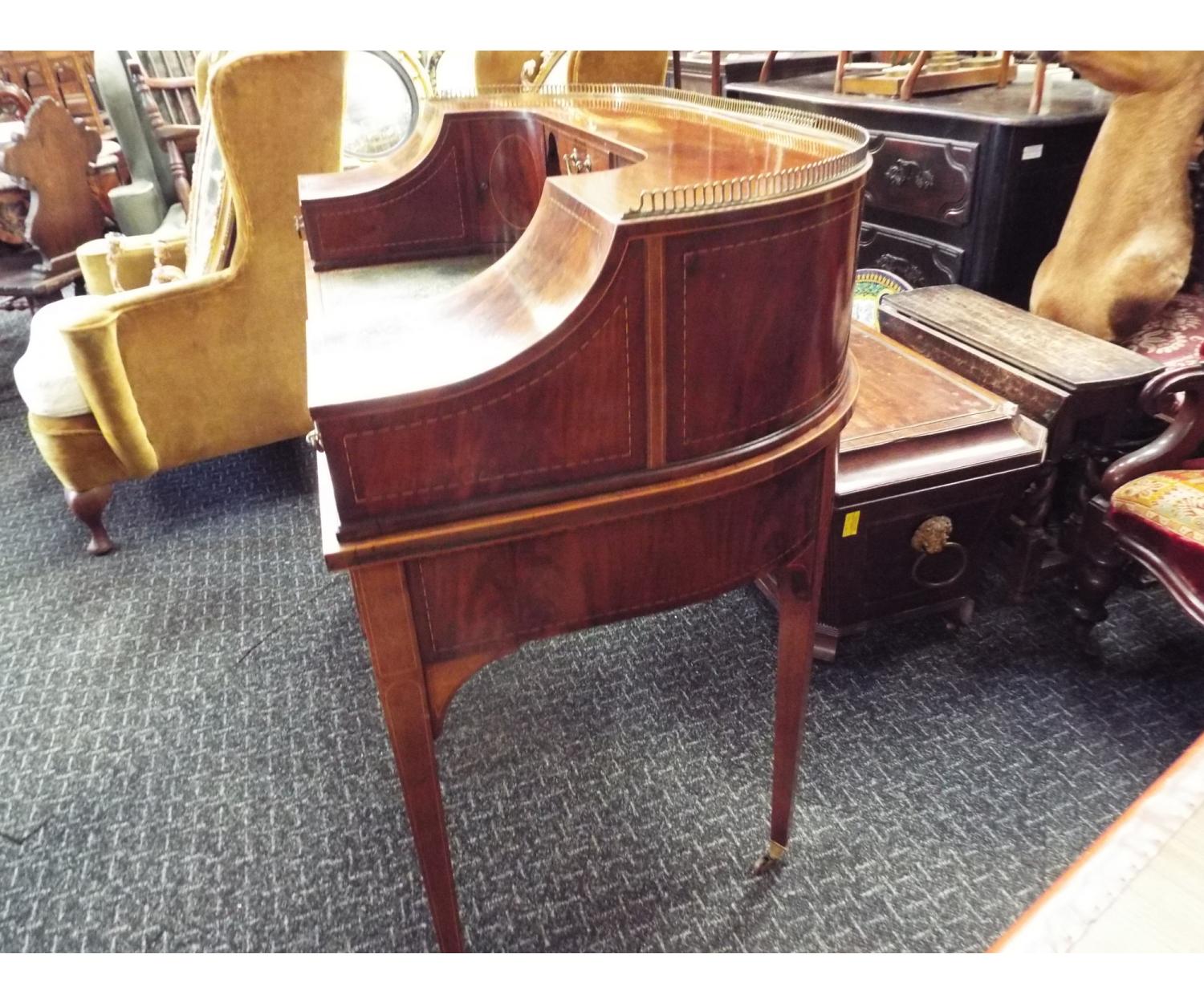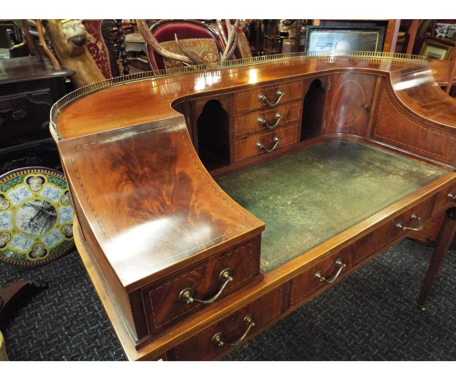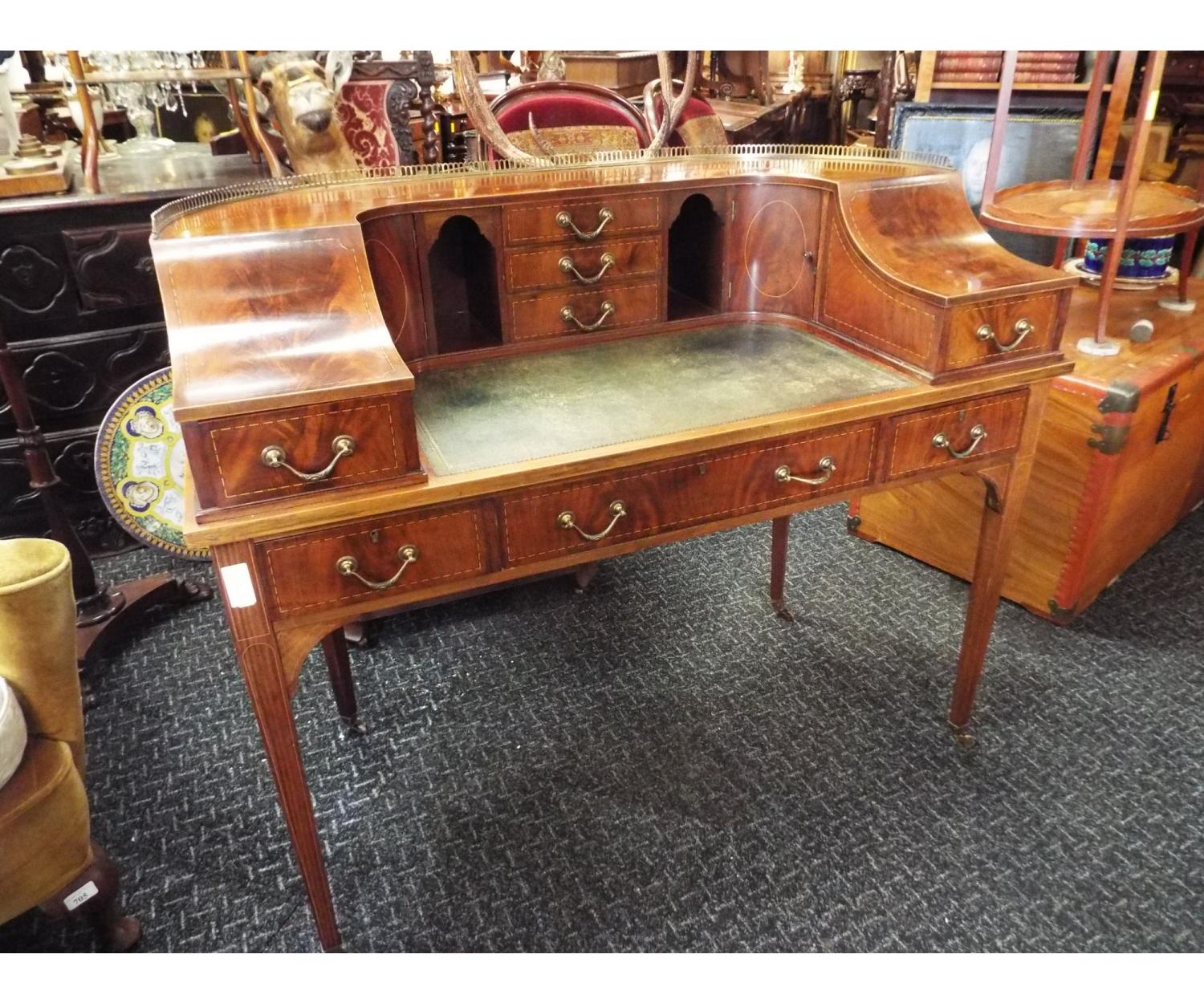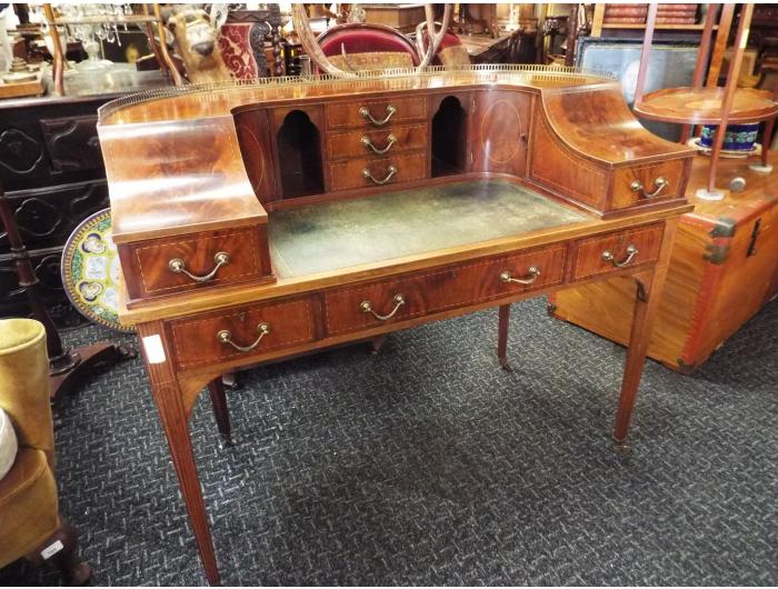 Mahogany Inlaid Carlton House Desk. Inset green leather and stands on square tapered legs and brass castors. Needs slight restoration. Circa 1890