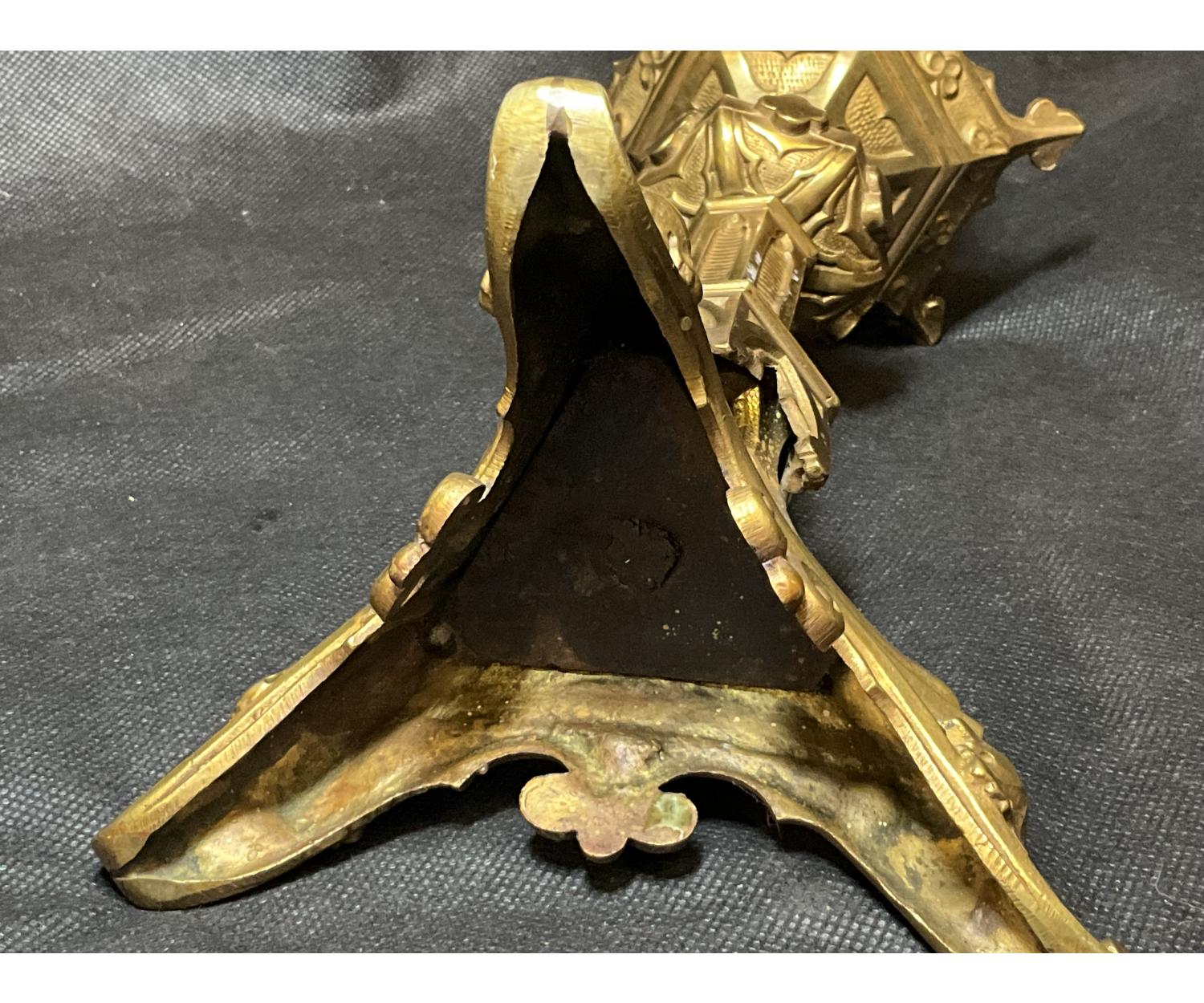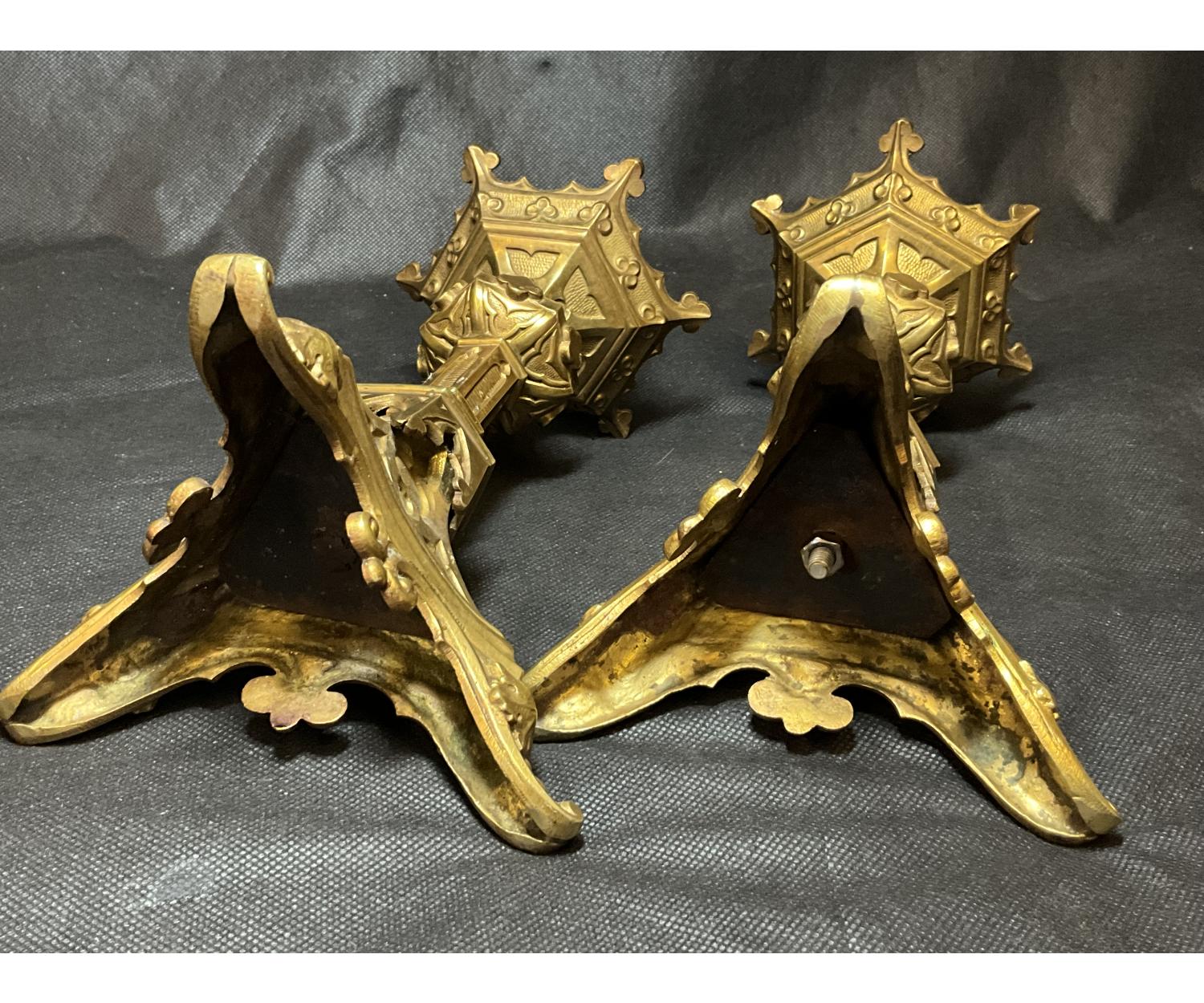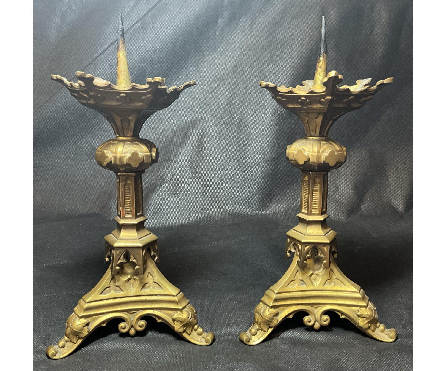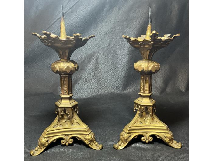 English circa 1900, these candlesticks illustrate the intricate details of the Gothic design are sure to catch the eye of anyone who sees them. These candlesticks are 28cm tall with a 14cm triangular base.