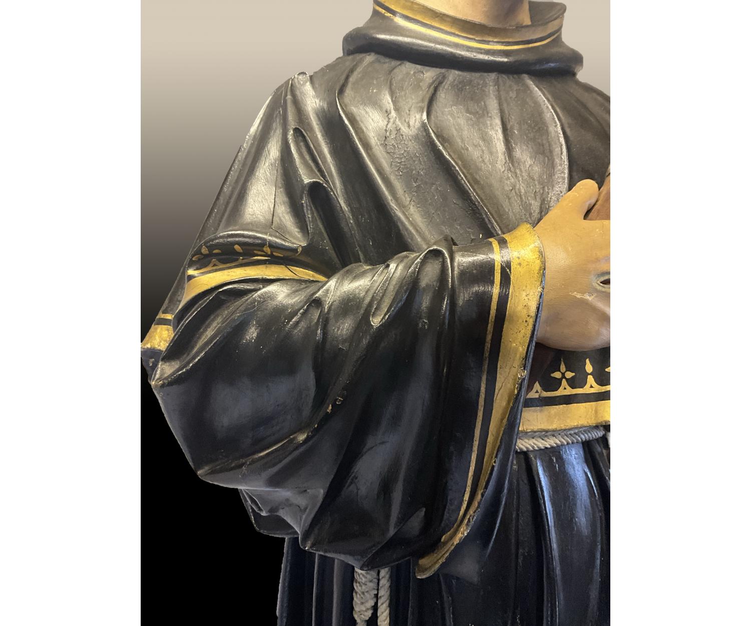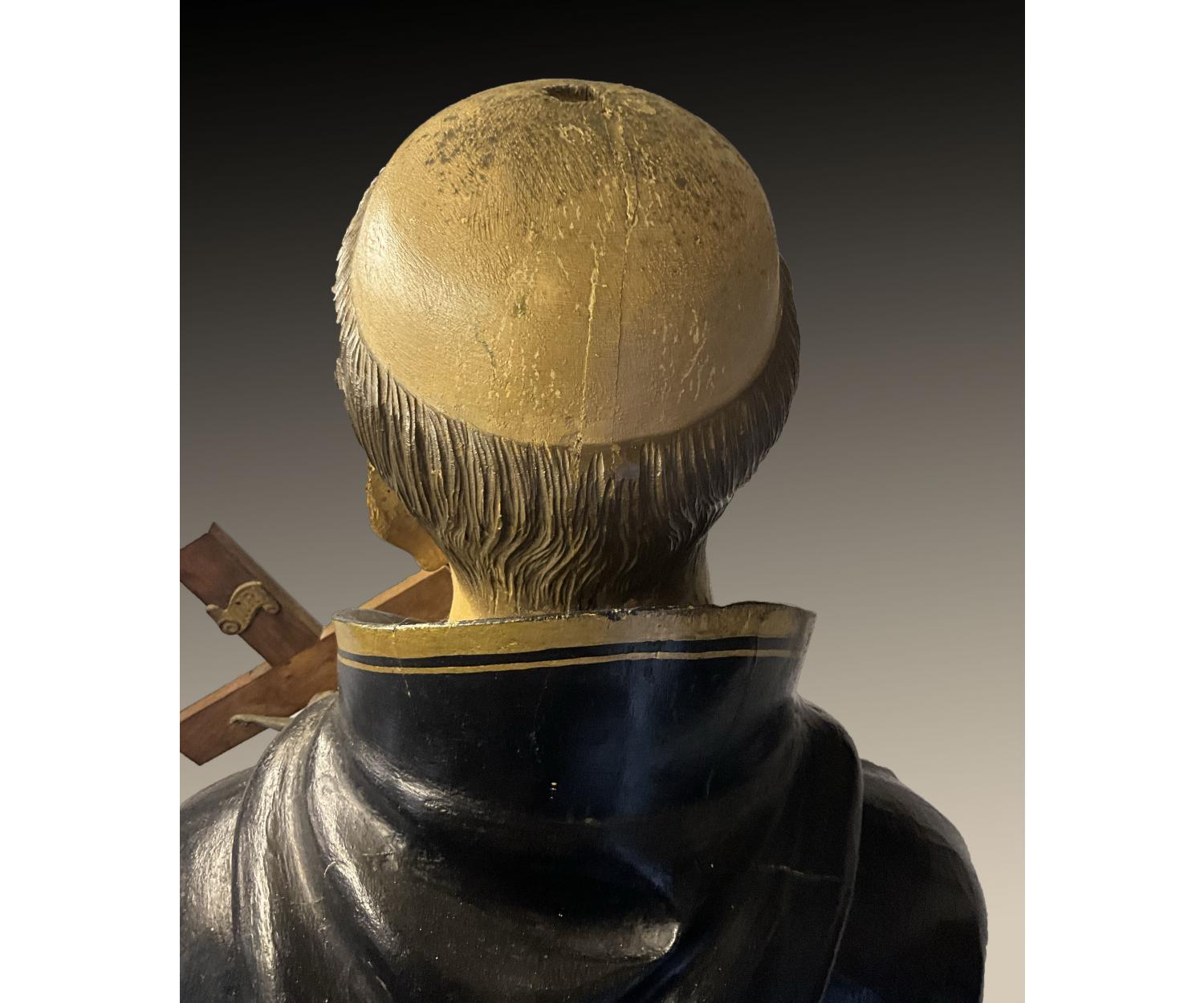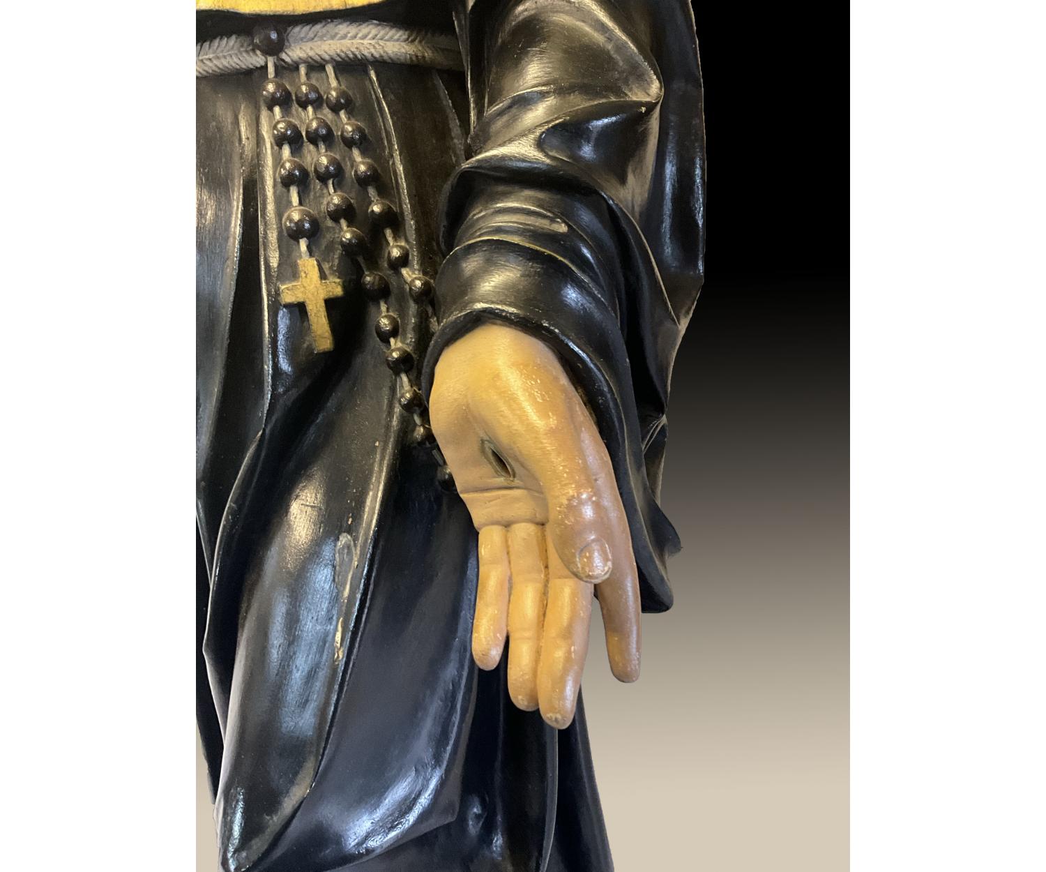 Offered for sale is this unusual large carved wooden religious figure of a man with cross wearing a black and gold robe with one foot on a globe. With stigmata to both hands. Height 145 cm width 52 cm depth 30 cm.