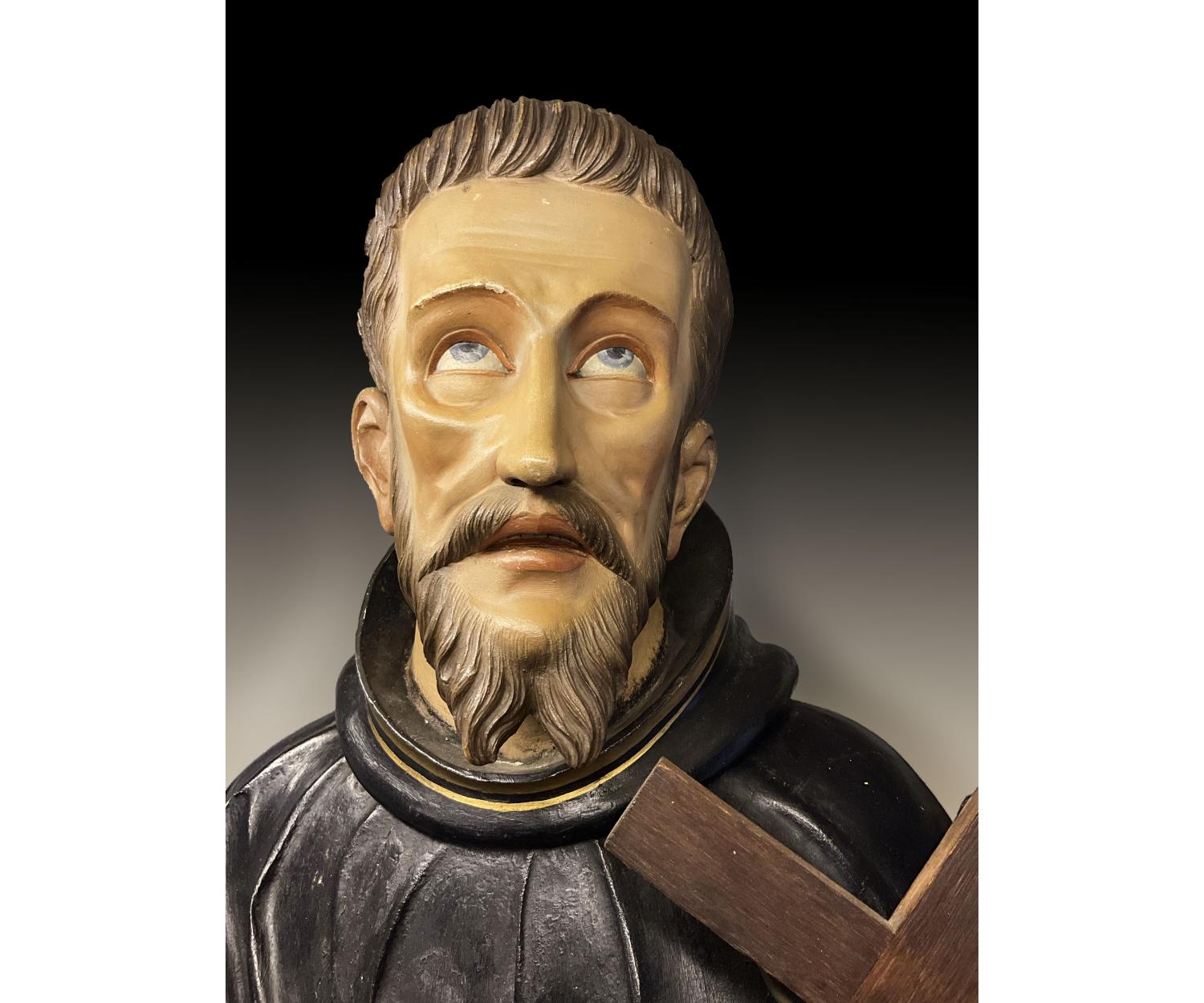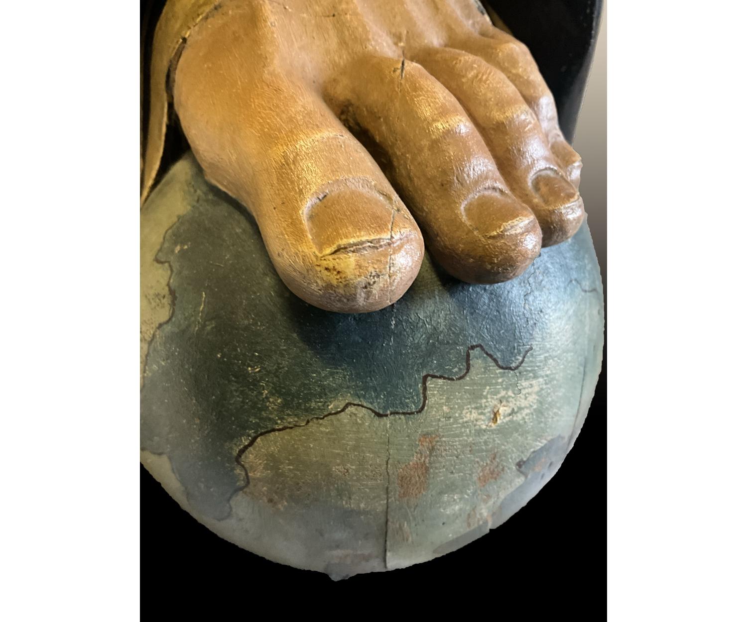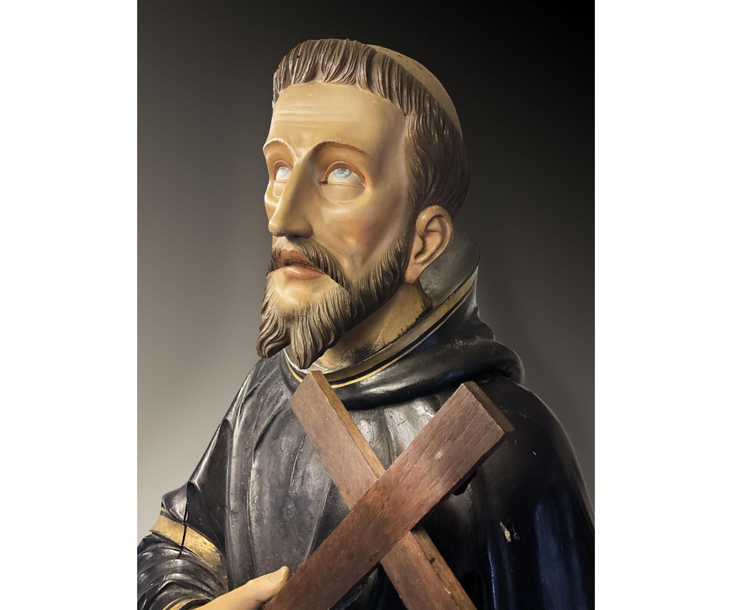 Offered for sale is this unusual large carved wooden religious figure of a man with cross wearing a black and gold robe with one foot on a globe. With stigmata to both hands. Height 145 cm width 52 cm depth 30 cm.