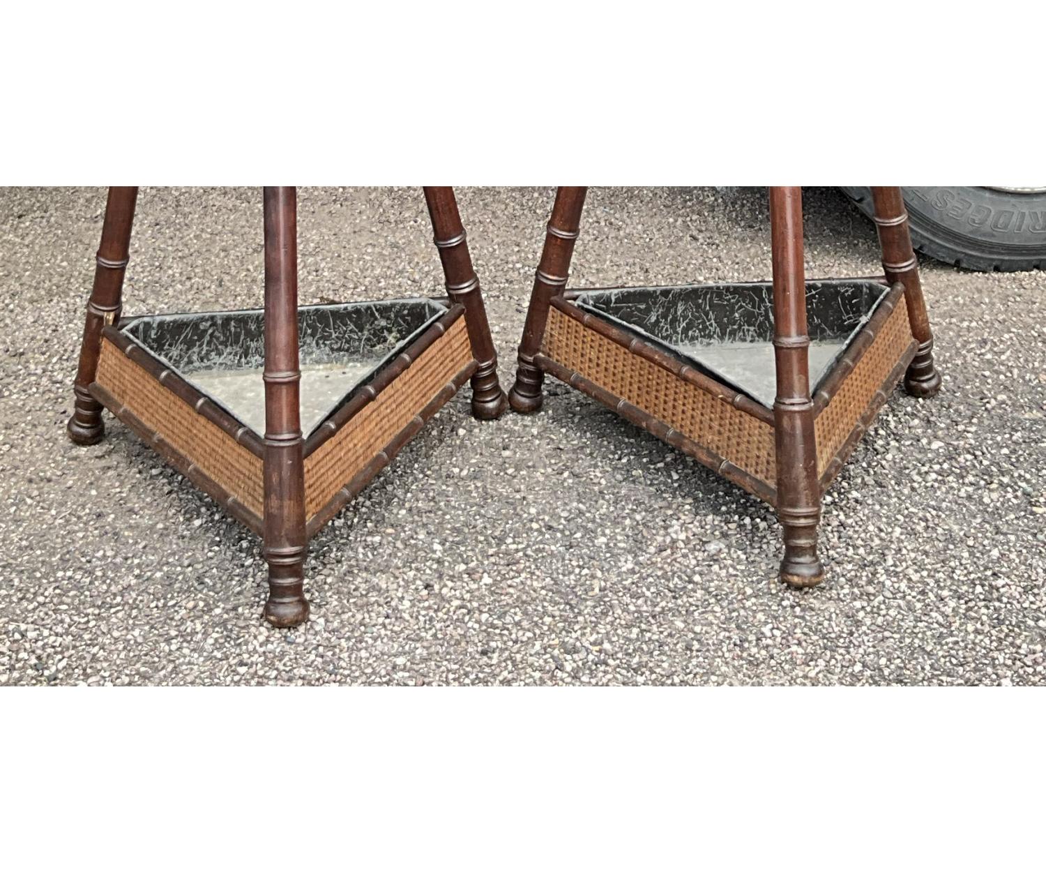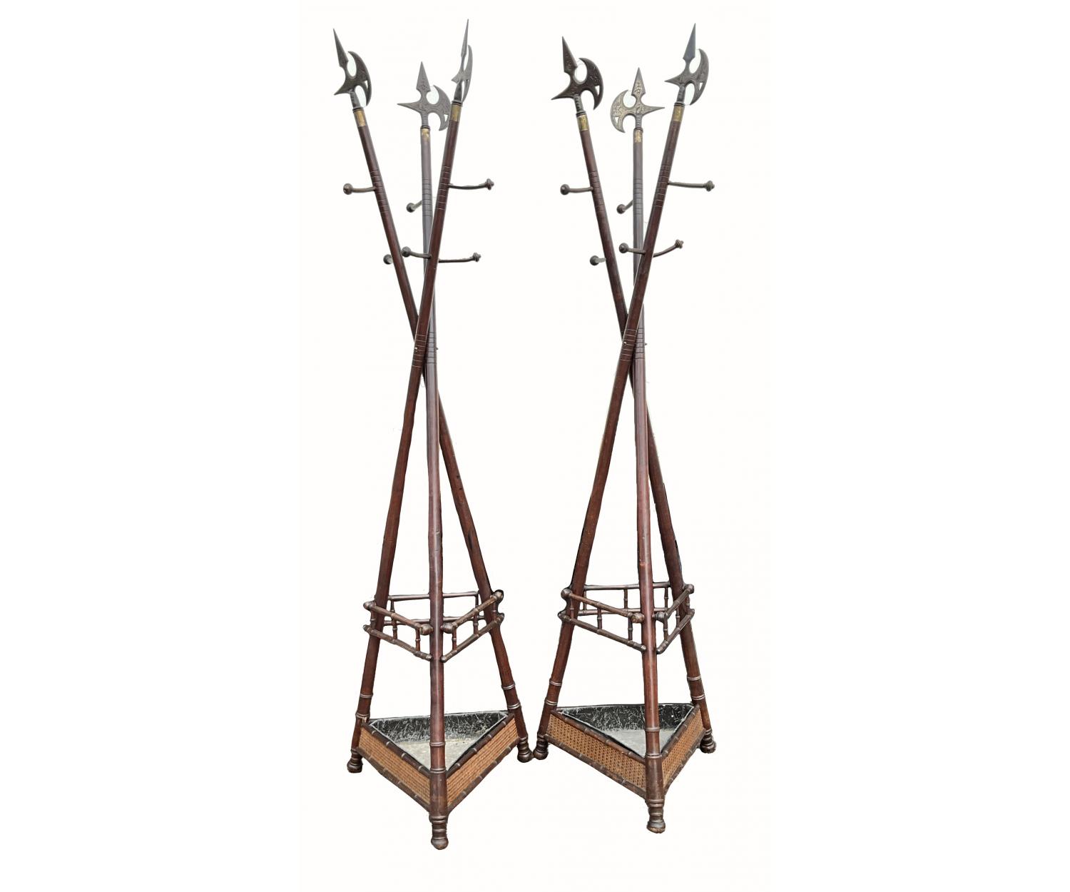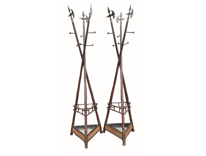 A very unusual pair of stick, hat and umbrella stands, each made from three medieval replica halberd polearms each pole with two hat - coat hooks, with nicely fitted metal drip tray with rattan style finish to the fronts. Of French origin and circa 1890. h.228cm X w.62cm X d.63cm. REF SA2487