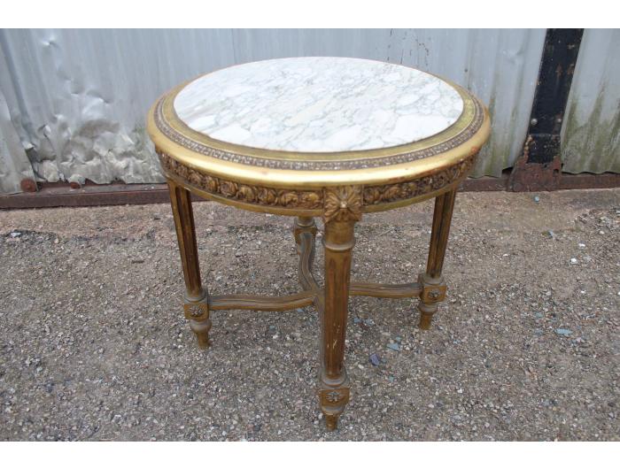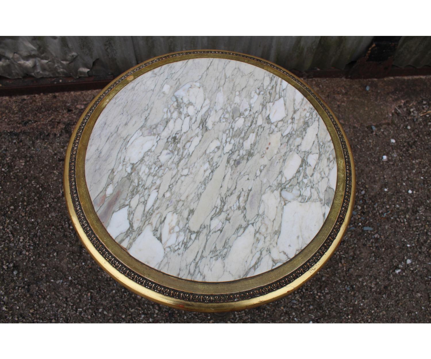 A round gilt Occasional Table with inset marble top, turned and fluted legs and shaped cross stretcher. Circa 1900