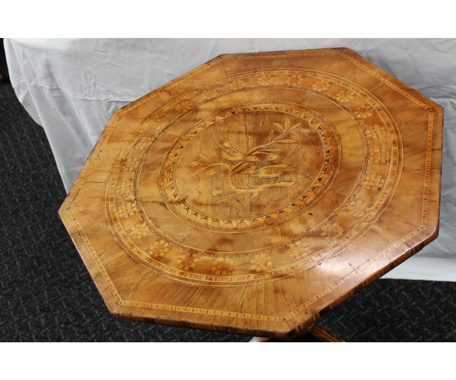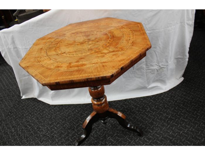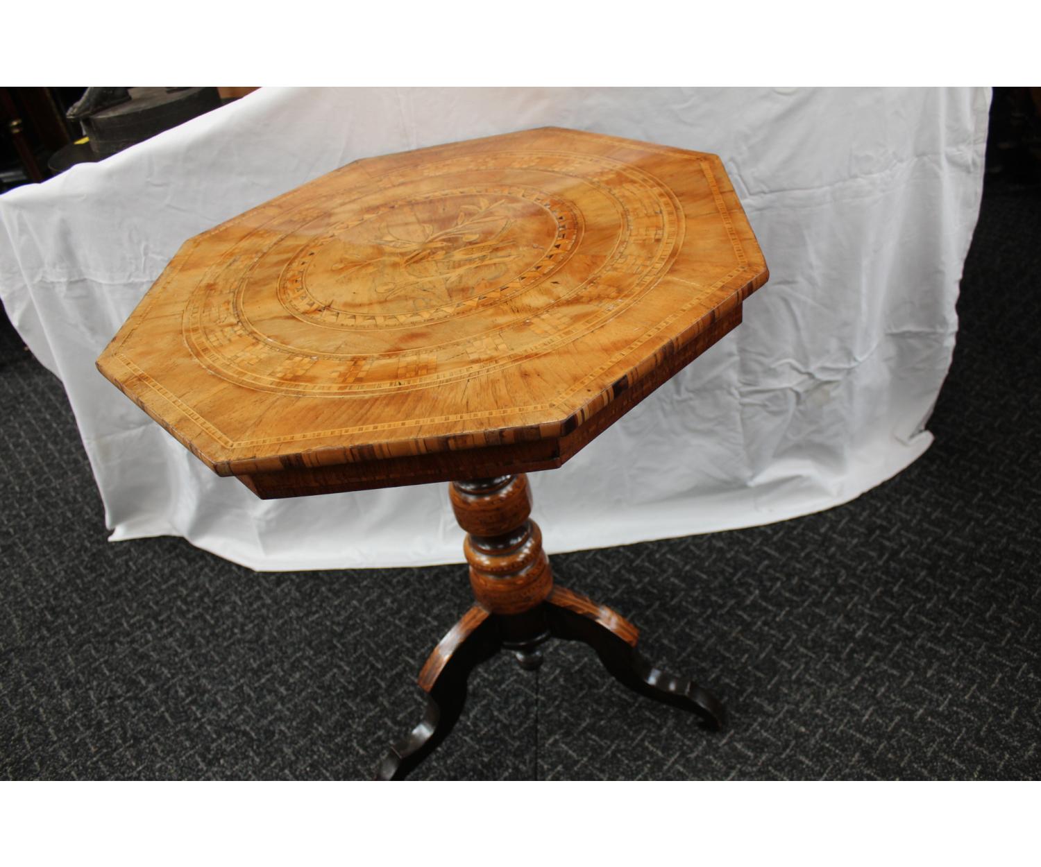 A Sorrento Table with octagonal top inlaid with birds, supported by turned inlaid central column and stands on three splayed legs. Circa 1890