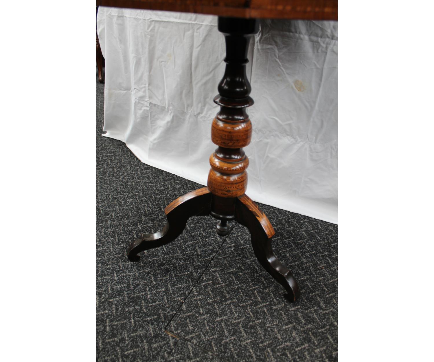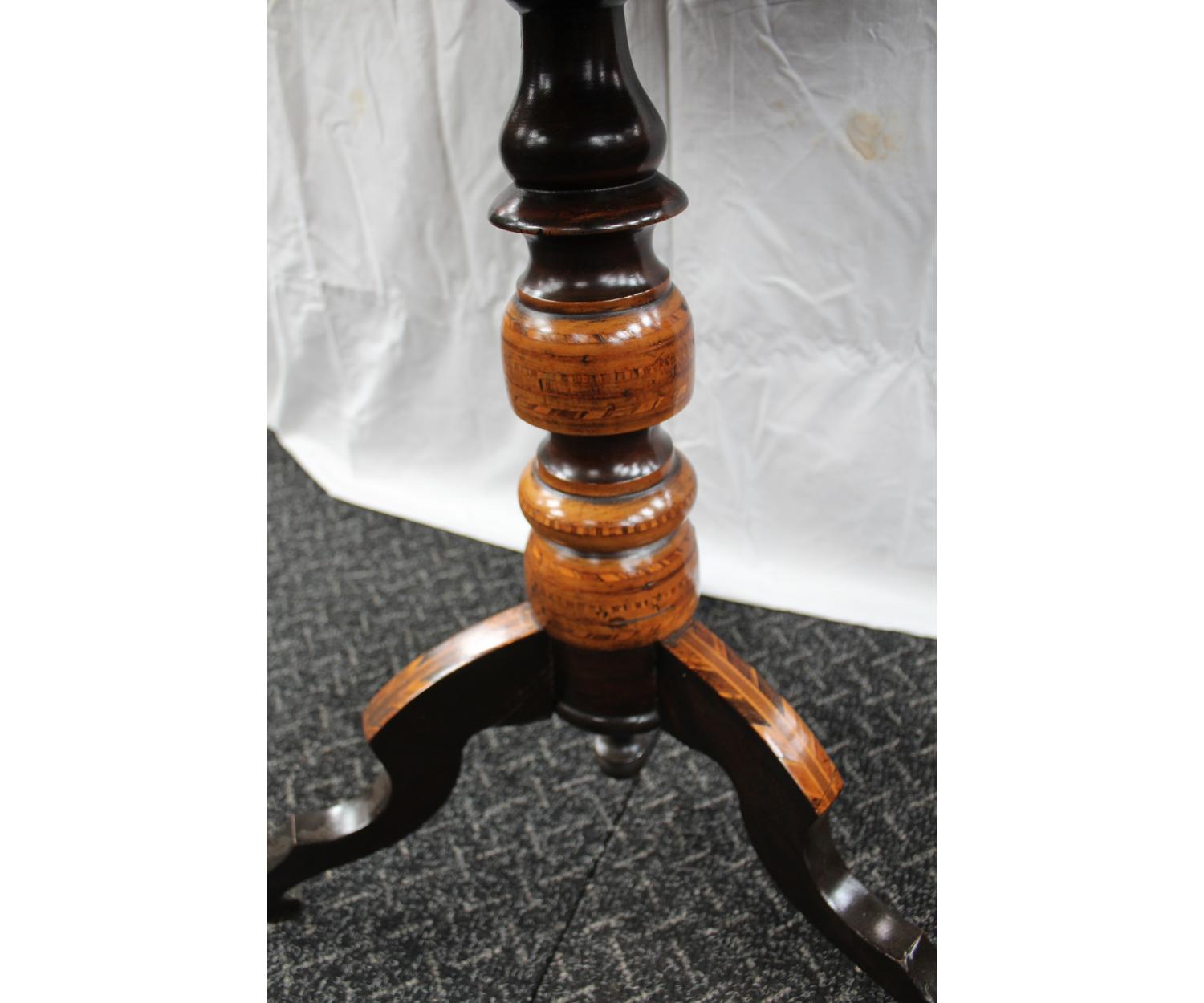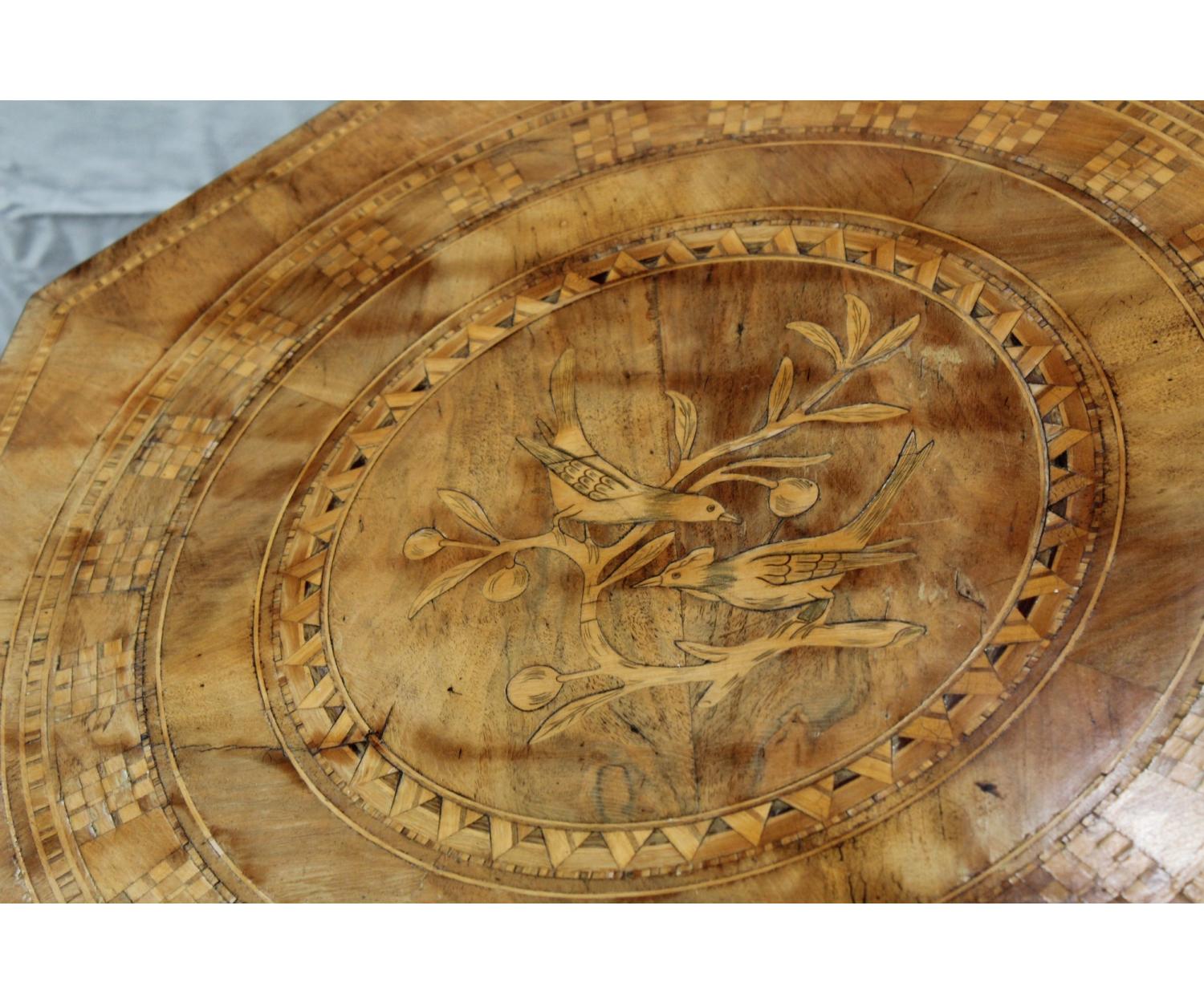 A Sorrento Table with octagonal top inlaid with birds, supported by turned inlaid central column and stands on three splayed legs. Circa 1890