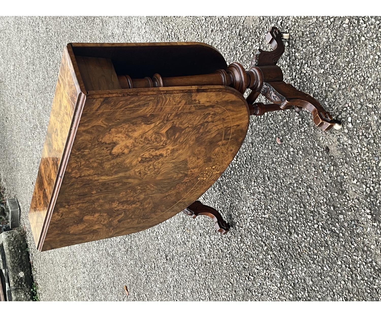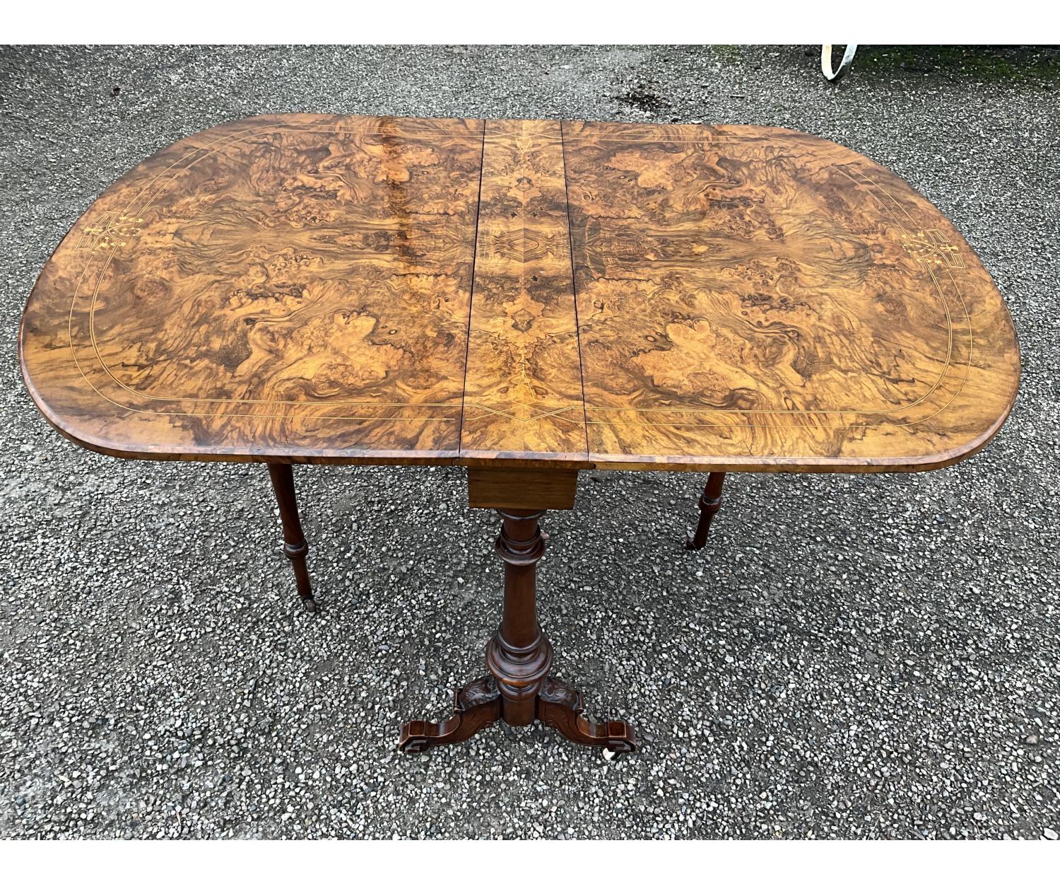 With its intricate detailing and inlay adding to its stylish design, this table is sure to impress any visitor. The perfect combination of form and function, it offers ample space for dining, displaying decorative items, or even using as a work table, folding to a tiny 13cm width at its smallest it’s a real space saver. Whether you're a collector of antique furniture or simply looking for a unique piece to add to your home, this Victorian Sutherland Table is sure to exceed your expectations. A Superior quality table. English Circa 1875.