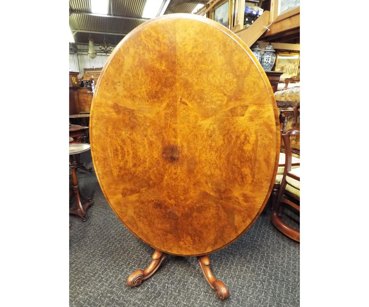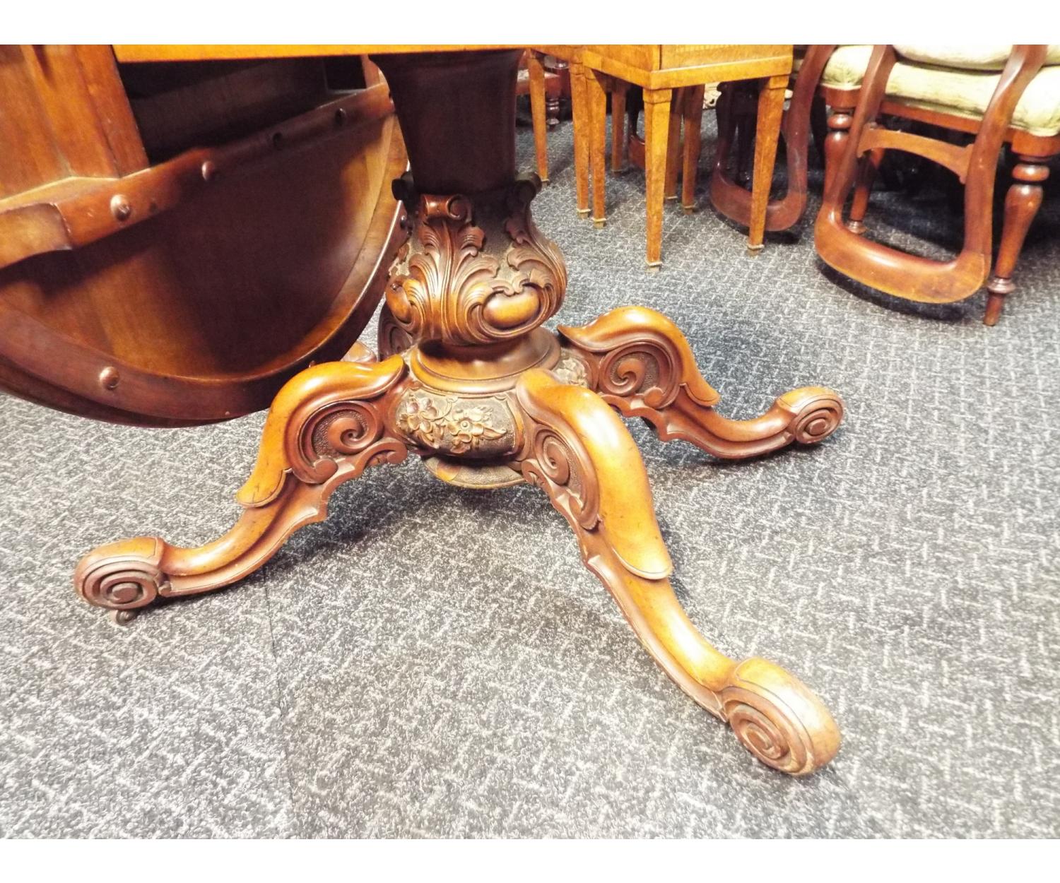 Walnut oval Looe Table. Top has quartered vaneers, base has carved central column and four splayed legs. Circa 1860