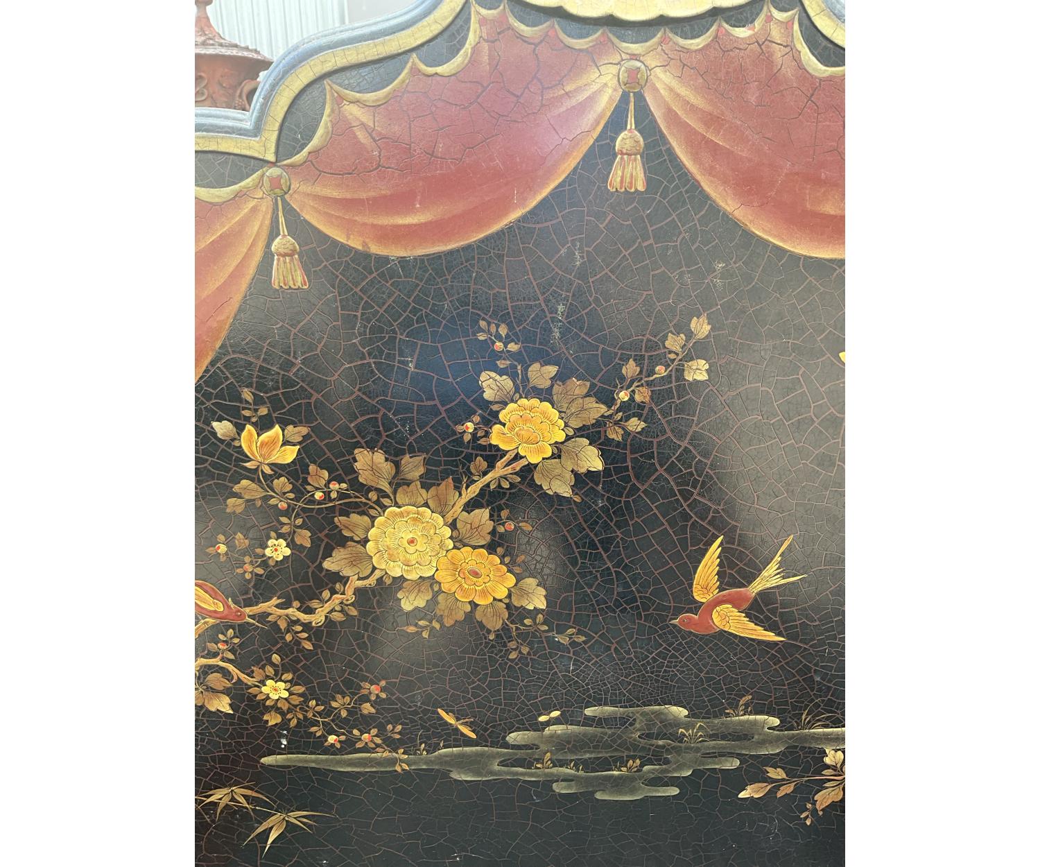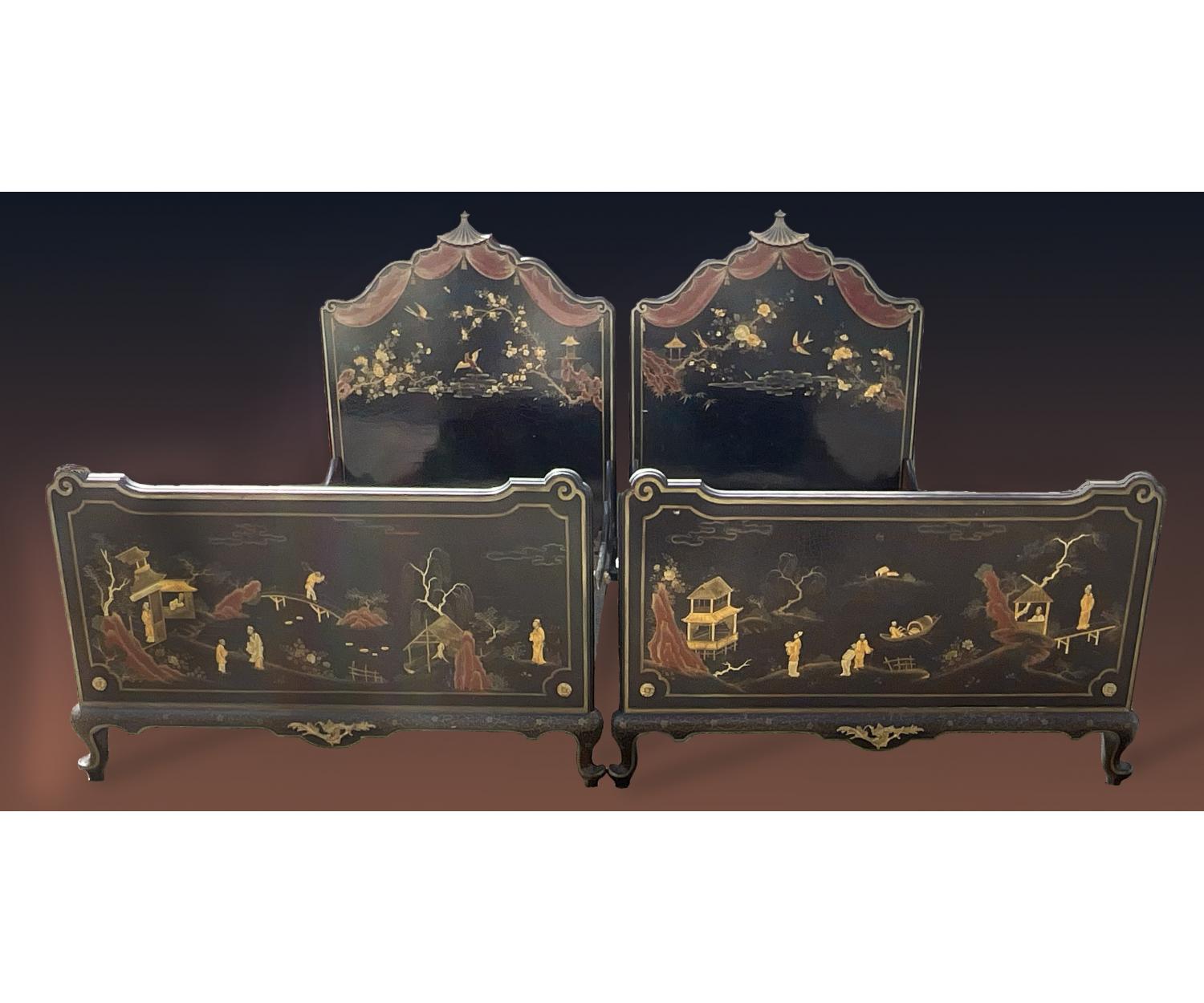A pair of beautifully decorative and colourful continental single beds in Japanese taste. Stamped G.V.Pillinini. Lacquered with attractive chinoiserie details. Dimensions inside W 116cm x 200cm (3'10'' x 6'6'') Outside to outside 130cm x 211cm.