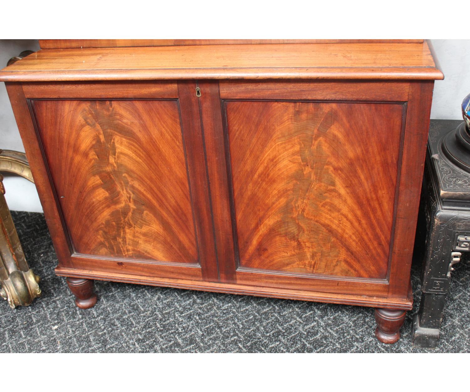 A Mahogany Bookcase. Top has two glazed doors and three fitted shelves. Base has a lift out two panel door enclosing two banks of six graduated drawers, Circa 1860