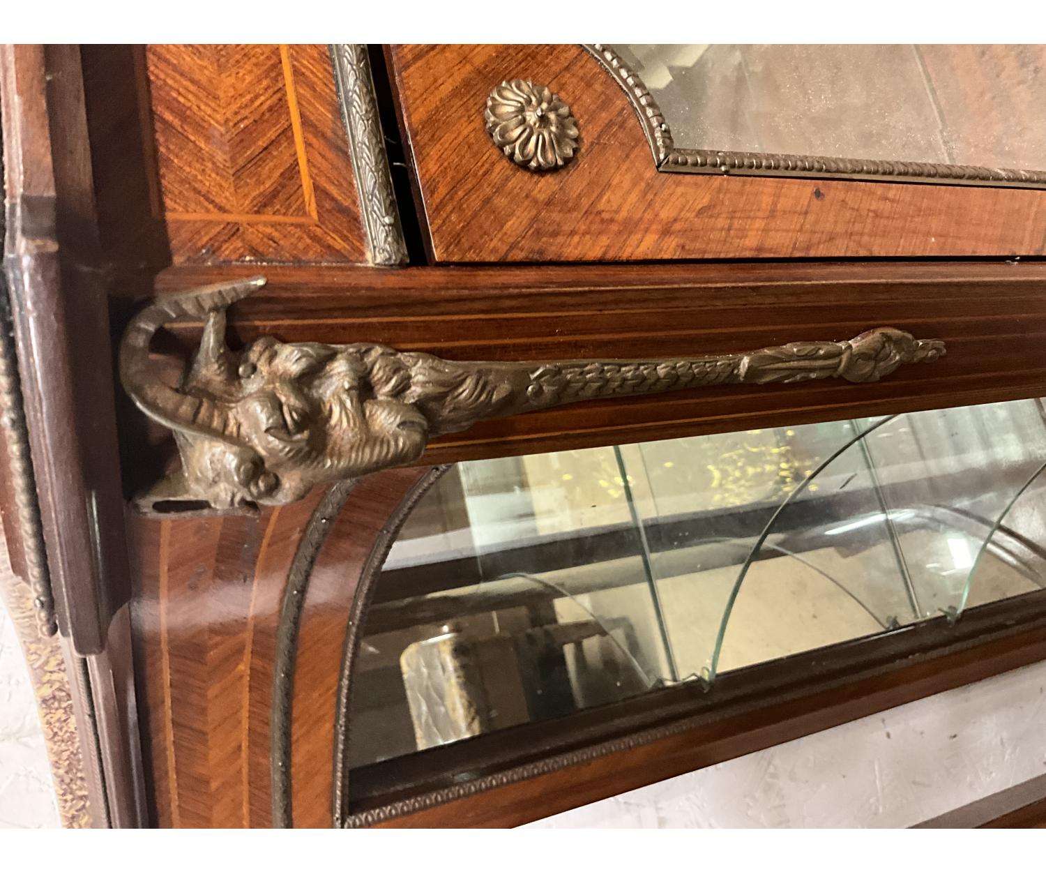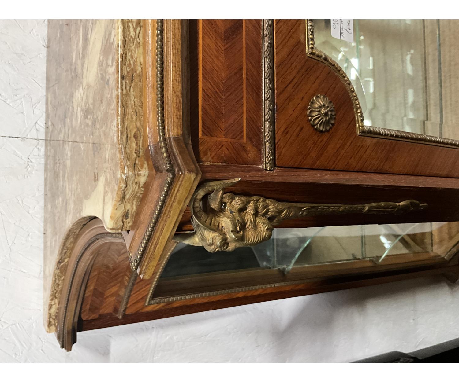 This pair of glazed display cabinets in Kingwood with inlaid stringing are a stunning addition to any room adding some French chic with their classical elegance. With a history dating back to the late 19th early 20th century, these cabinets are a true antique gem. The gracefully carved marble top and glazed finish add a touch of style that is sure to catch the eye of anyone who enters the room each cabinet with a duo of glass shelves. The feet, legs and corners are shielded by brass mounted details including fancy brass rams heads.