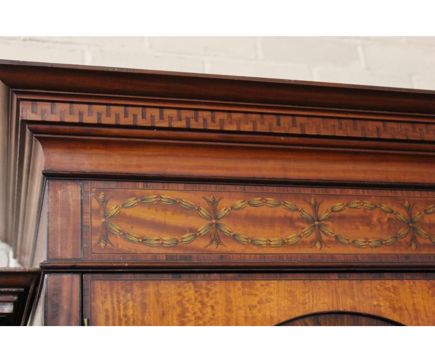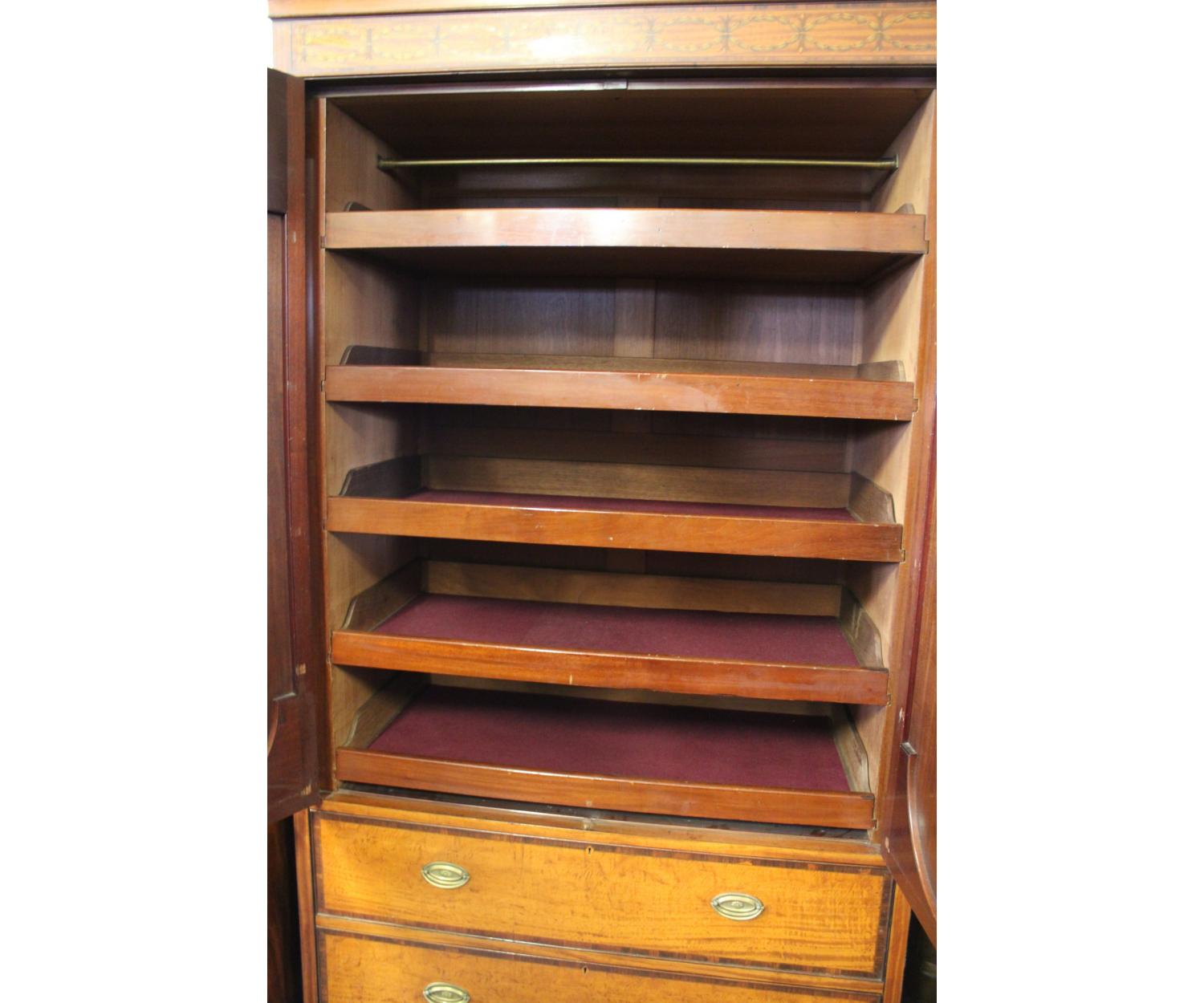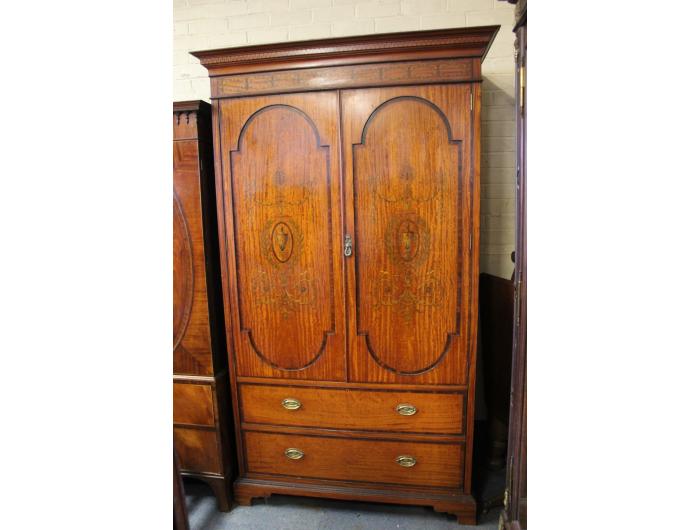 A very nice quality Inlaid Satinwood Linen Press. Has inlaid panel doors enclosing five sliding shelves over two long drawers. English. Circa 1890