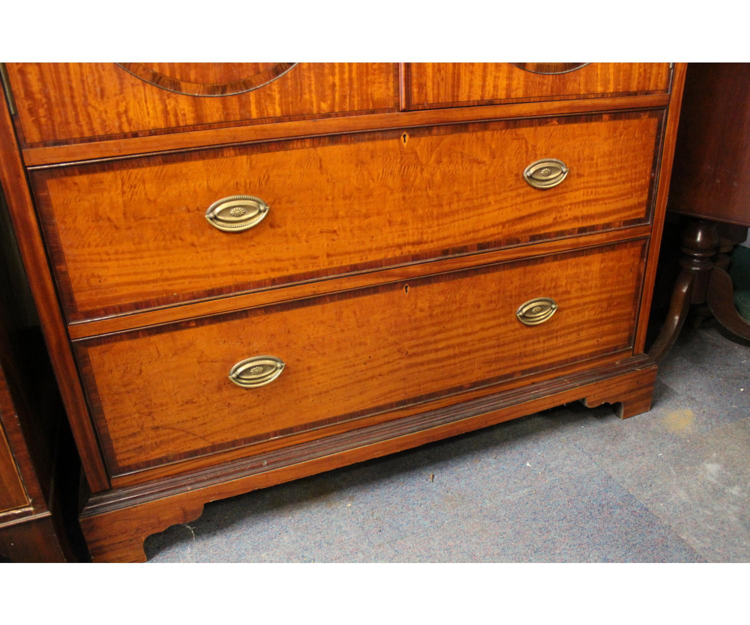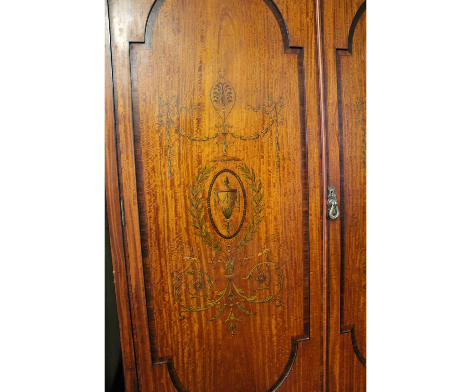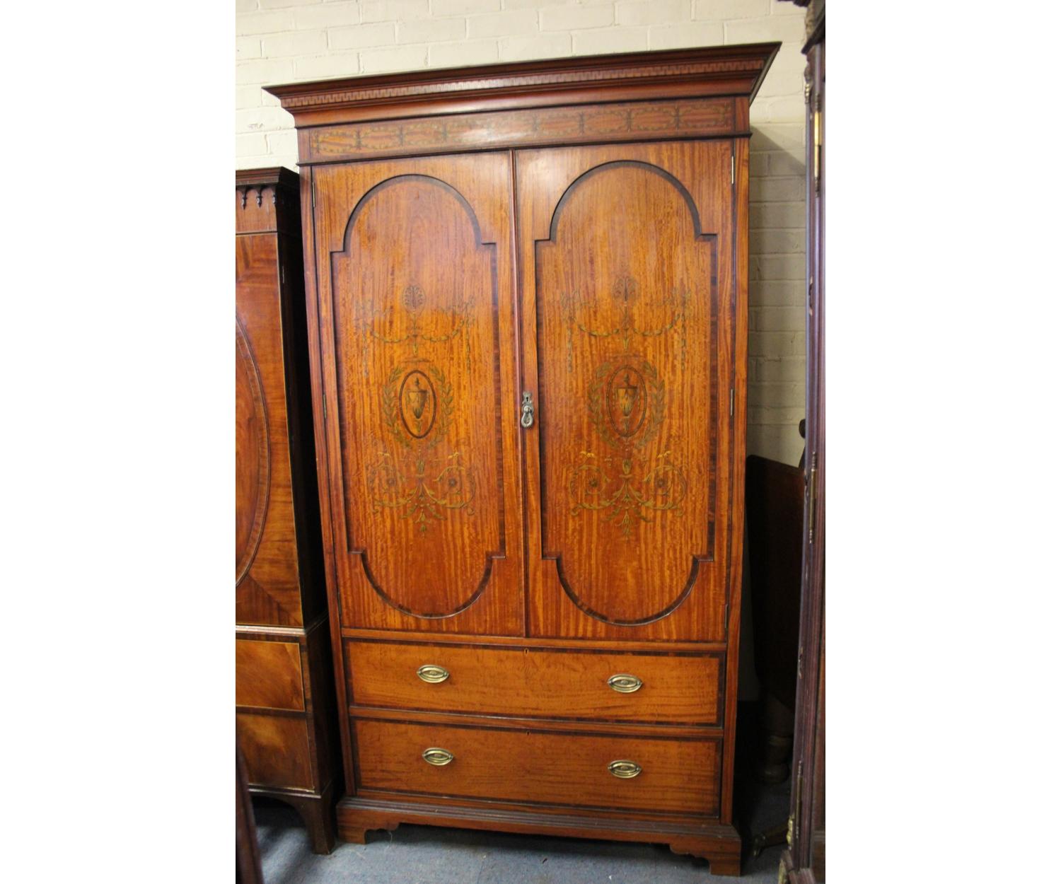 A very nice quality Inlaid Satinwood Linen Press. Has inlaid panel doors enclosing five sliding shelves over two long drawers. English. Circa 1890