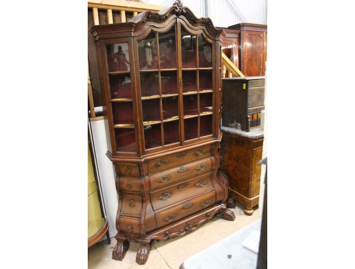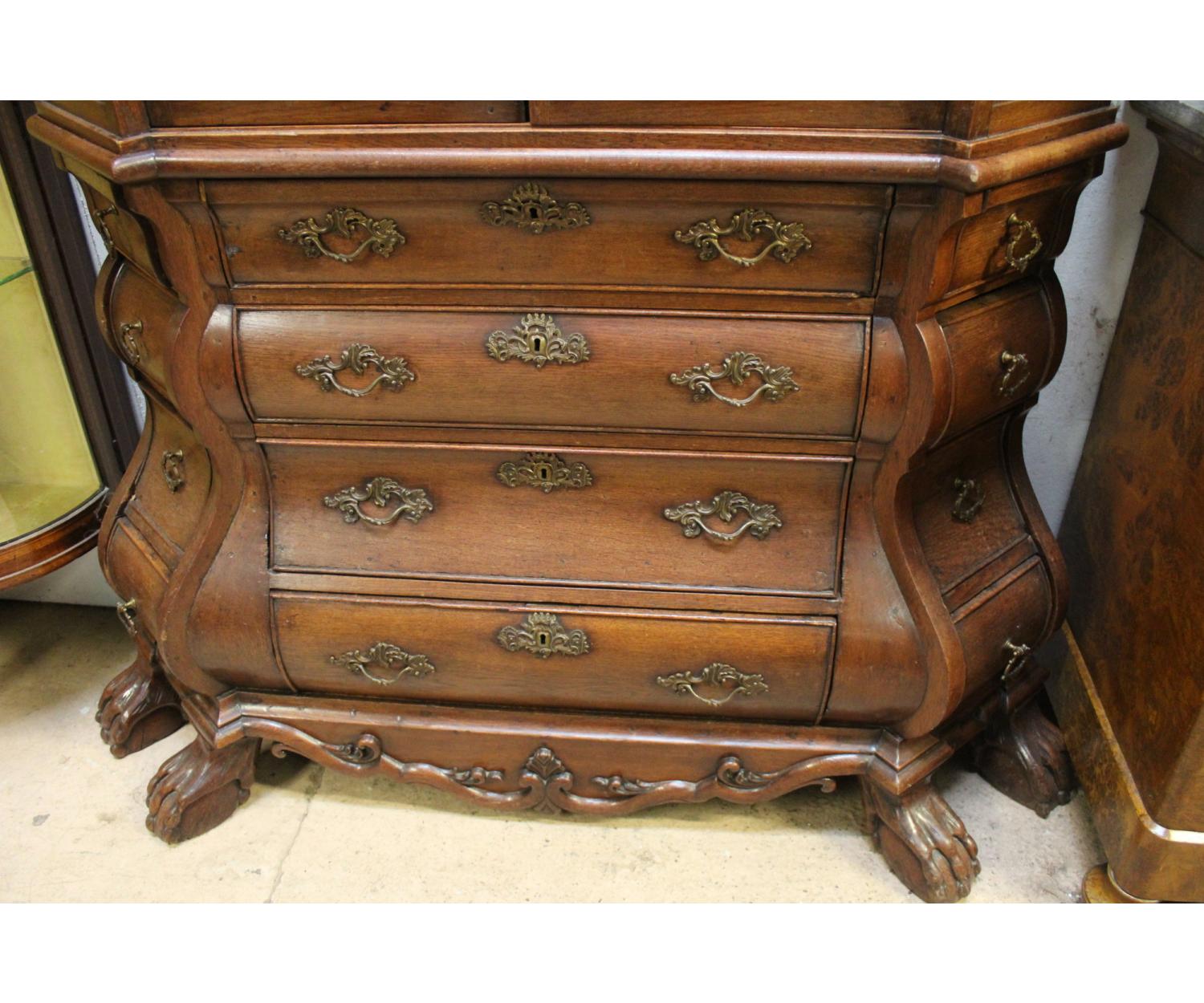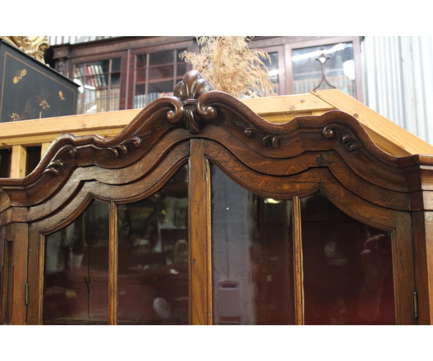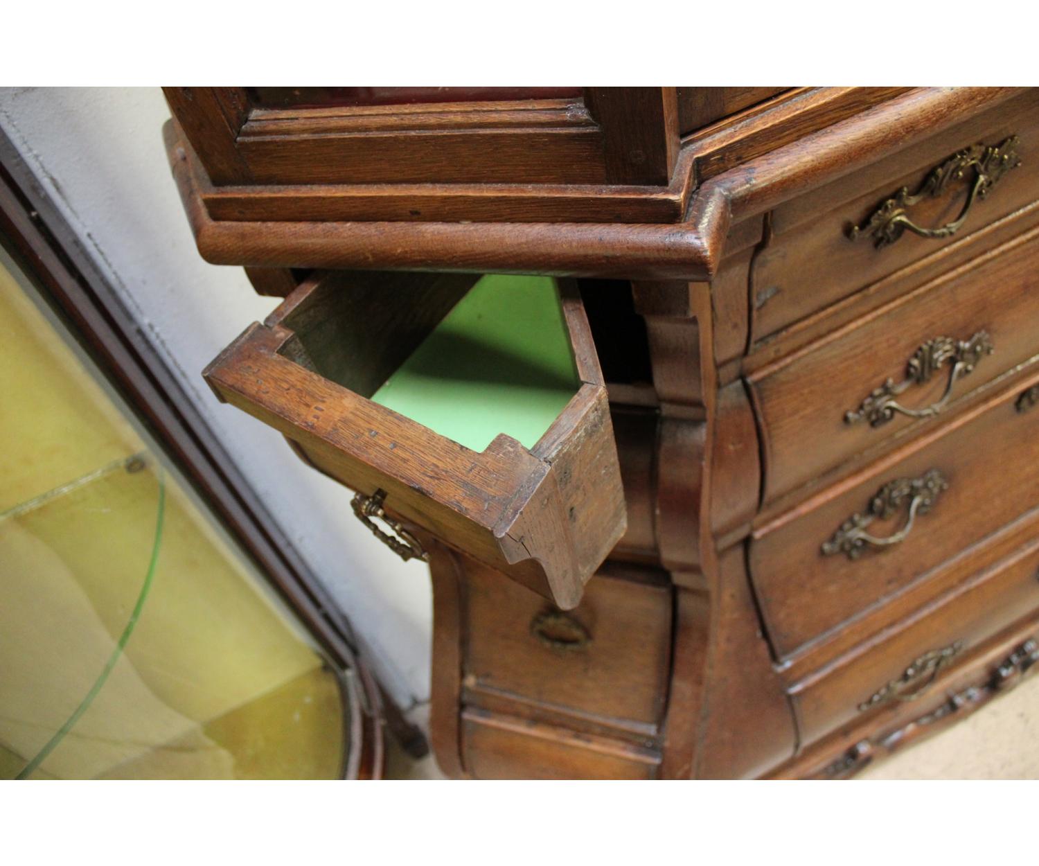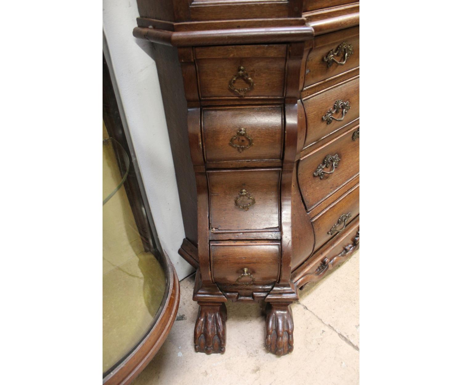 Dutch Oak Vitrine. Has a panelled glazed top, base has four graduated drawers flanked by four graduated corner drawers. Stands on paw feet. In need of slight restoration. Circa 1780