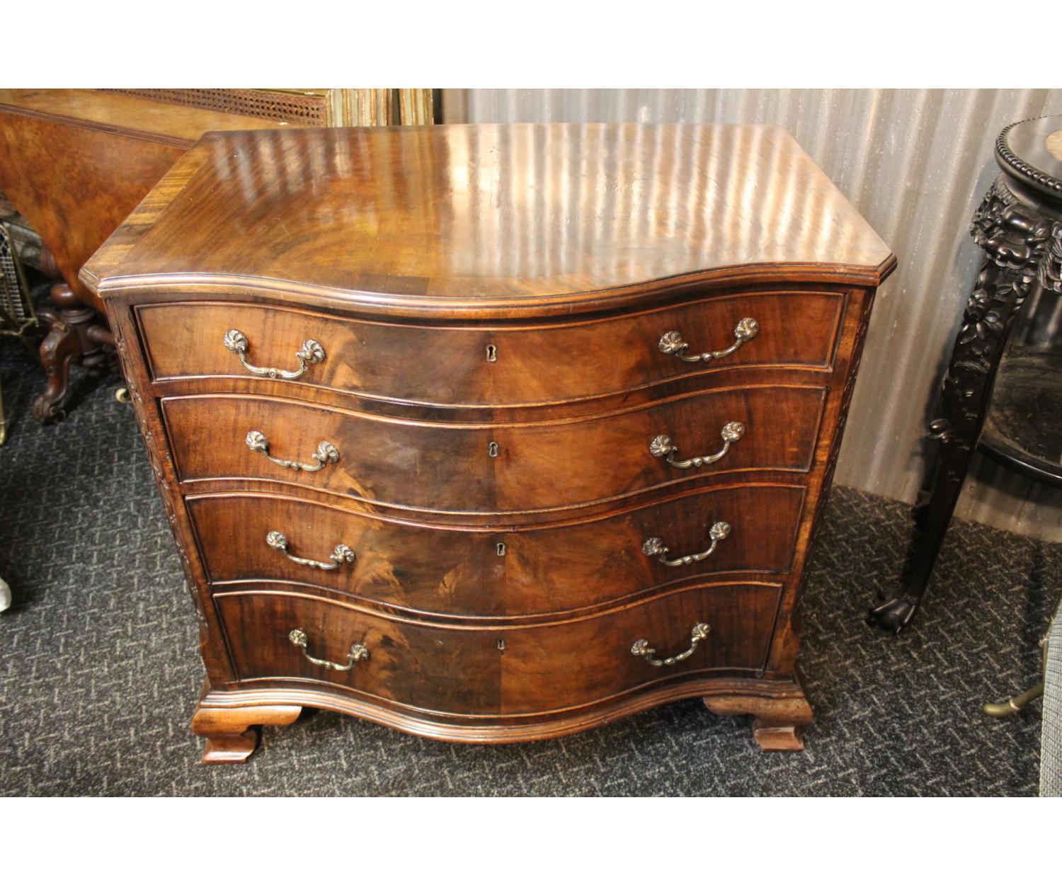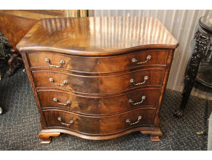 Mahogany Serpentine Chest of four long graduated drawers. Has cross banded top, canted corners and stands on bracket feet. Circa 1900