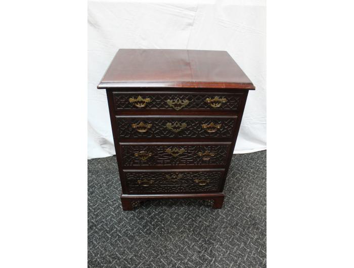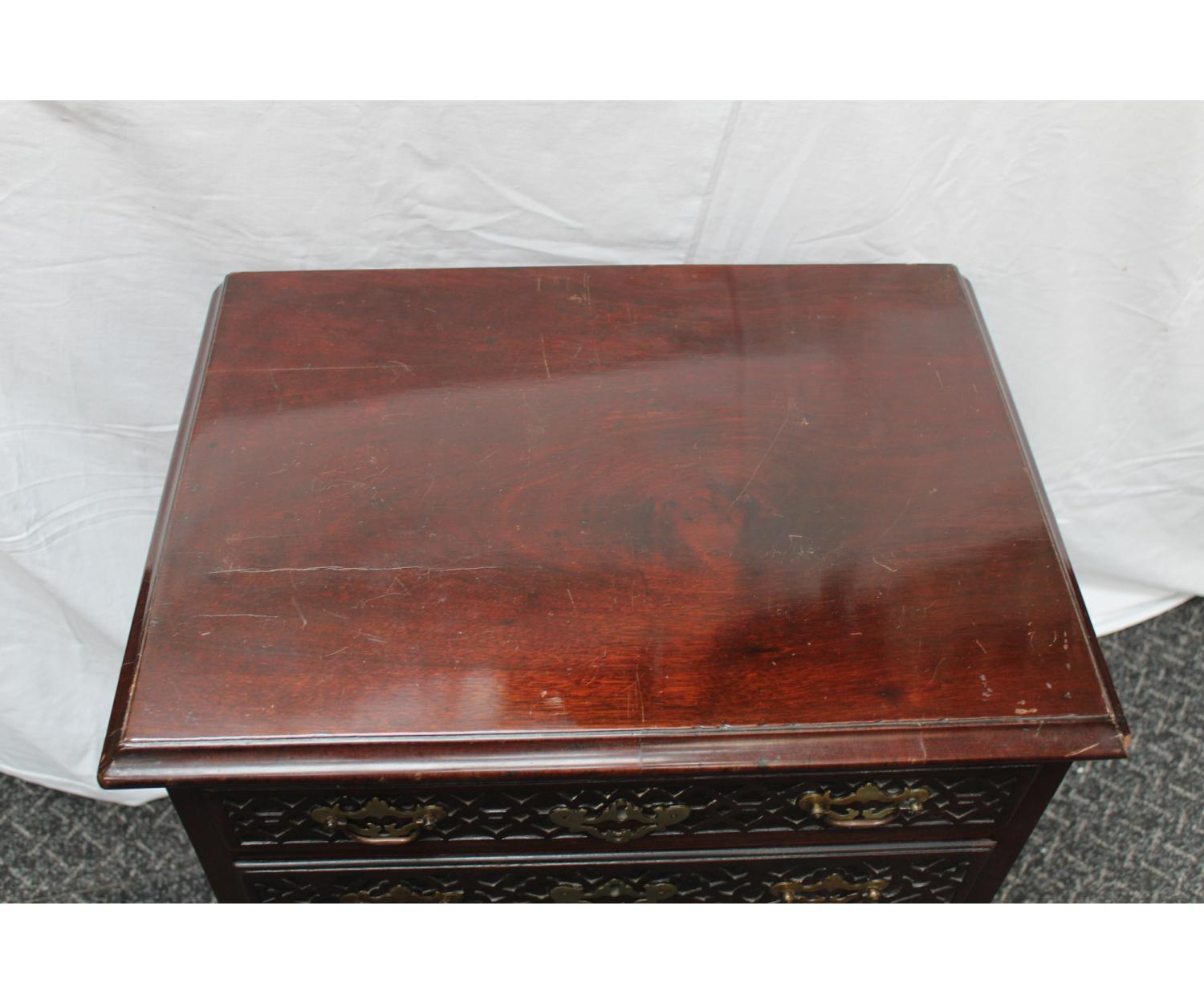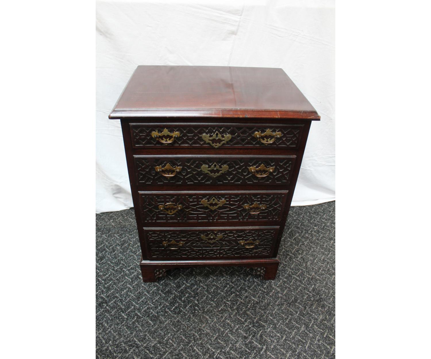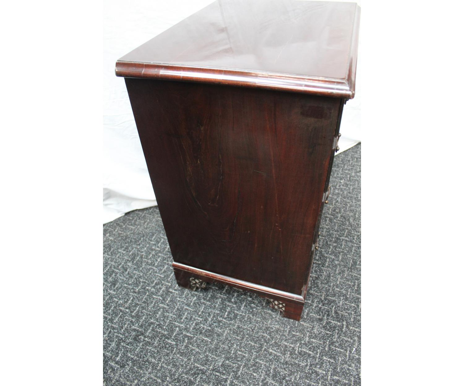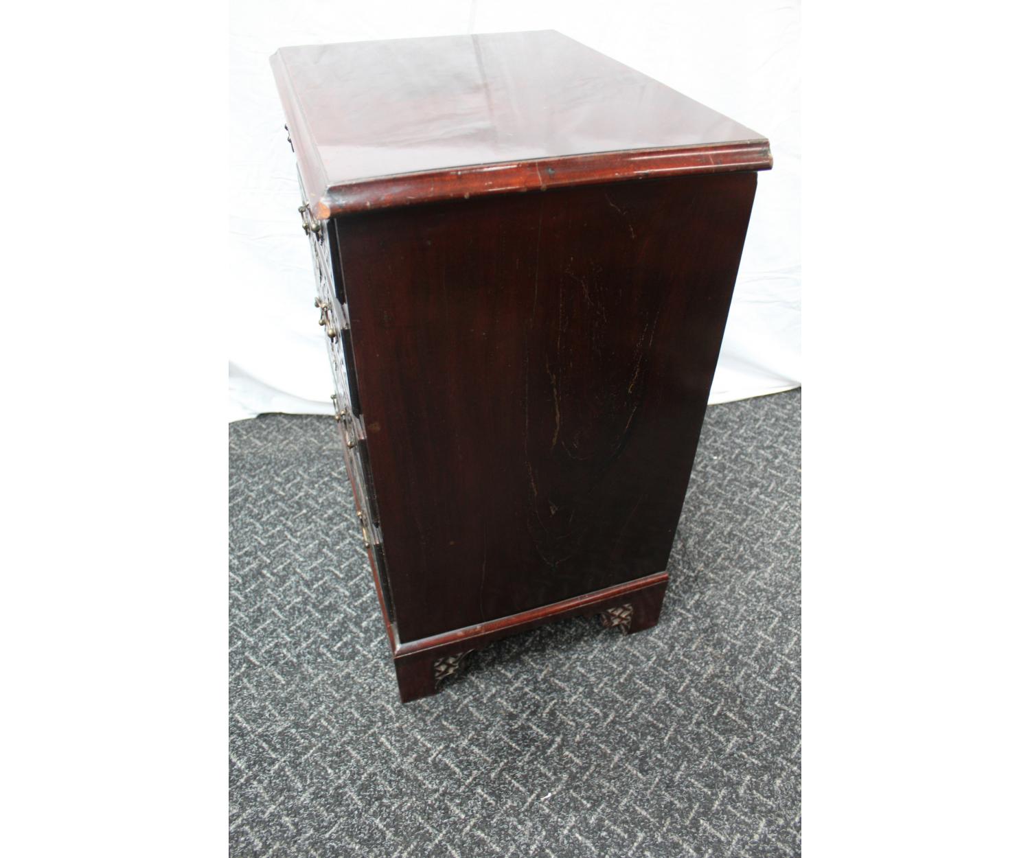 A small Mahogany Georgian Style Chest. Has four drawers with blind fretwork fronts and fretwork forming the bracket feet. English. Circa 1880