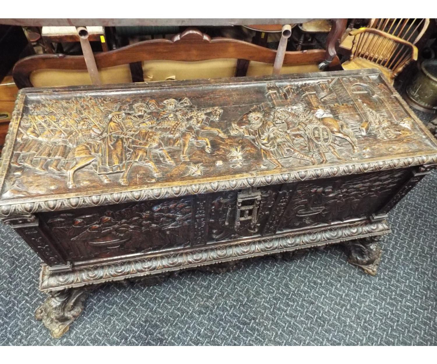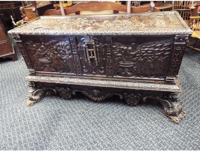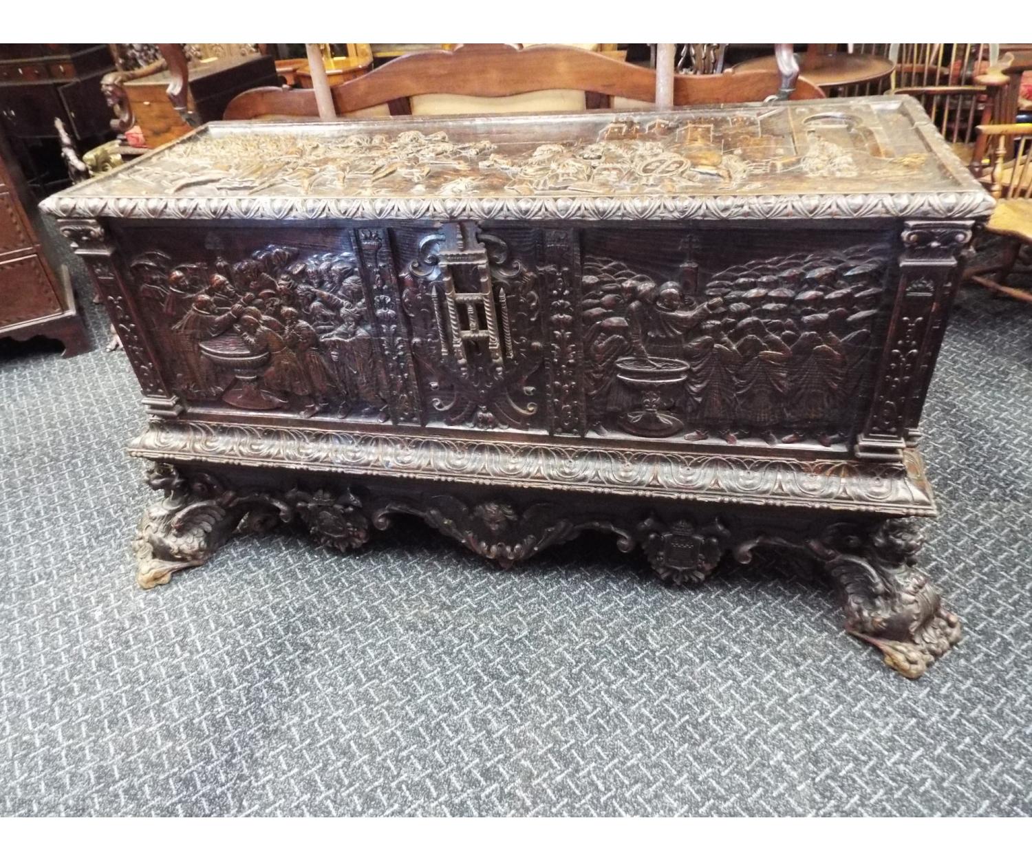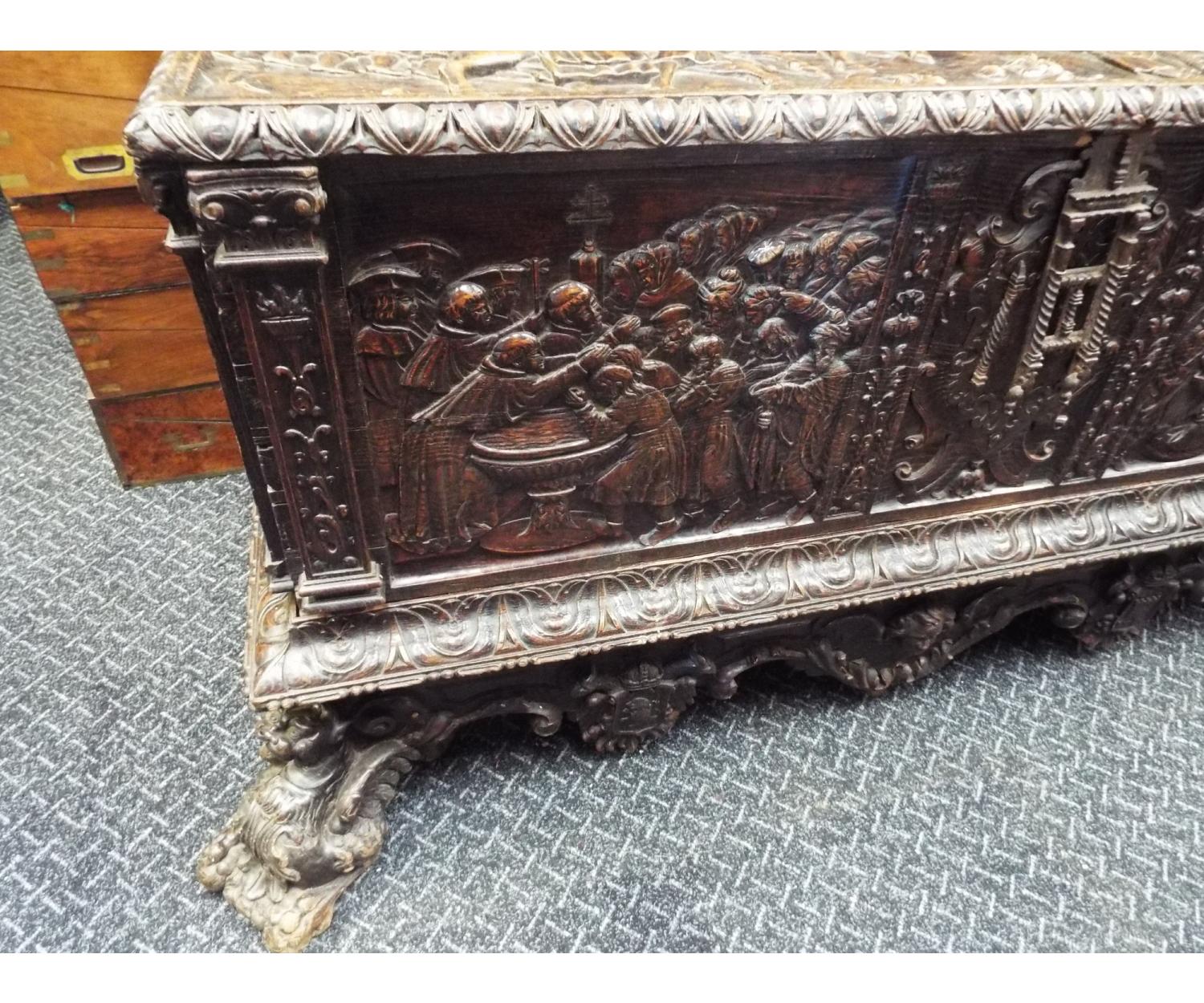 A carved chestnut cassonne. 19th century in a 17th century style. French