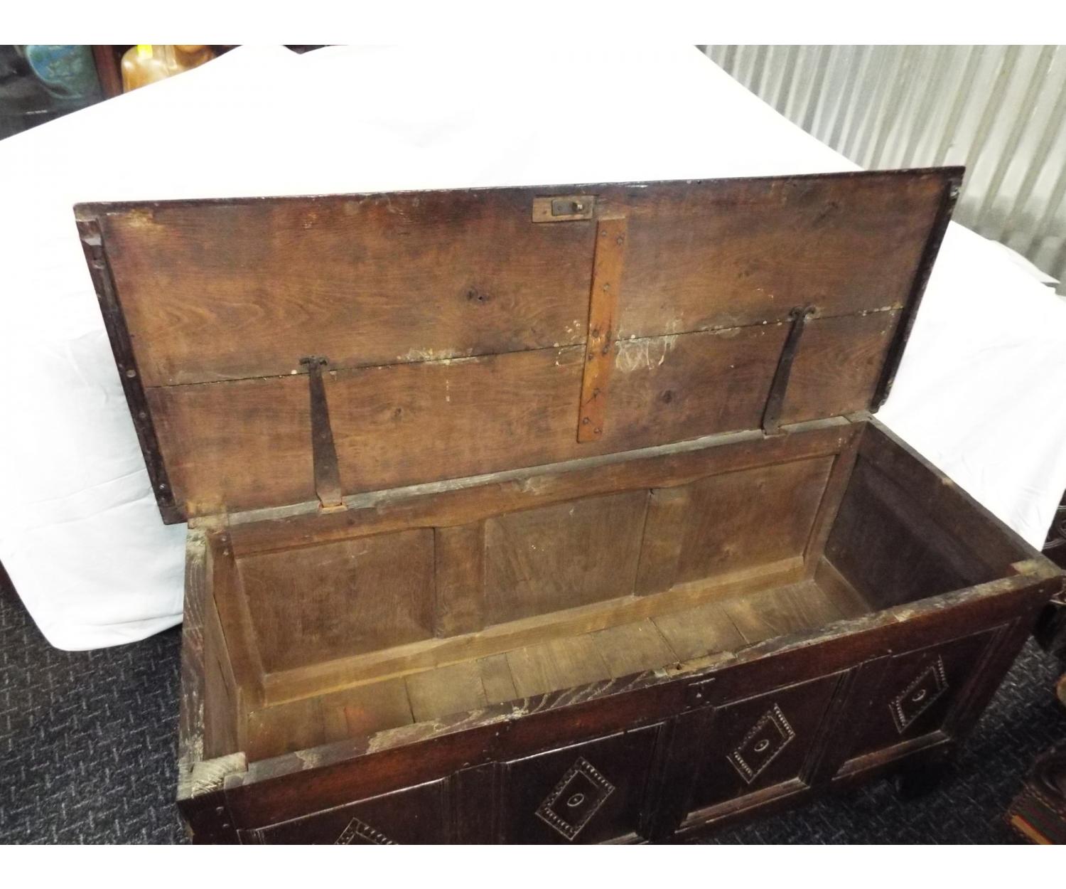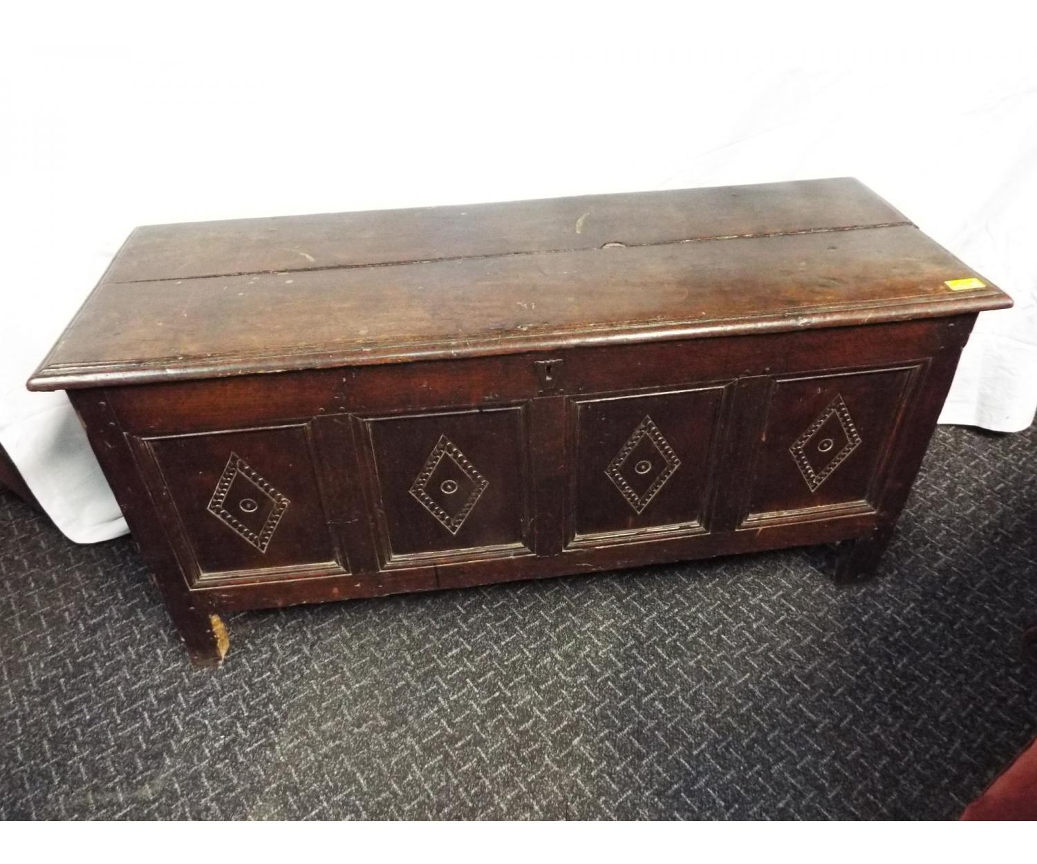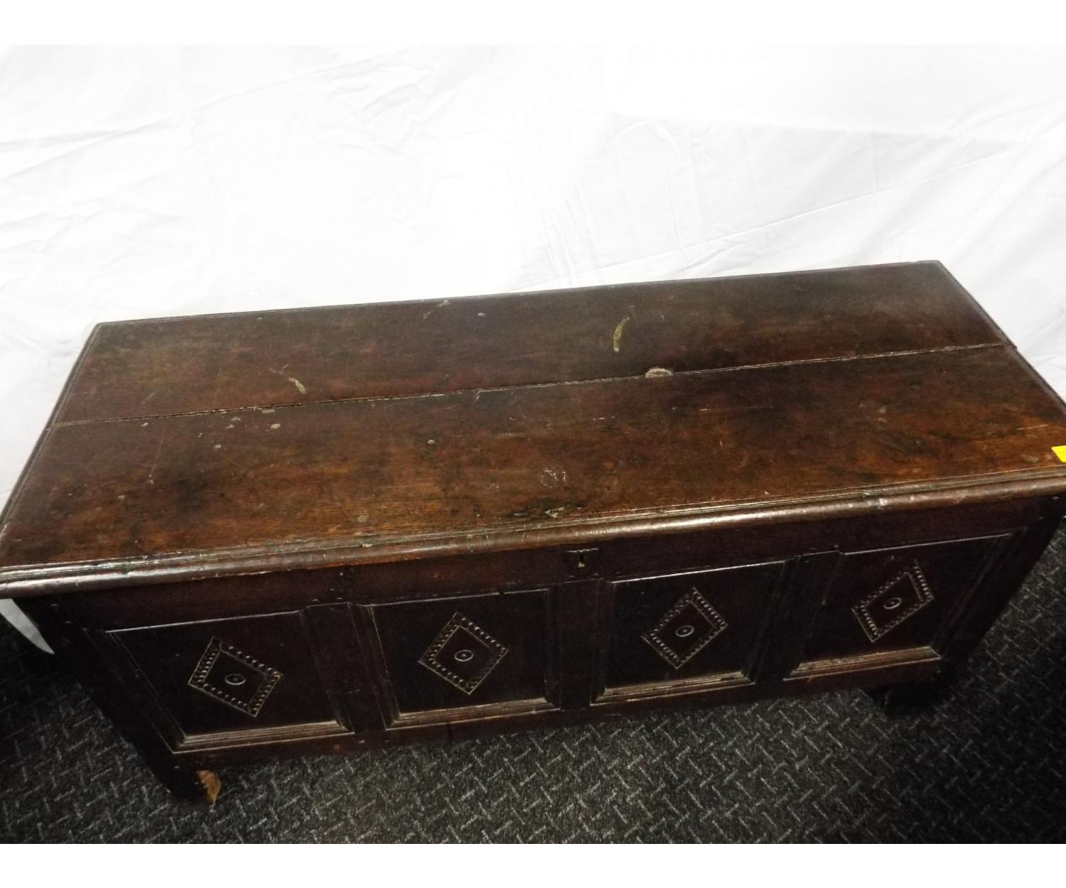 Oak coffer four carved panels to the front and plain panel sides, Circa 1680