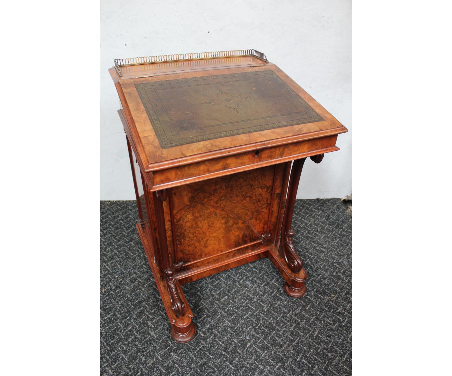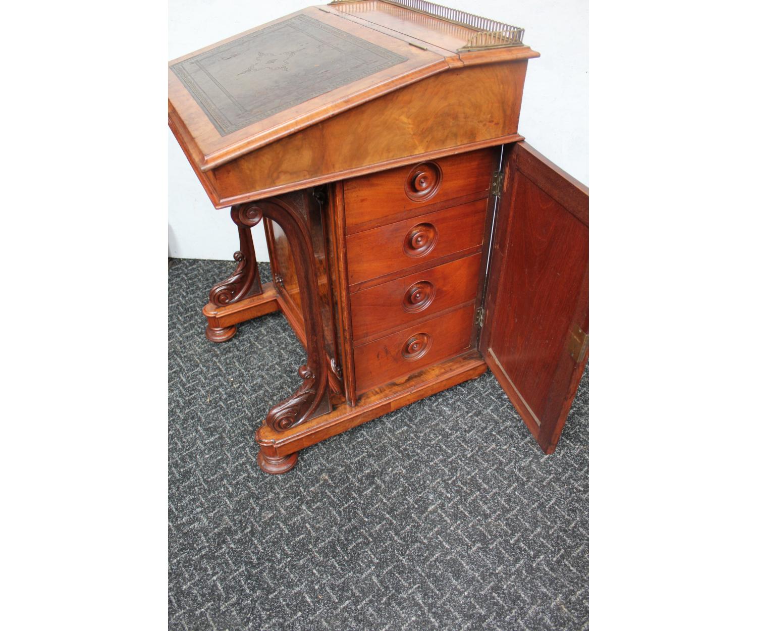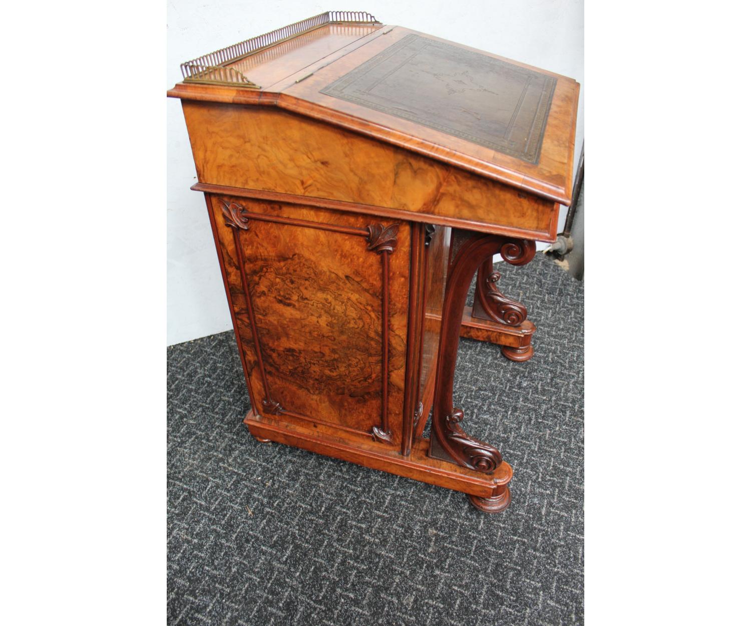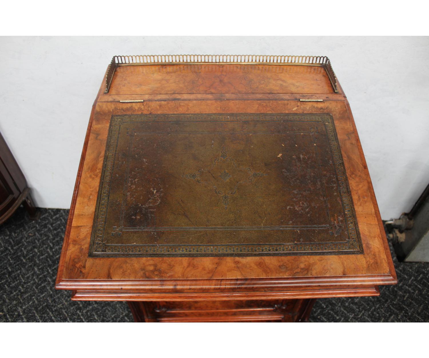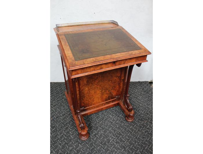 A Walnut Davenport. Has inset leather and brass gallery. To the right hand side four graduated drawers behind panelled door. Circa 1870