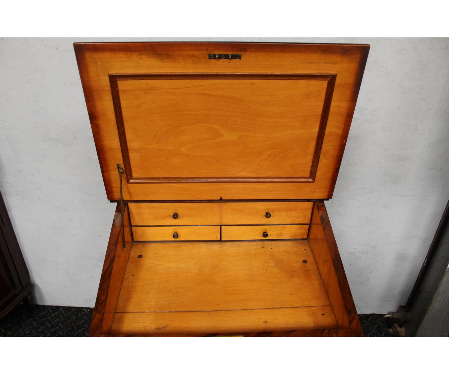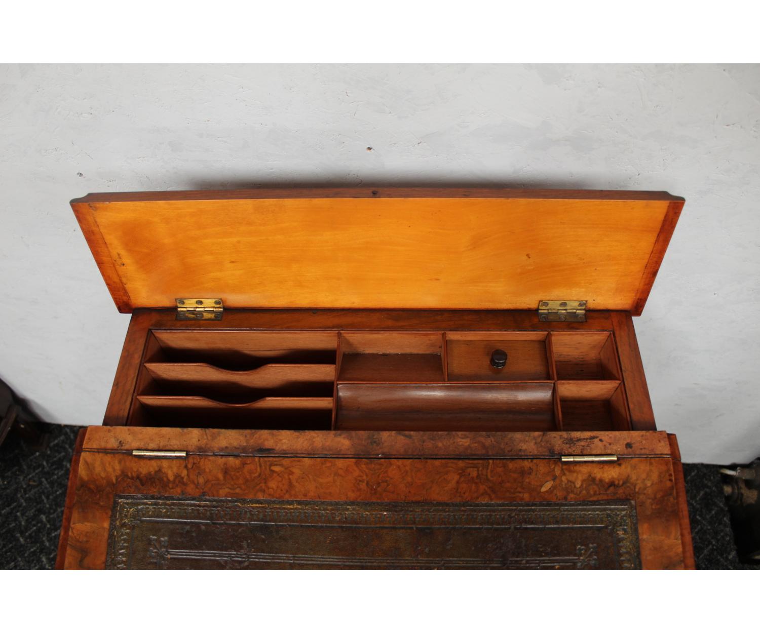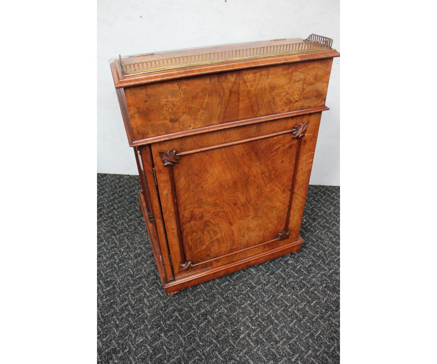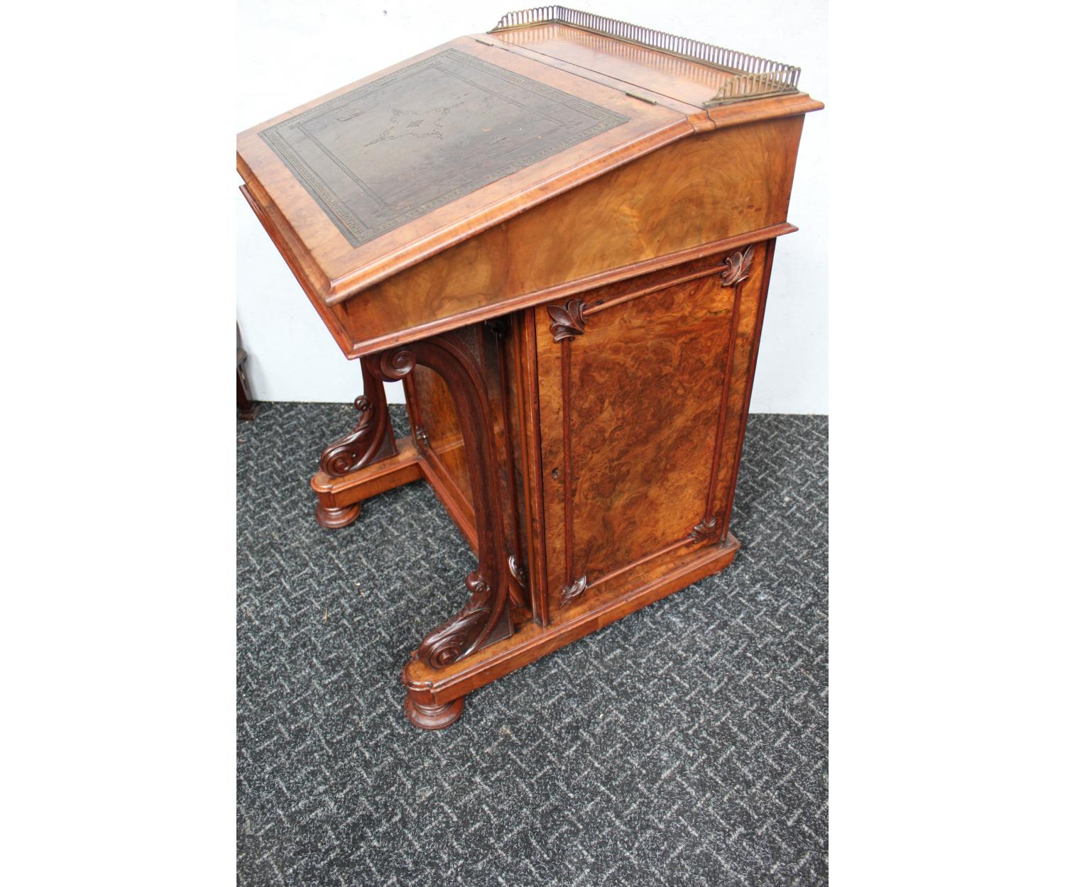 A Walnut Davenport. Has inset leather and brass gallery. To the right hand side four graduated drawers behind panelled door. Circa 1870