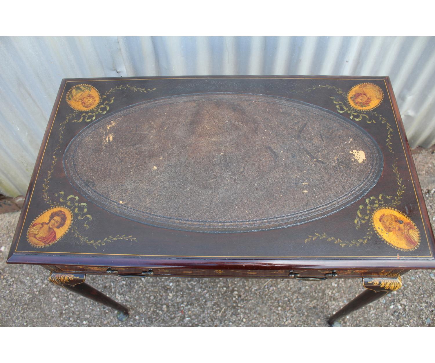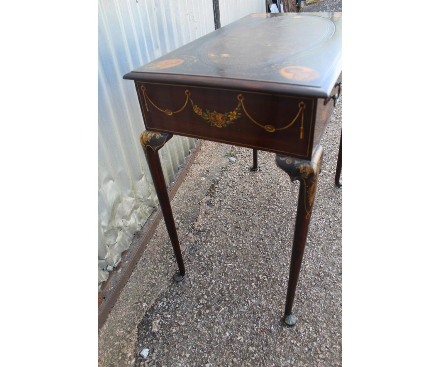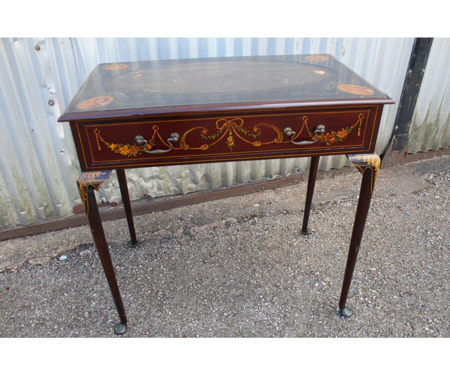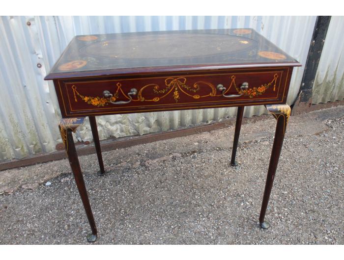 A small antique single drawer Writing Table. Has oval shaped inset leather top, stands on Queen Anne legs and has painted decoration. Circa 1890