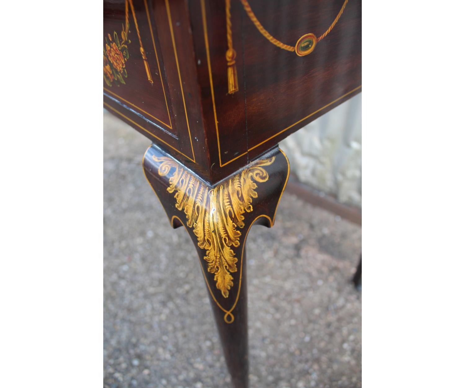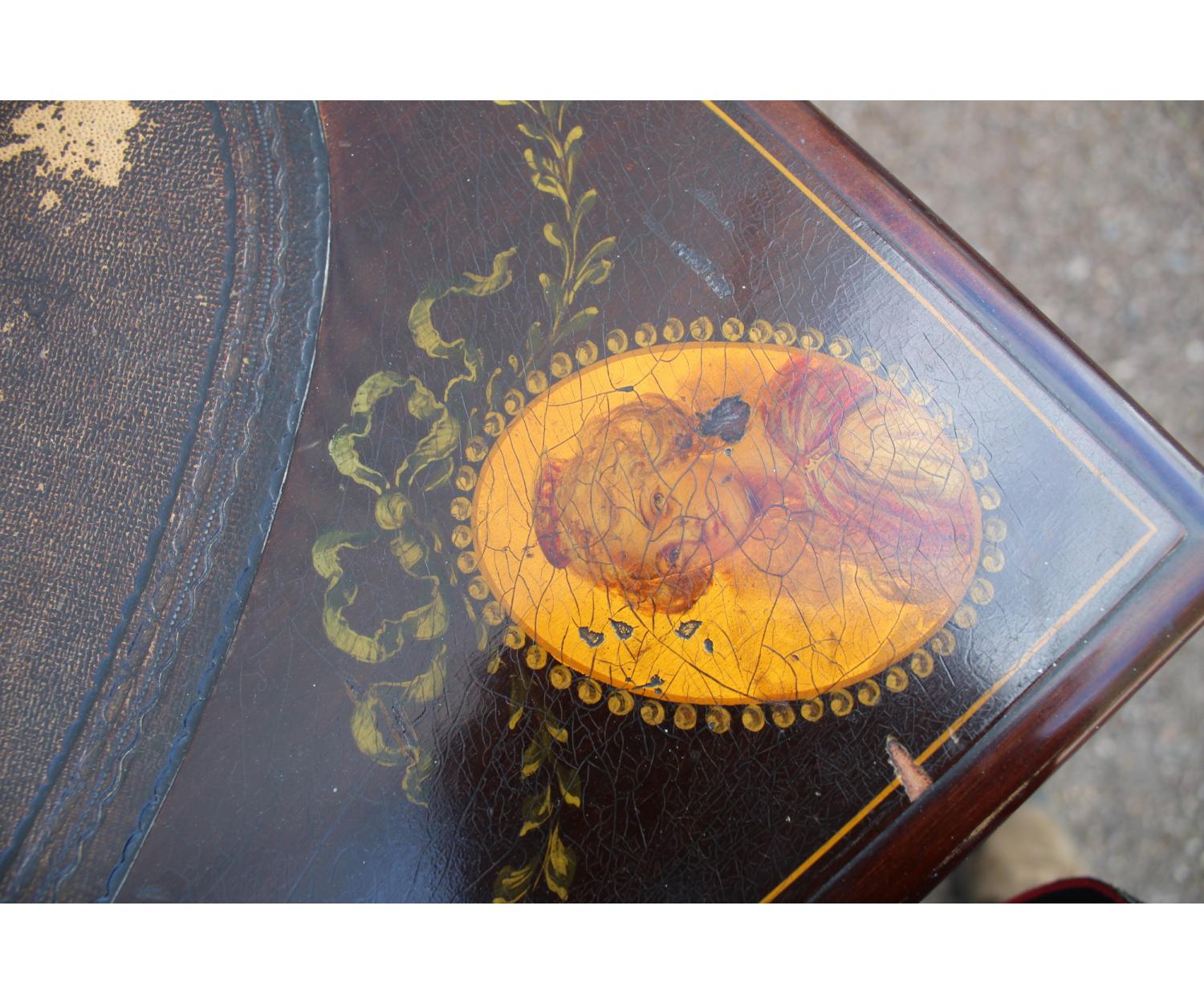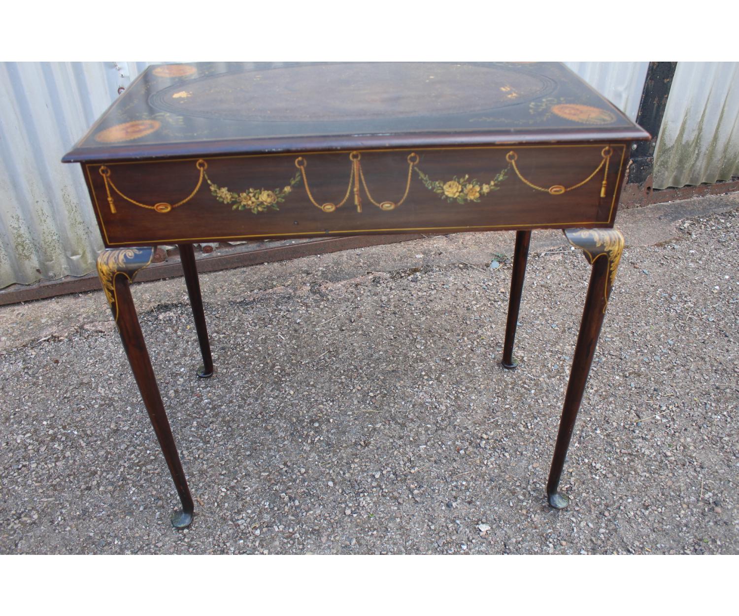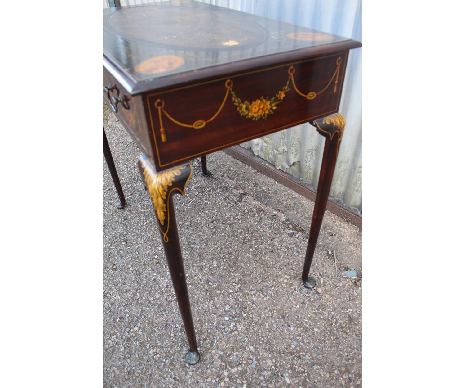 A small antique single drawer Writing Table. Has oval shaped inset leather top, stands on Queen Anne legs and has painted decoration. Circa 1890