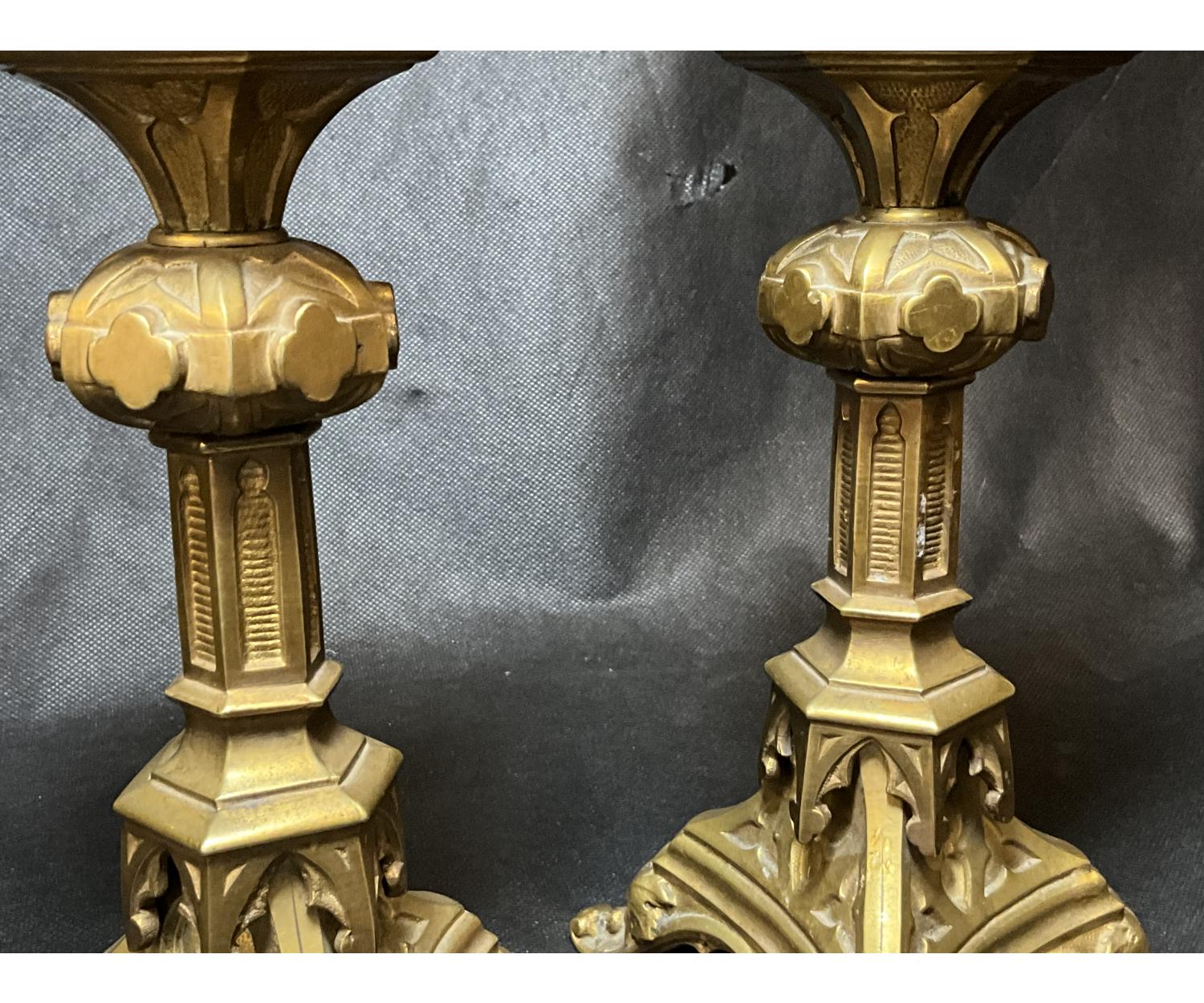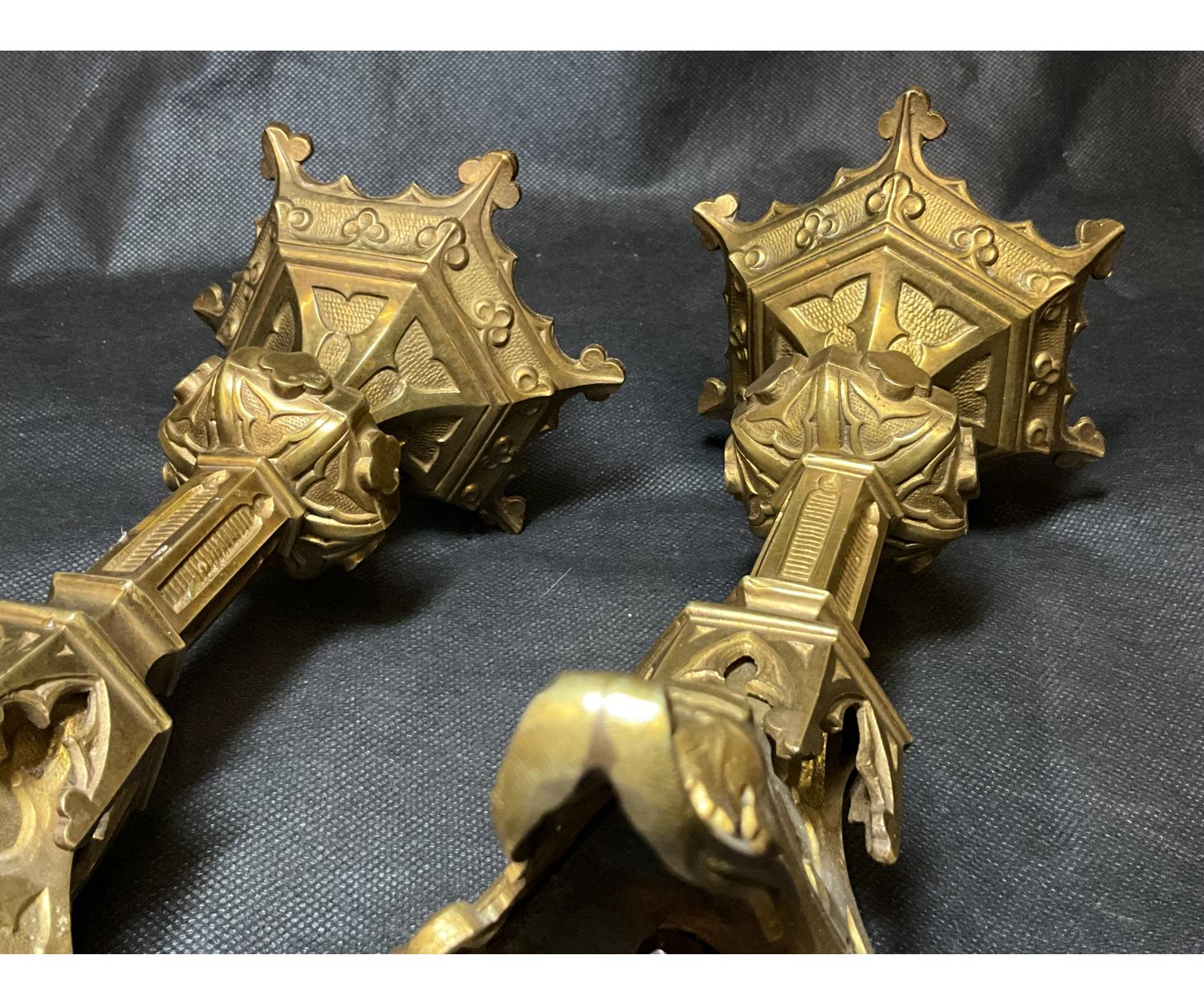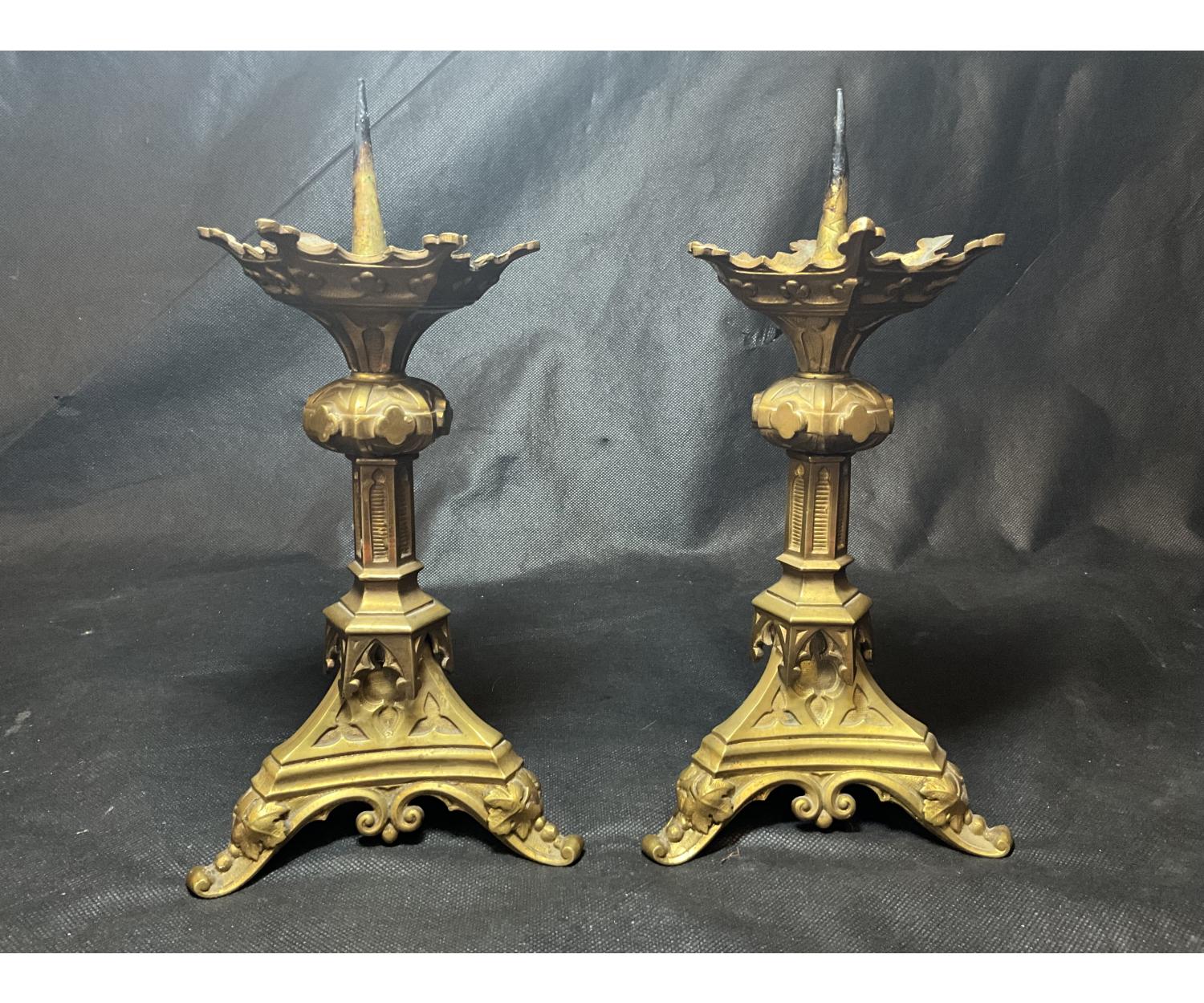 English circa 1900, these candlesticks illustrate the intricate details of the Gothic design are sure to catch the eye of anyone who sees them. These candlesticks are 28cm tall with a 14cm triangular base.