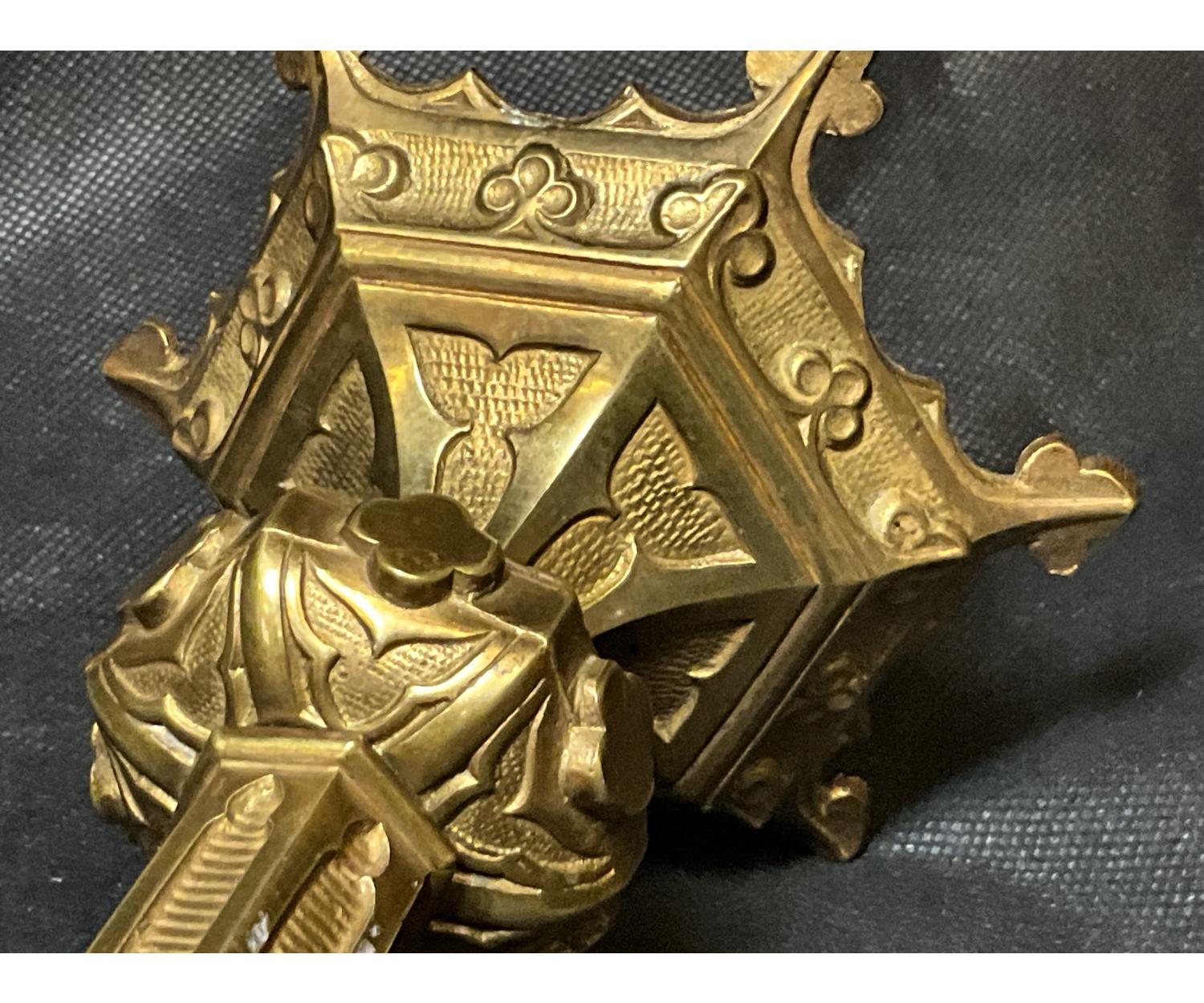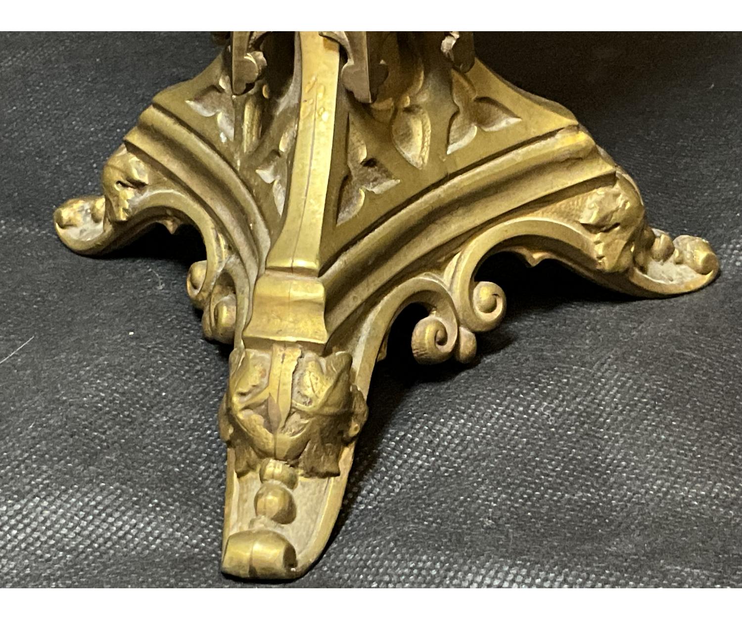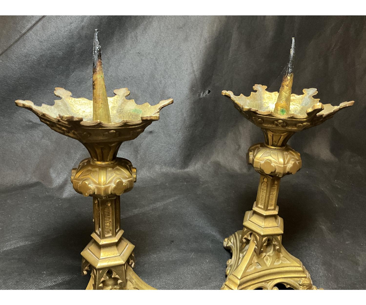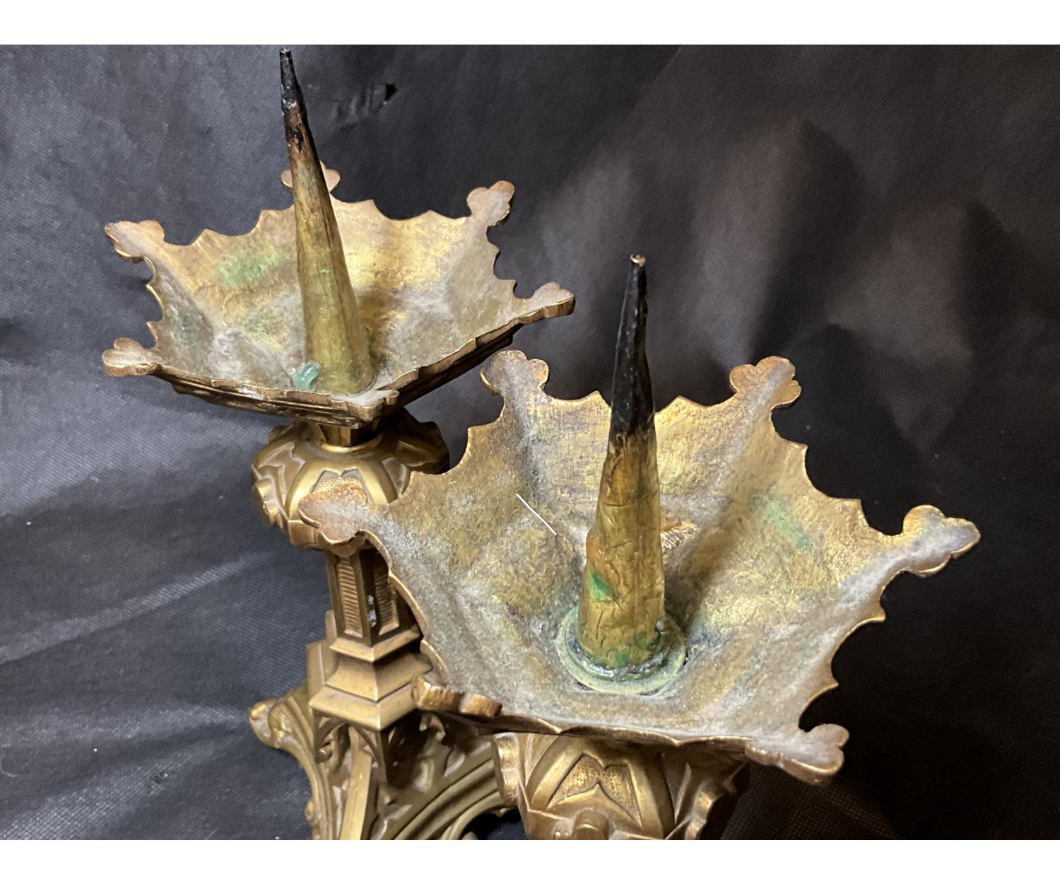 English circa 1900, these candlesticks illustrate the intricate details of the Gothic design are sure to catch the eye of anyone who sees them. These candlesticks are 28cm tall with a 14cm triangular base.