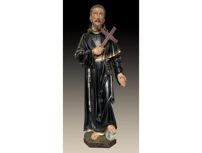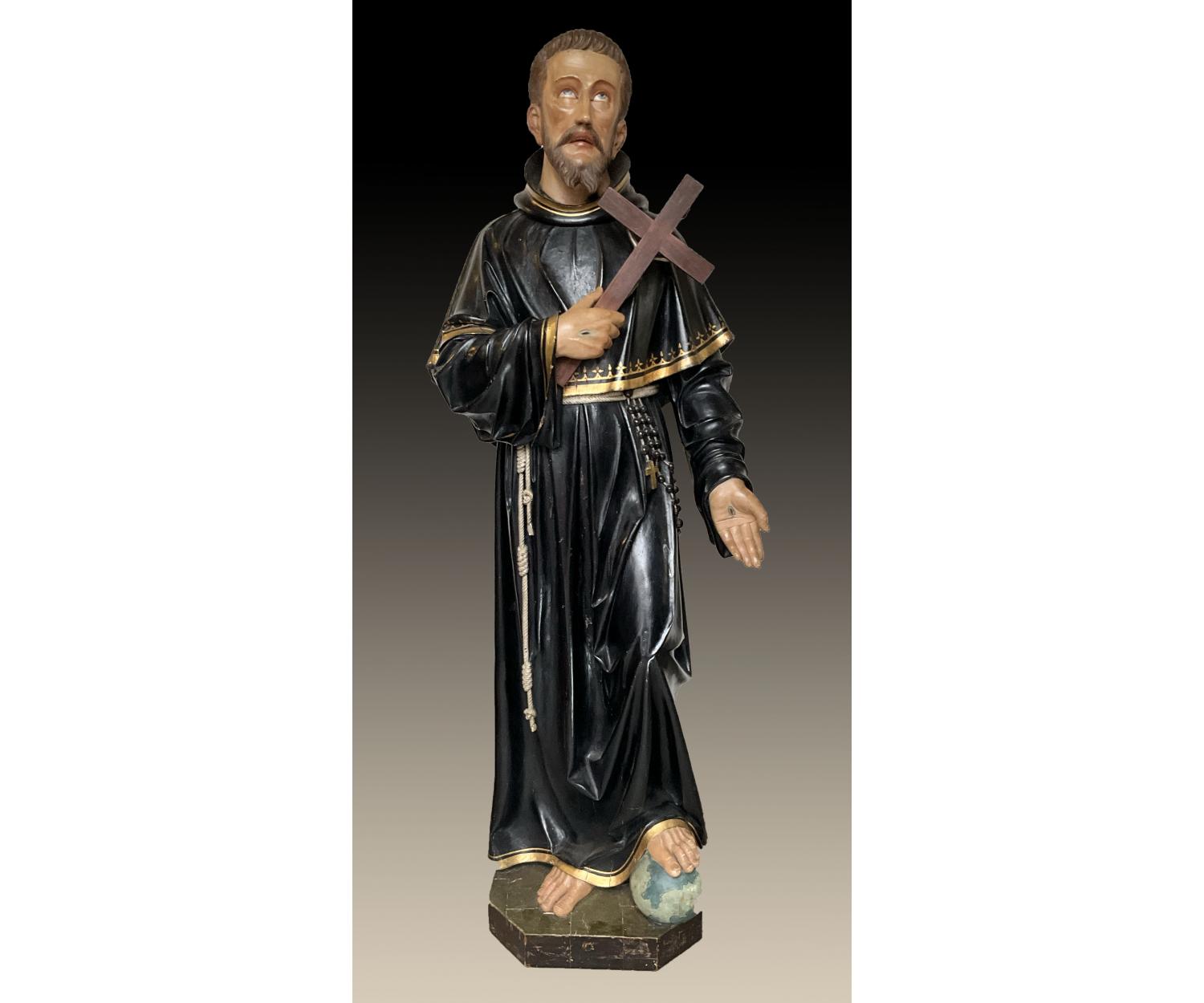Offered for sale is this unusual large carved wooden religious figure of a man with cross wearing a black and gold robe with one foot on a globe. With stigmata to both hands. Height 145 cm width 52 cm depth 30 cm.