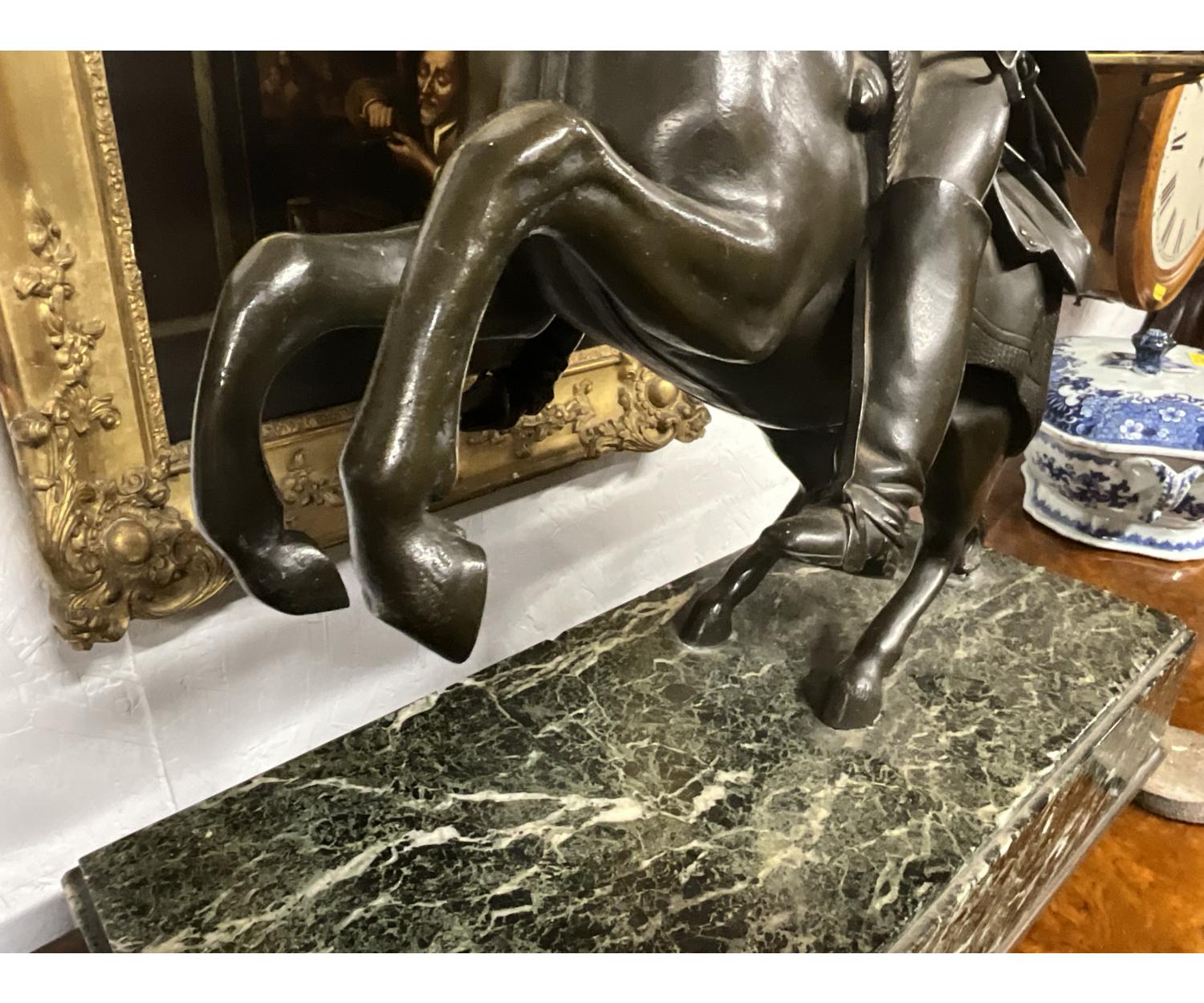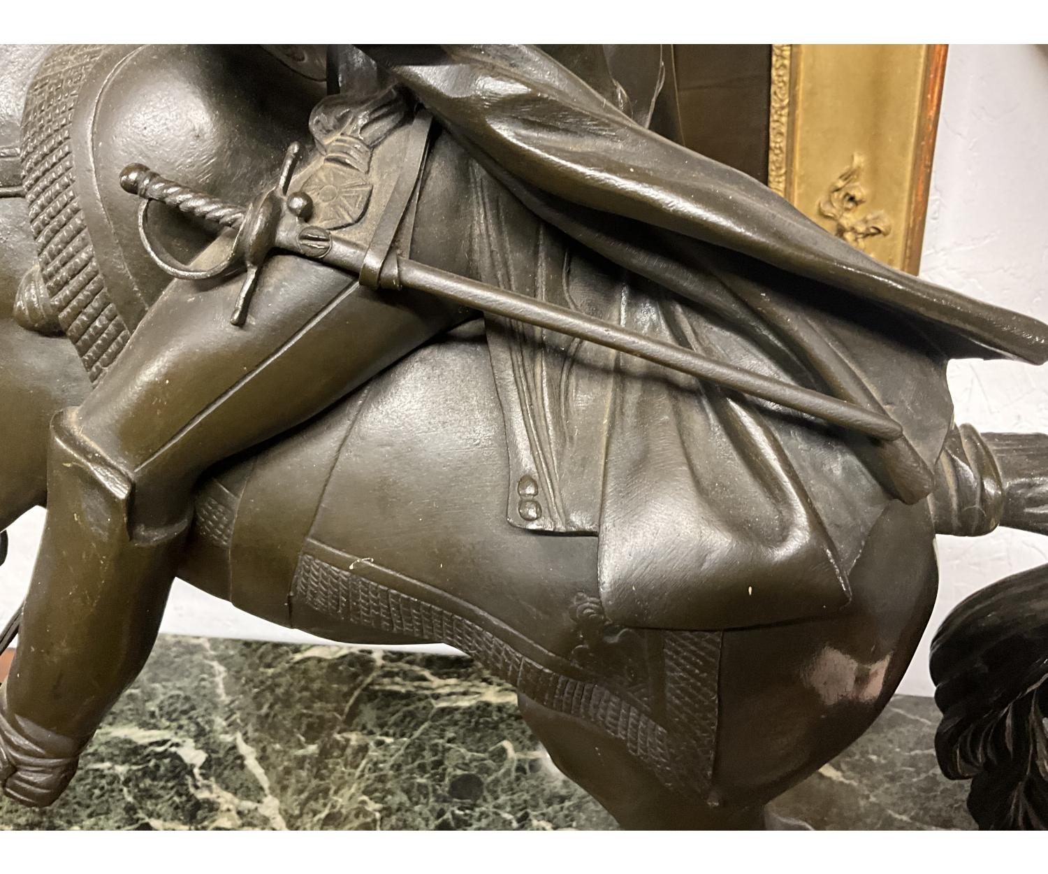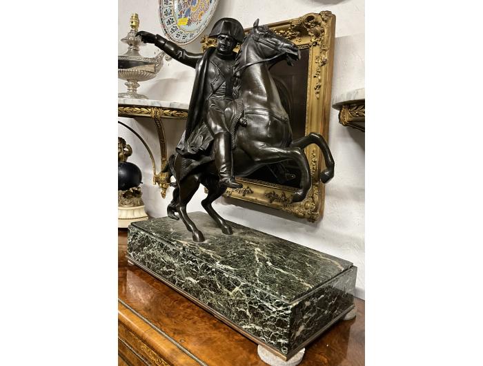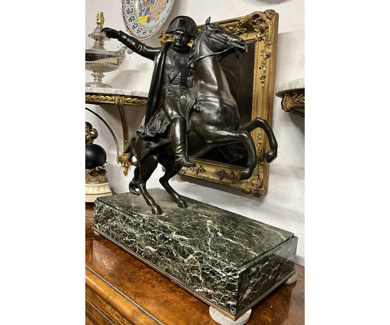 This stunning sculpture features Napoleon on horseback, in bronze and set upon a rectangular marble base. The attention to detail in this piece is truly remarkable, from the intricate characteristics of the horse's muscular body to the flowing jacket of the rider.