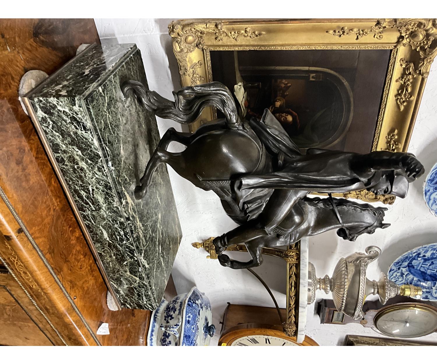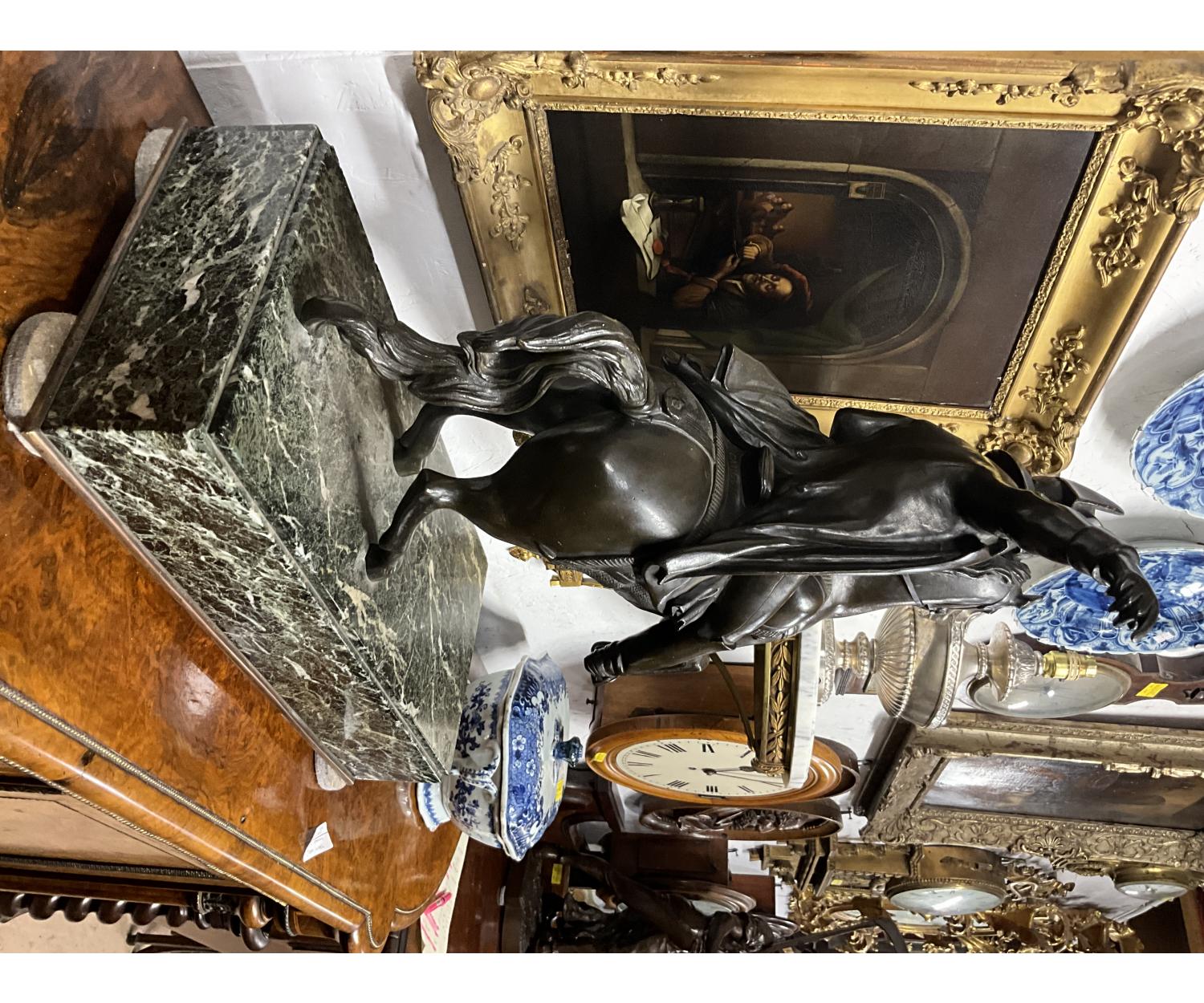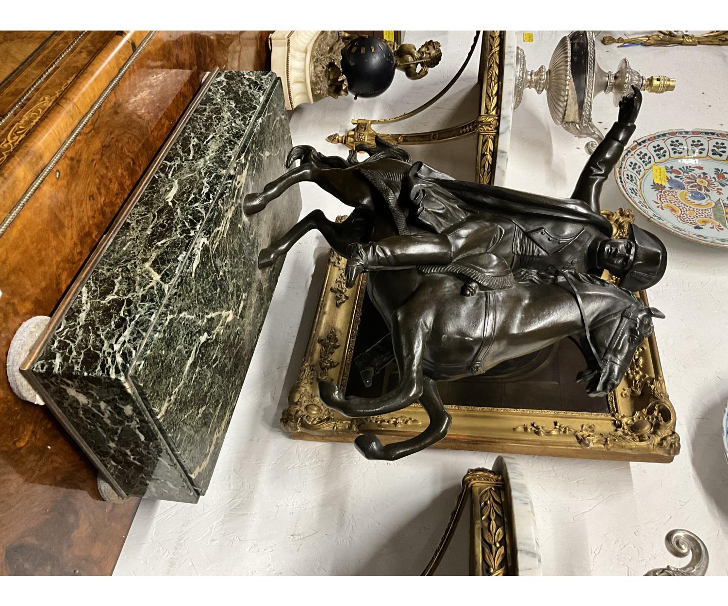 This stunning sculpture features Napoleon on horseback, in bronze and set upon a rectangular marble base. The attention to detail in this piece is truly remarkable, from the intricate characteristics of the horse's muscular body to the flowing jacket of the rider.
