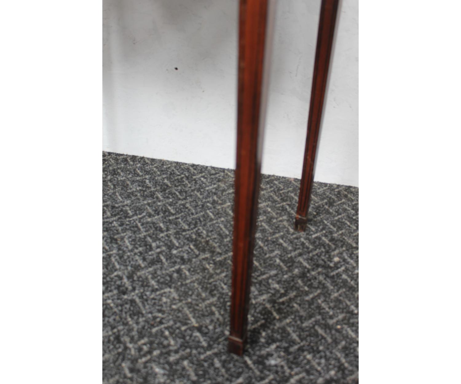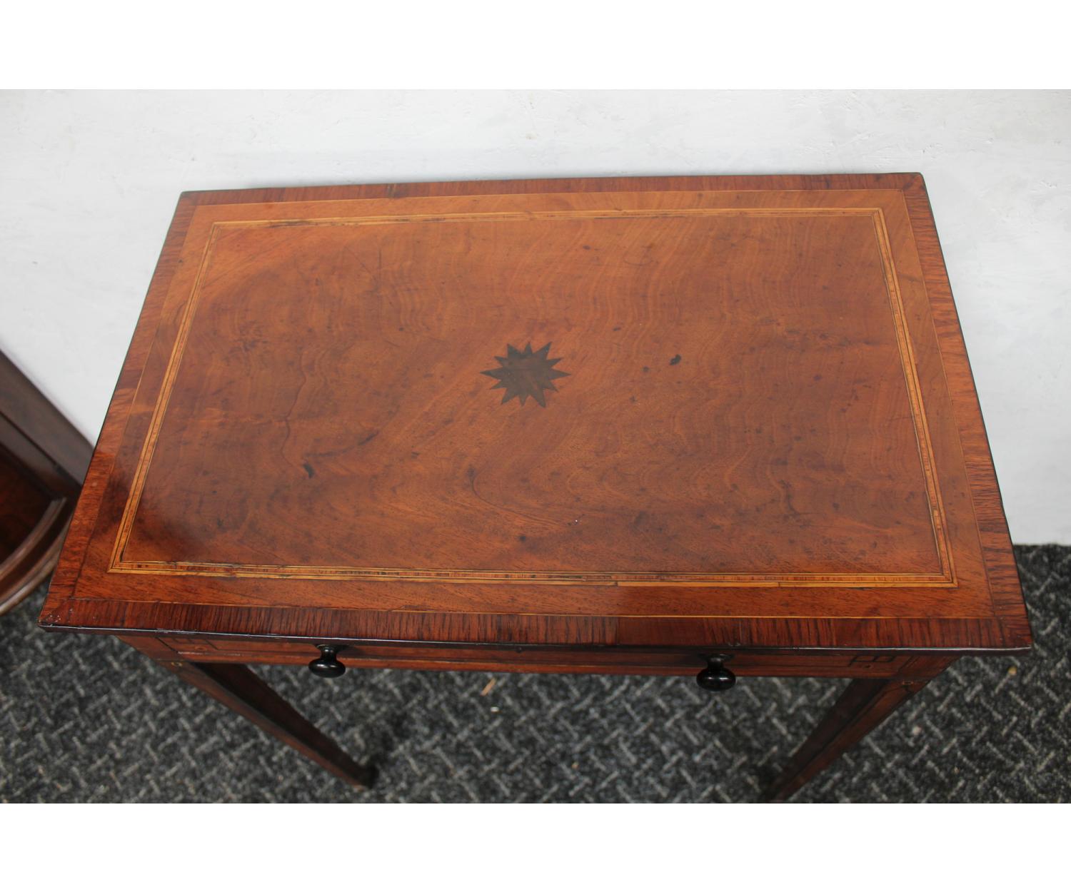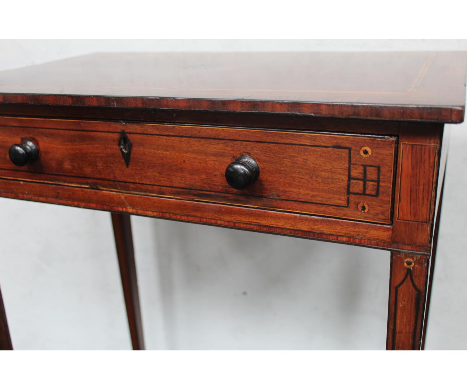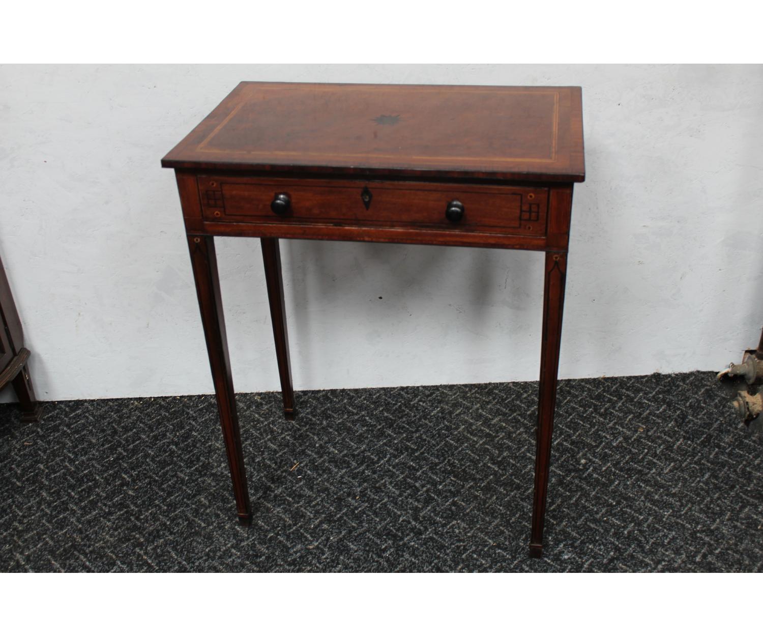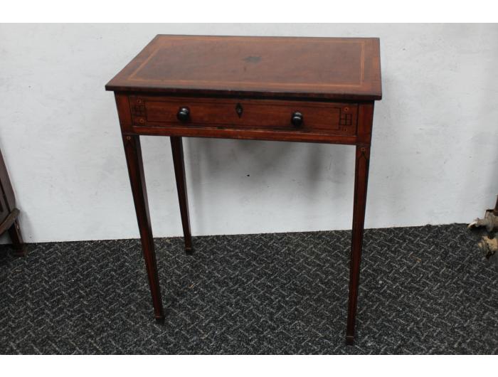 An English Mahogany Occasional Table with one drawer decorated with inlay. Stands on square tapered legs. Circa 1780