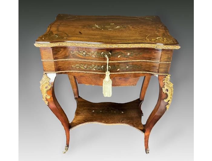 This beautiful rosewood work table is a stunning addition to any Victorian-style home. The table boasts intricate brass and silvered inlaid details that add a touch of elegance to any space. Measuring 74 cm in height, 56 cm in length, and 40 cm in width, this table is perfect for sewing or any other similar work you might have in mind or as a beautiful standalone piece of furniture.