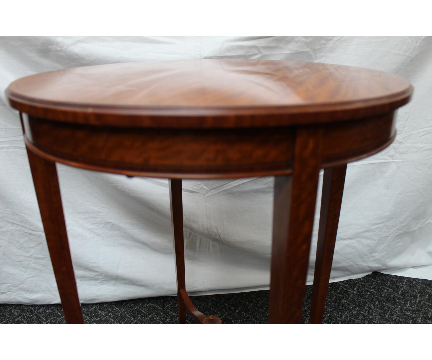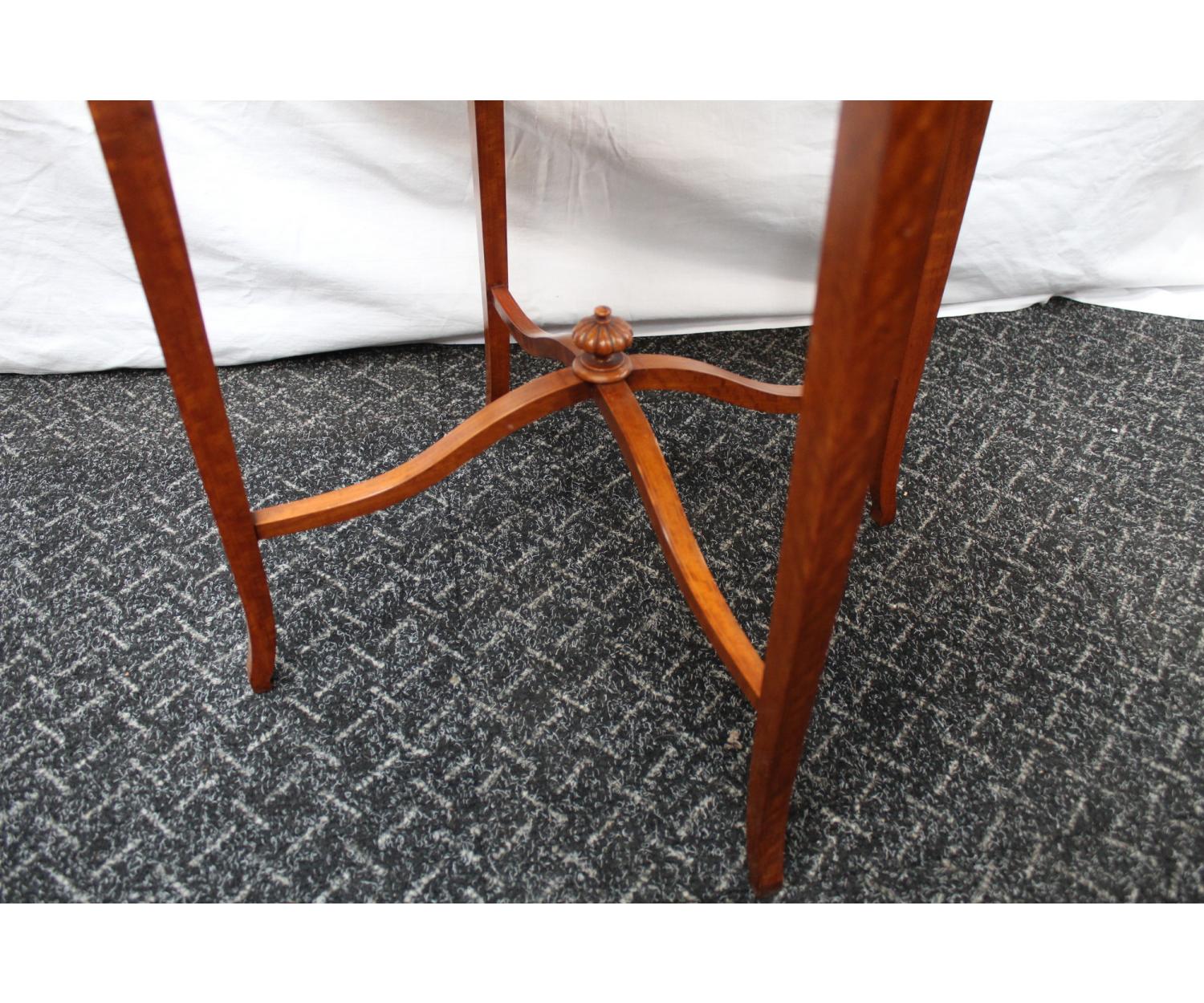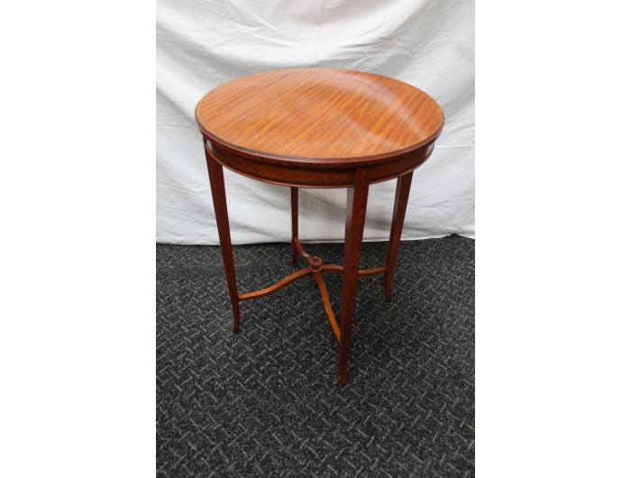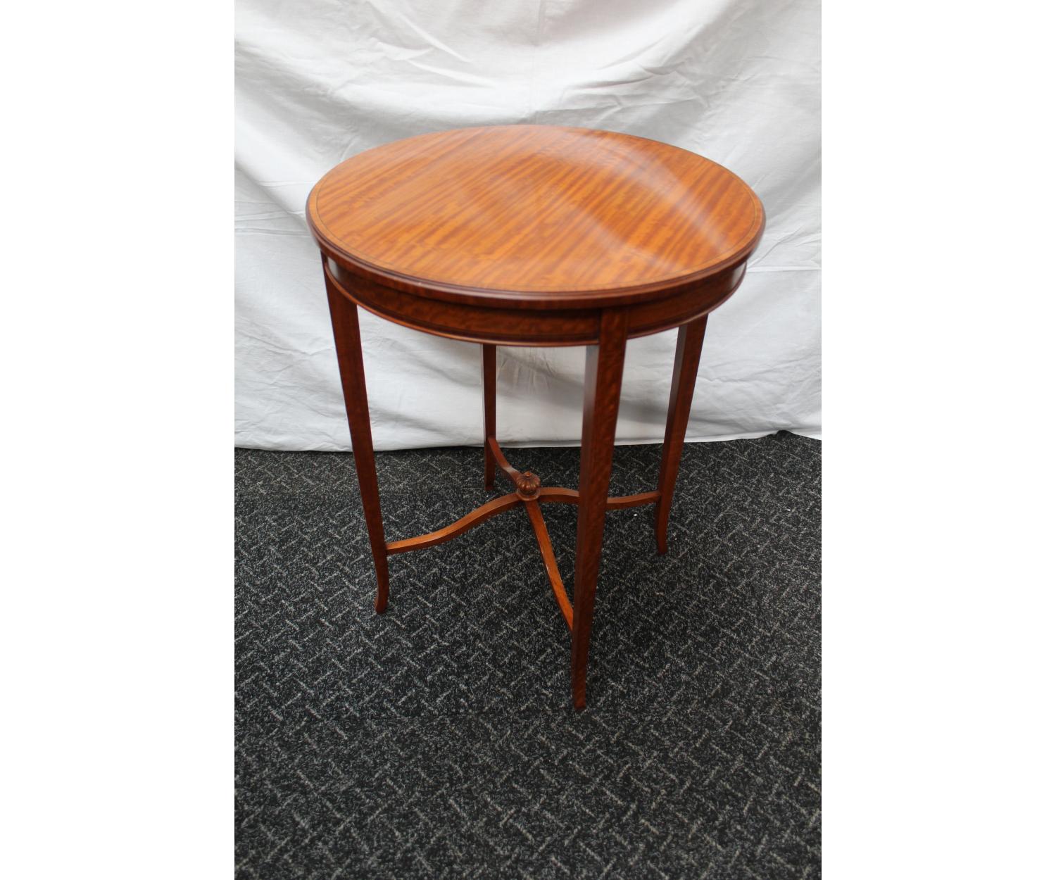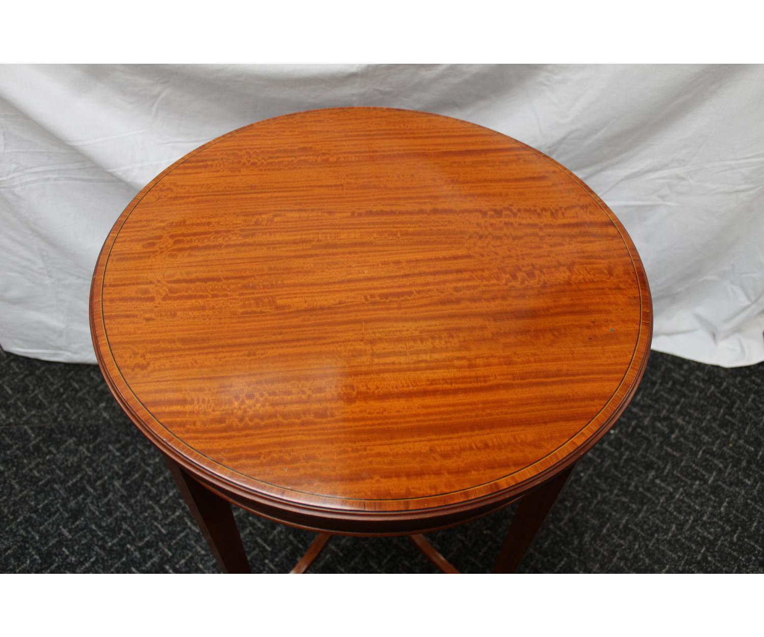 A Satinwood Occasional Table decorated with inlay borders, stands on square tapered legs. English. Circa 1900