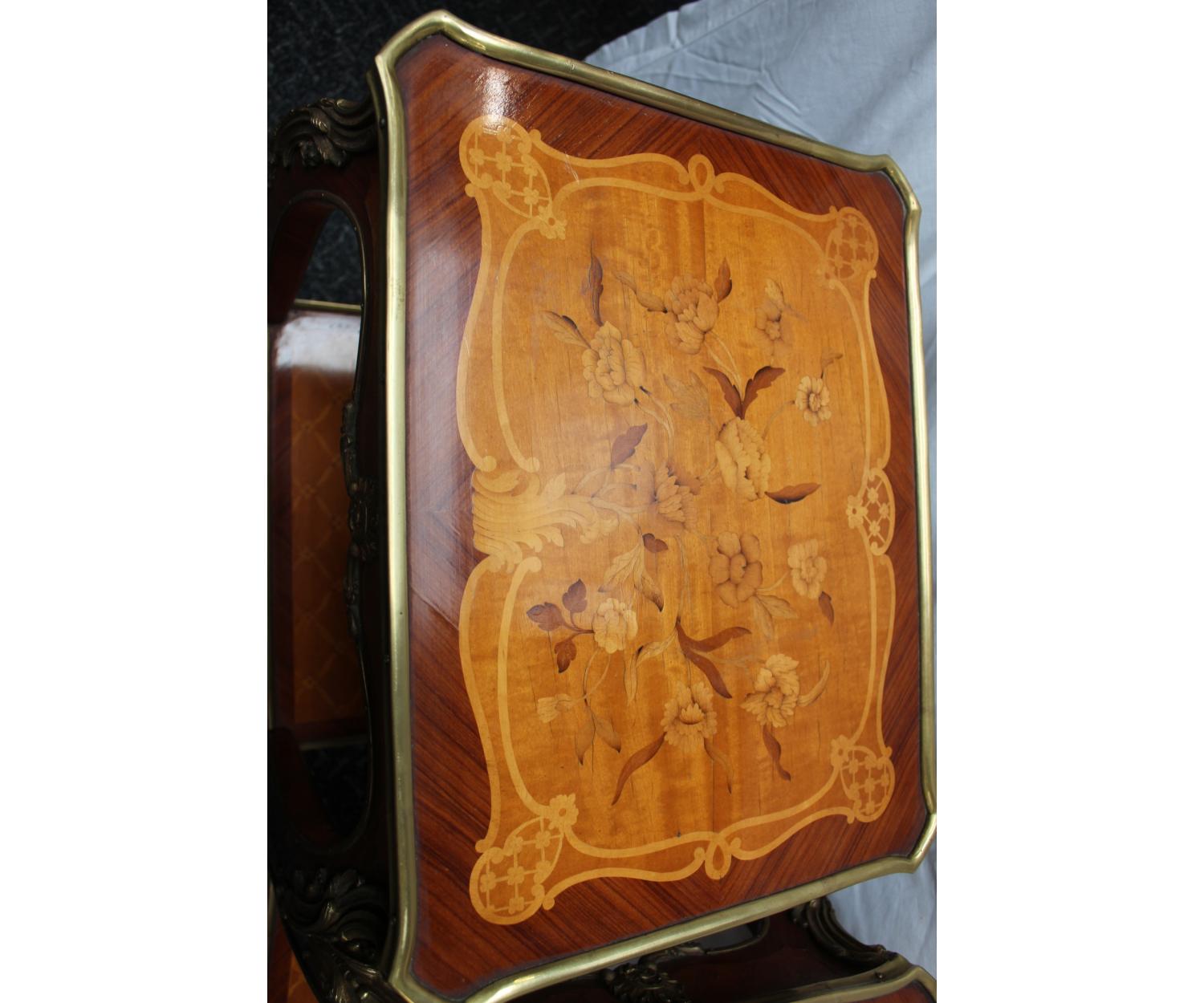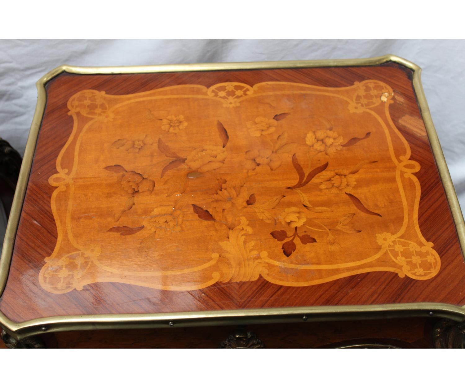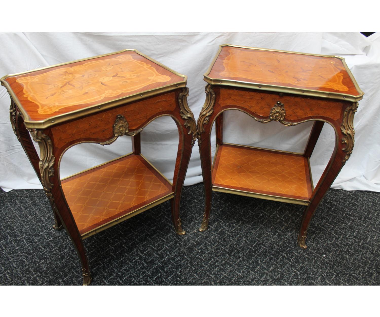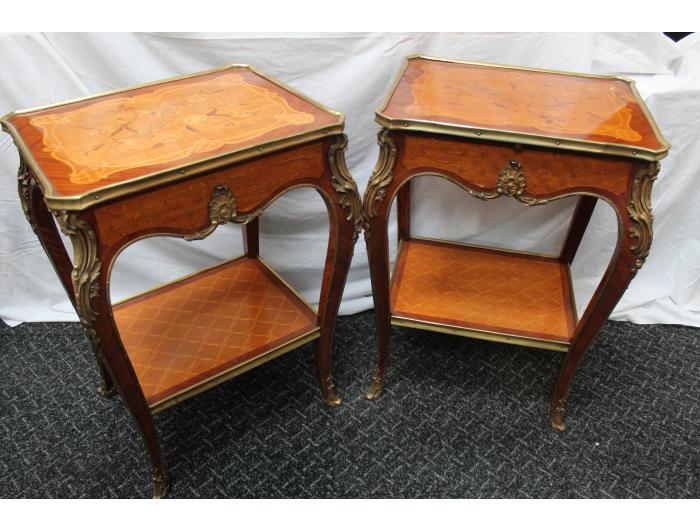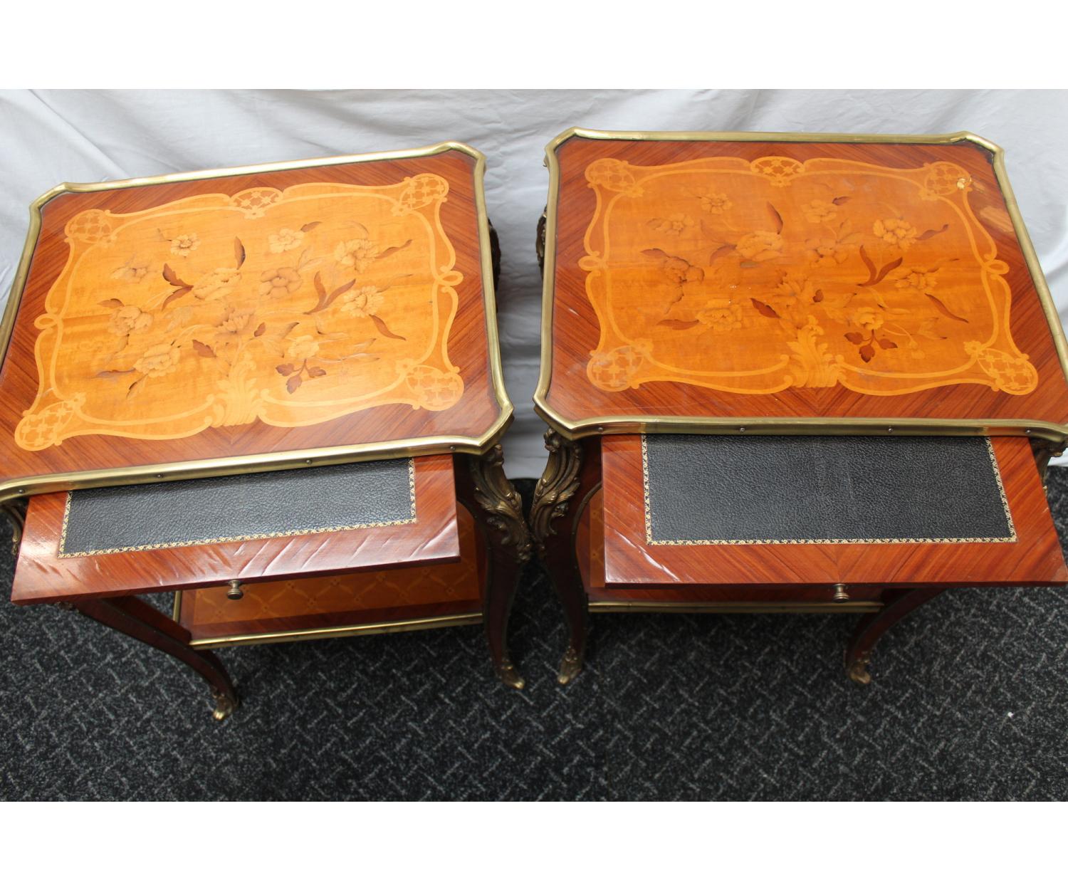 A pair of inlaid Occasional Tables. Both have a drawer to the side and slide to the front decorated with ormalou mounts. Circa 1940s