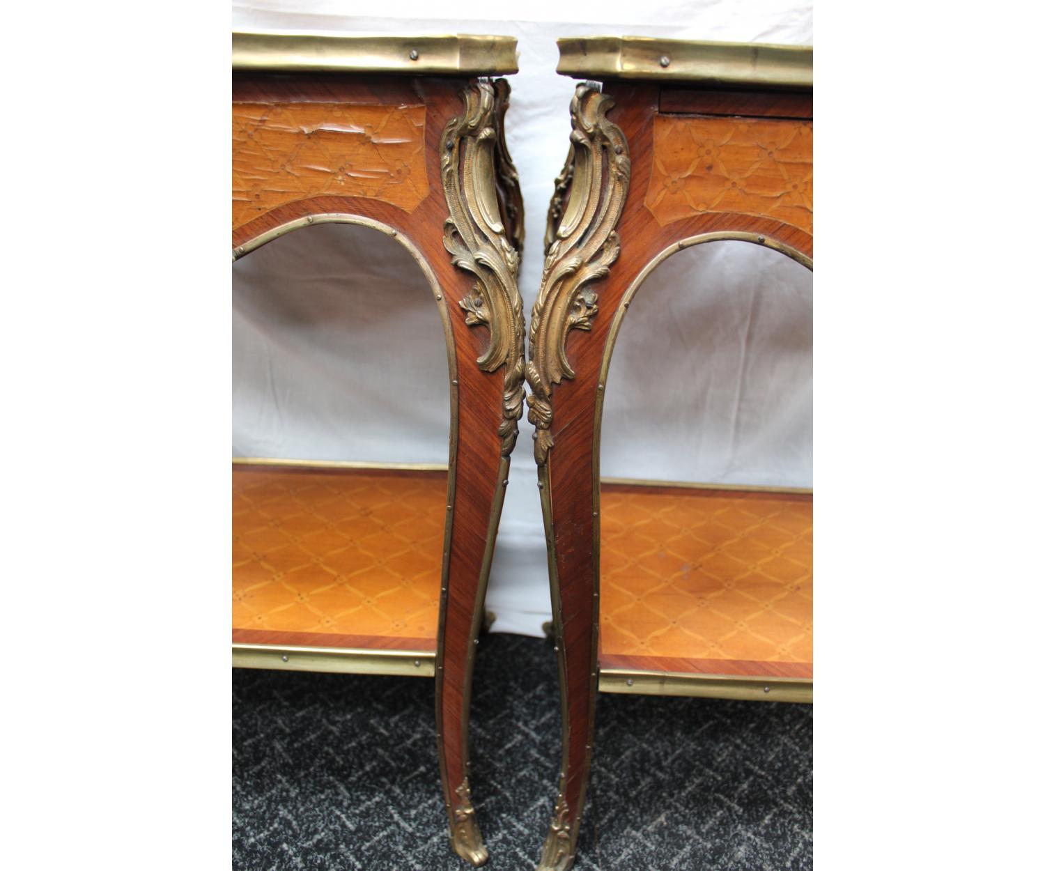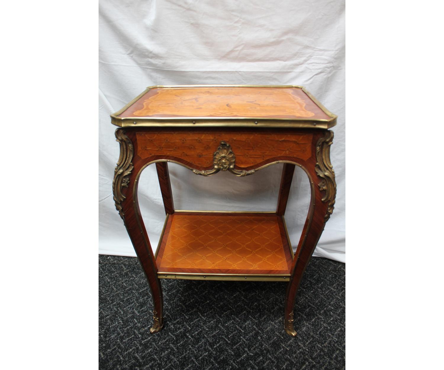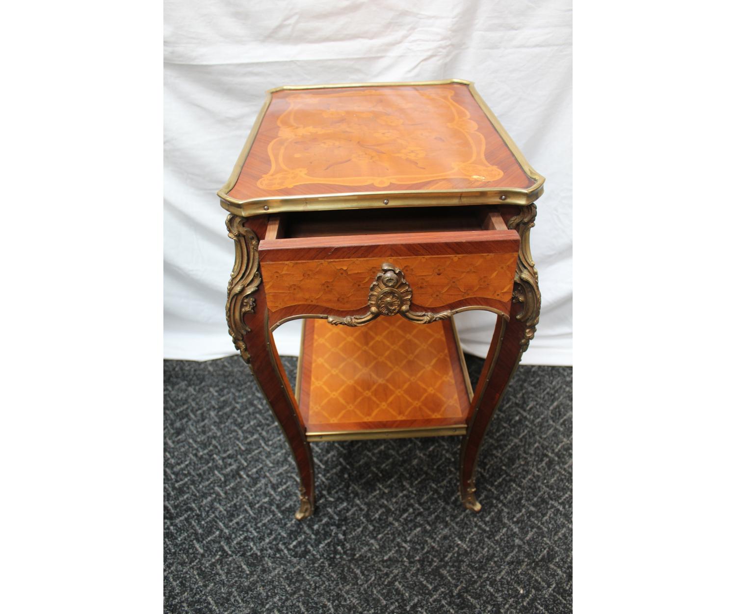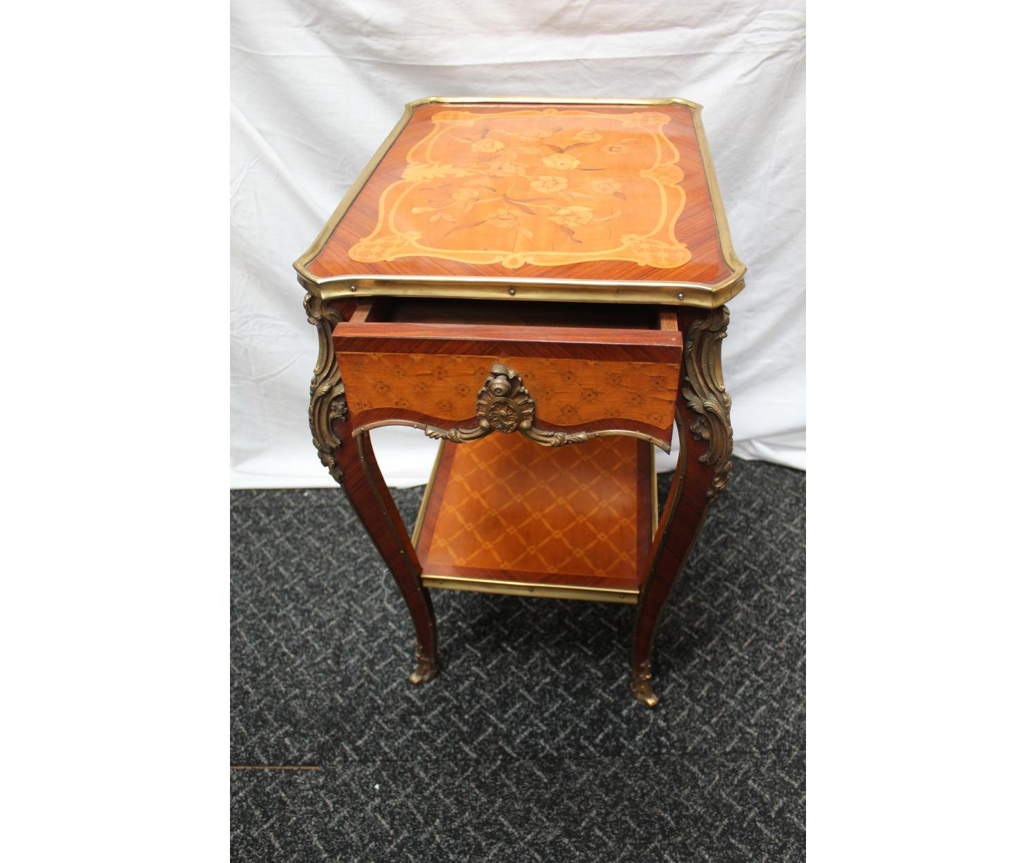A pair of inlaid Occasional Tables. Both have a drawer to the side and slide to the front decorated with ormalou mounts. Circa 1940s