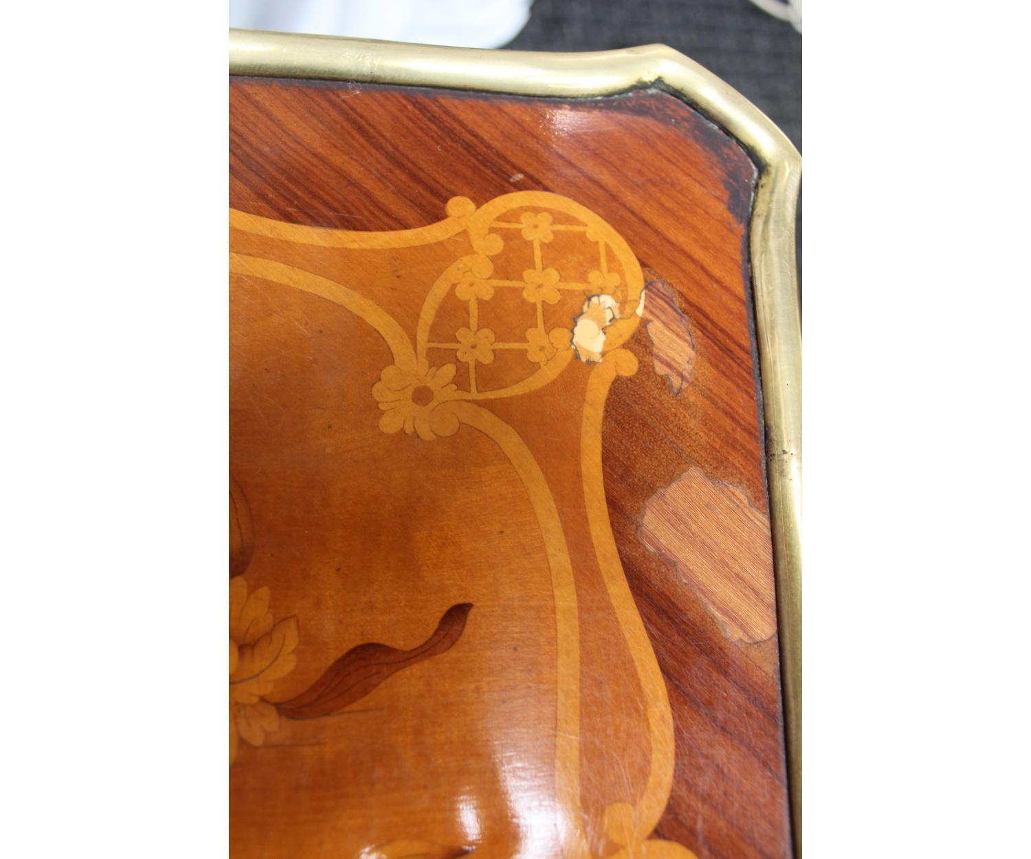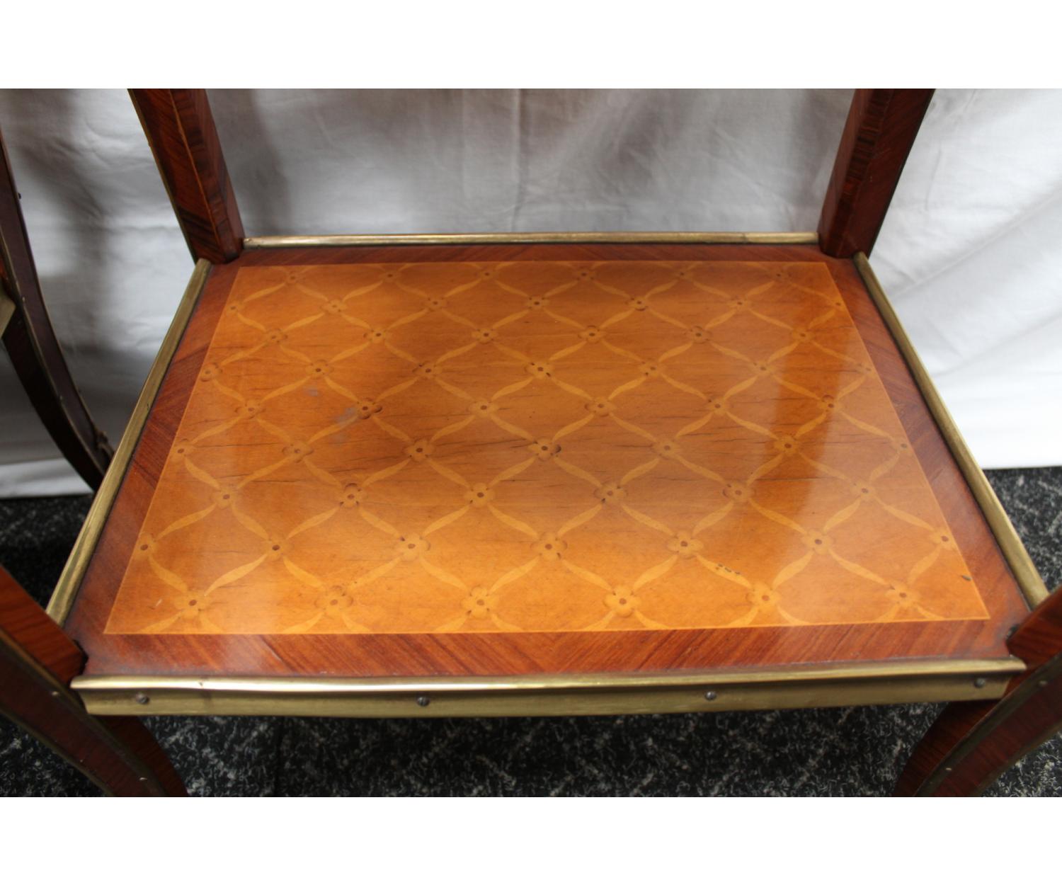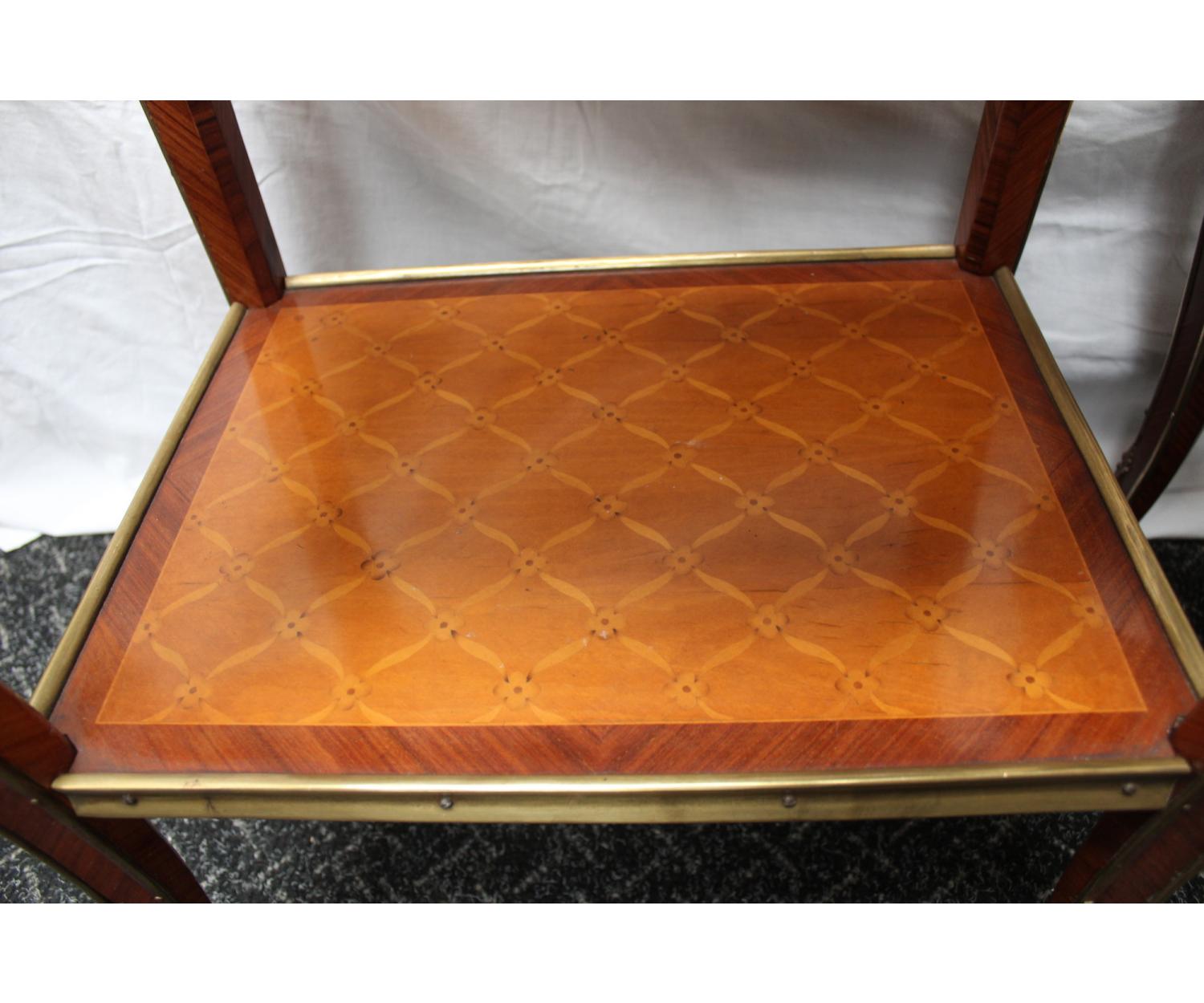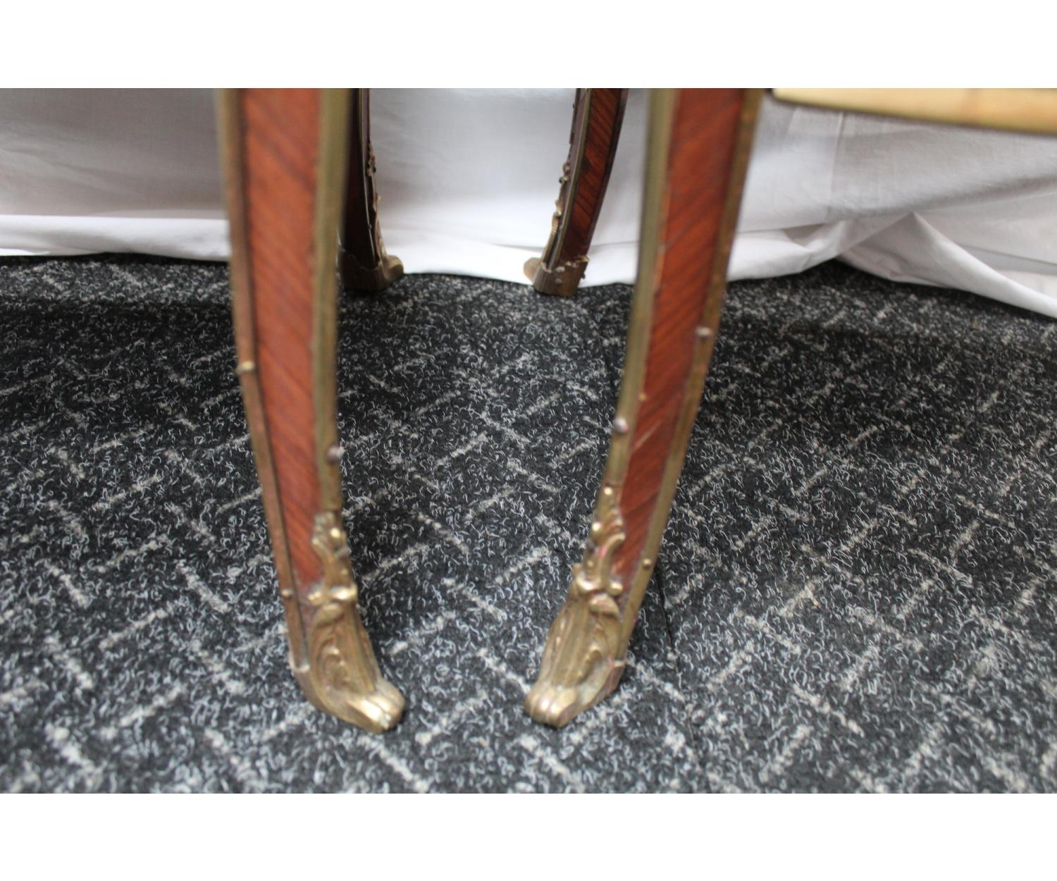 A pair of inlaid Occasional Tables. Both have a drawer to the side and slide to the front decorated with ormalou mounts. Circa 1940s
