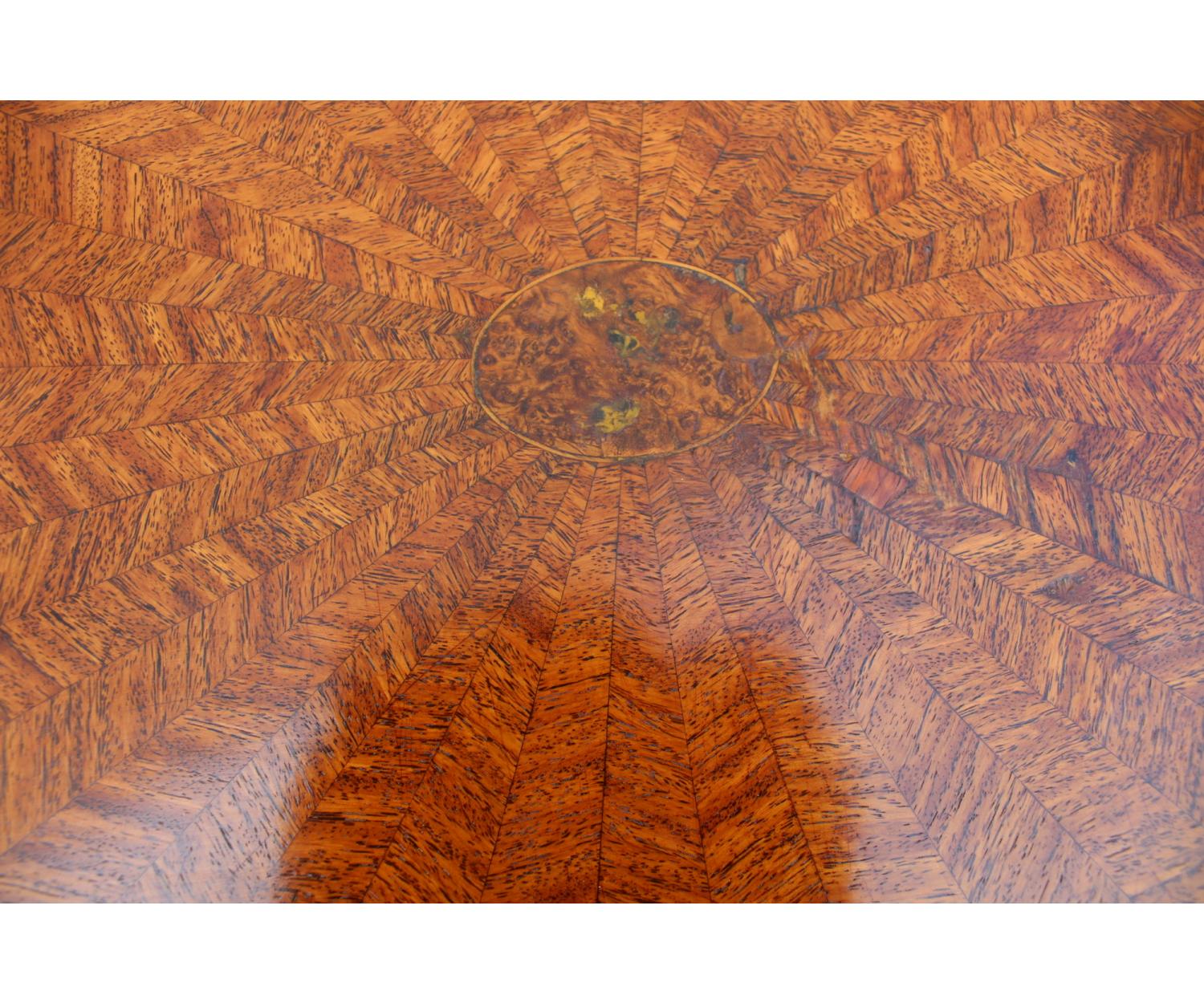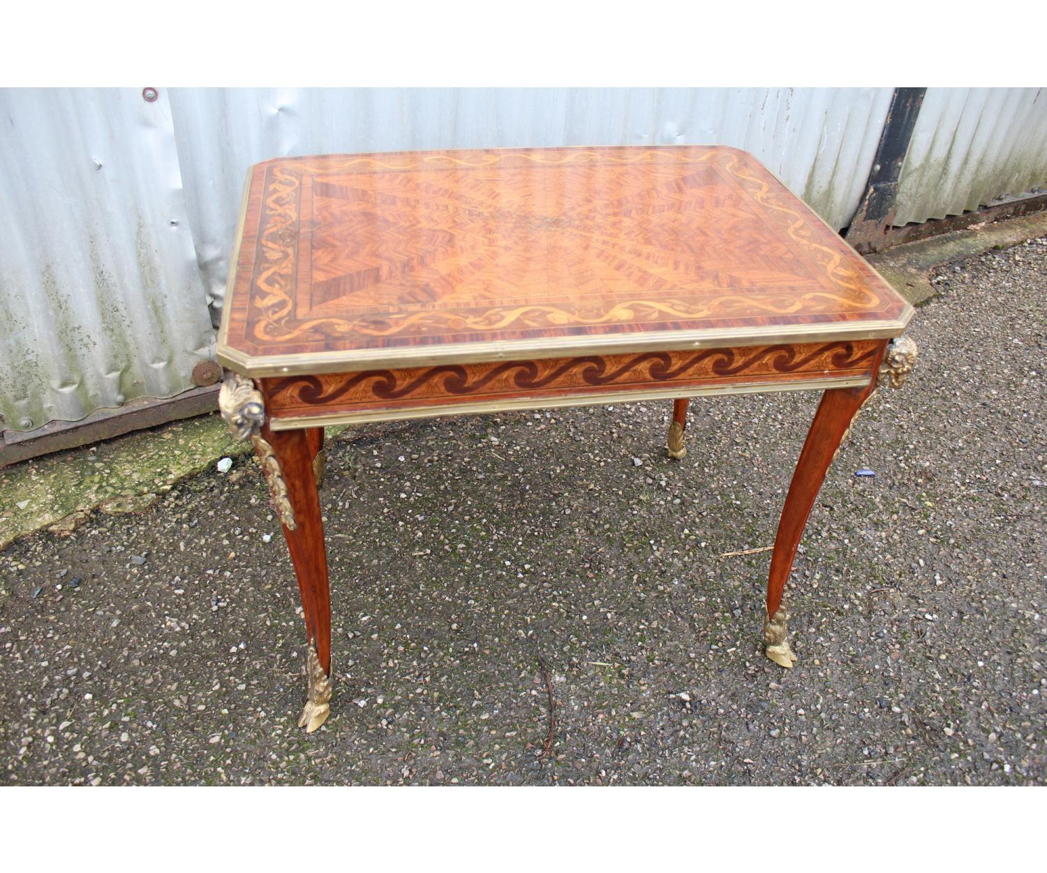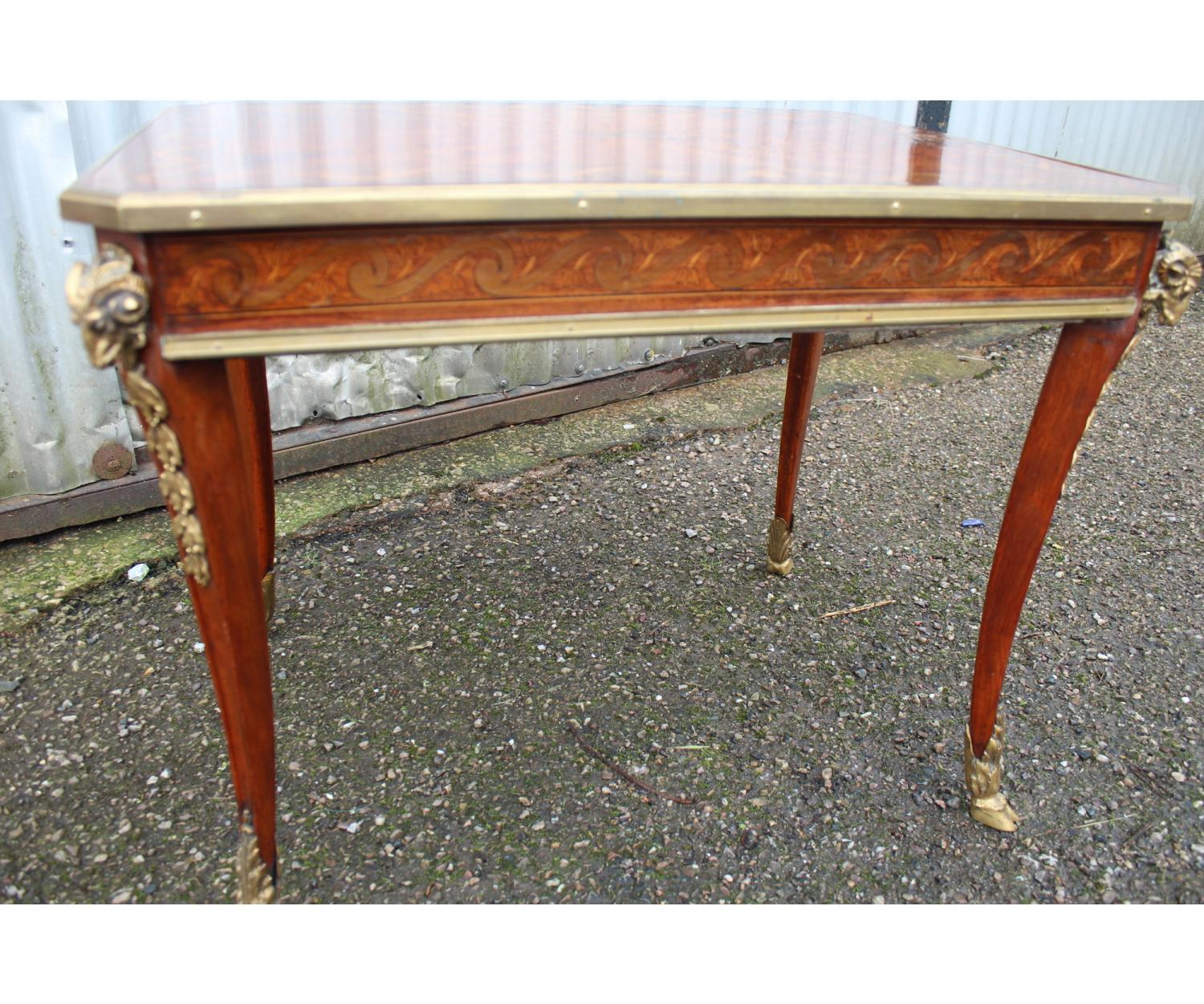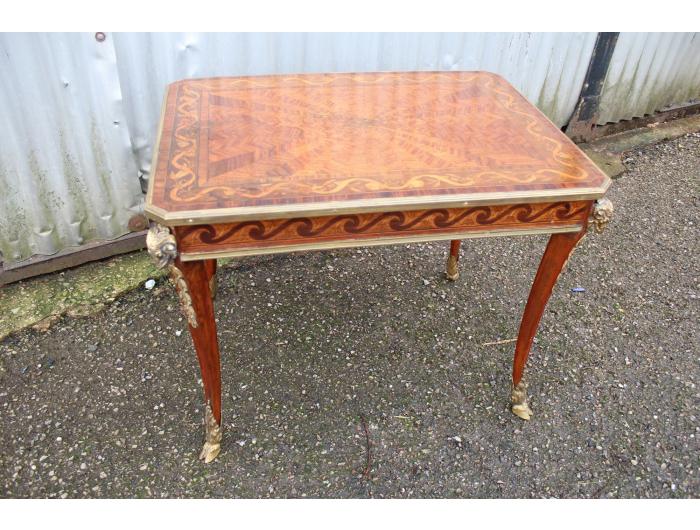 A French Parquetry and Marquetry Occasional Table decorated with rams heads and hoof feet. Circa 1900