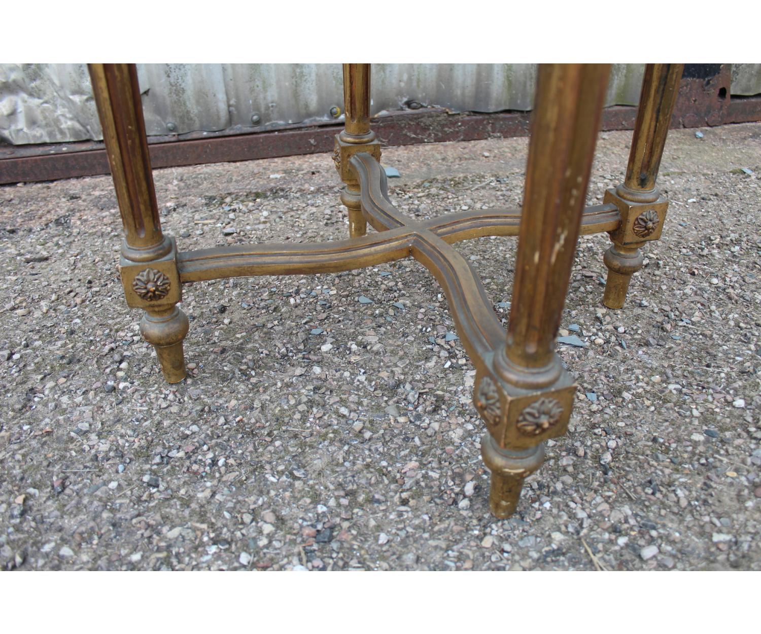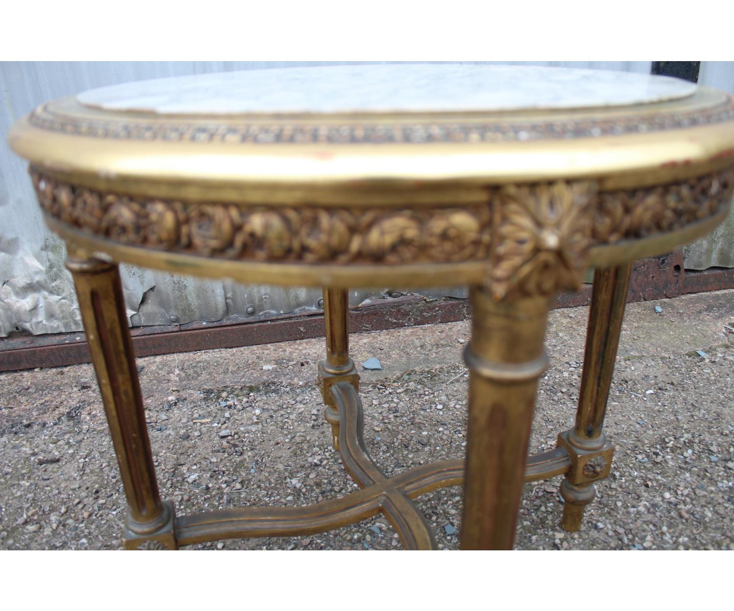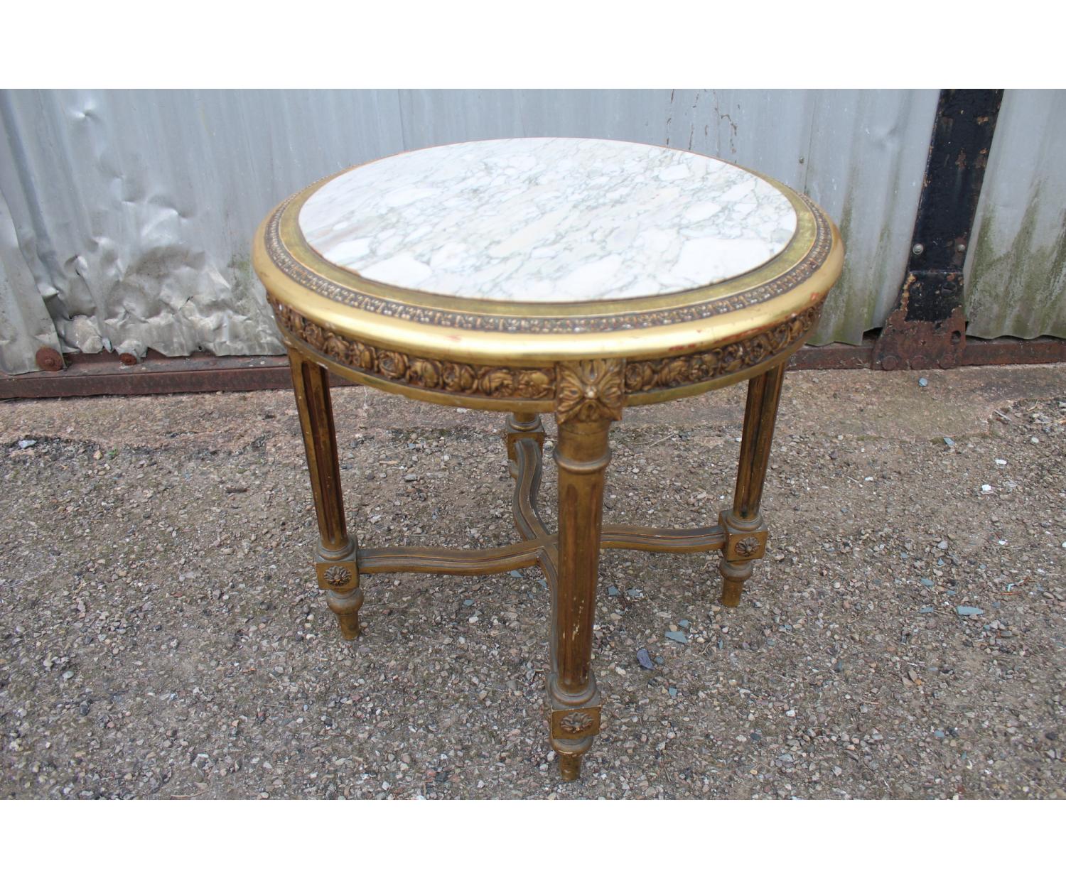 A round gilt Occasional Table with inset marble top, turned and fluted legs and shaped cross stretcher. Circa 1900