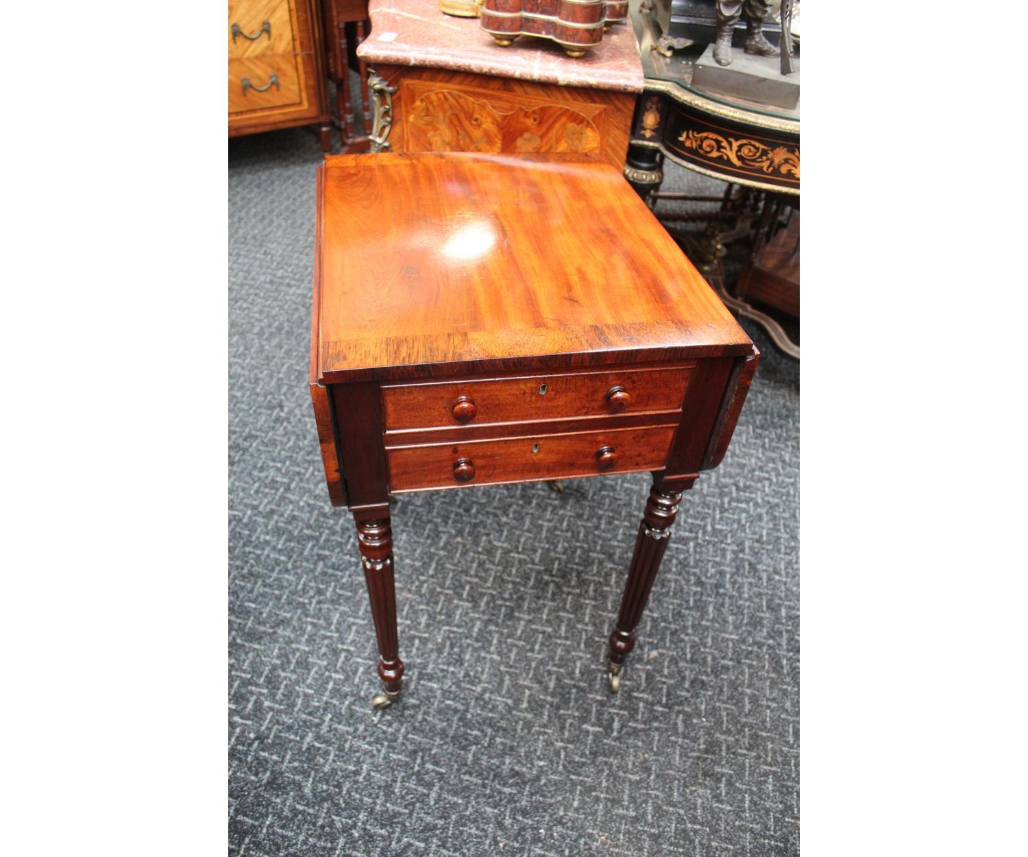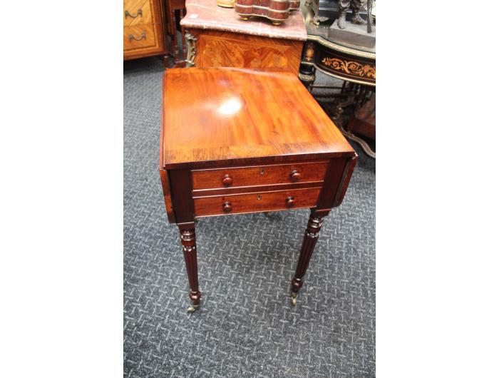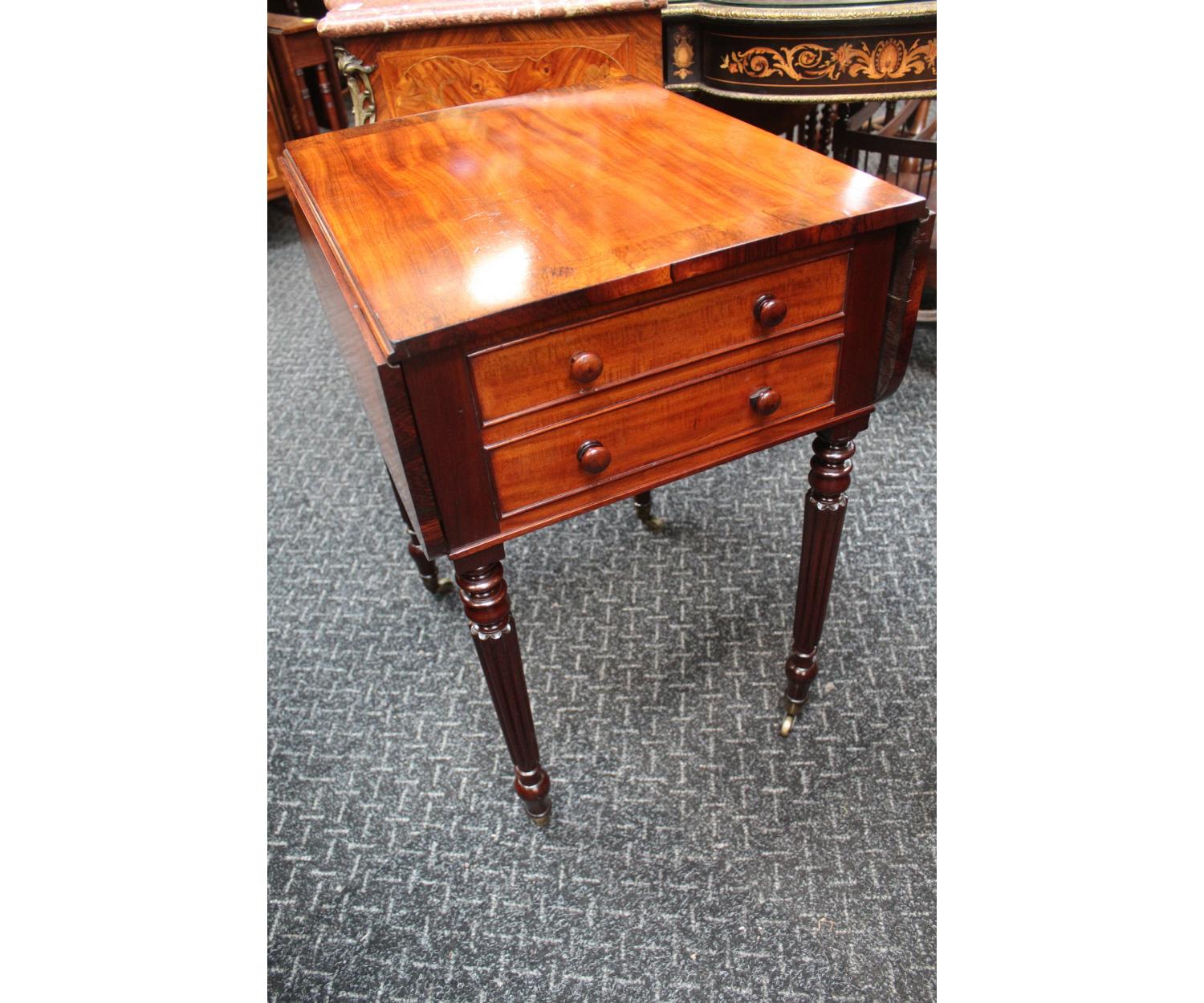 An English Mahogany Work Table with drop flap top, two full depth drawers dummy drawers opposite. Stands on turned and fluted legs and brass castors. Circa 1825