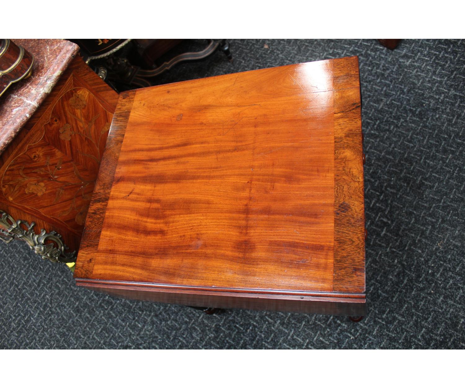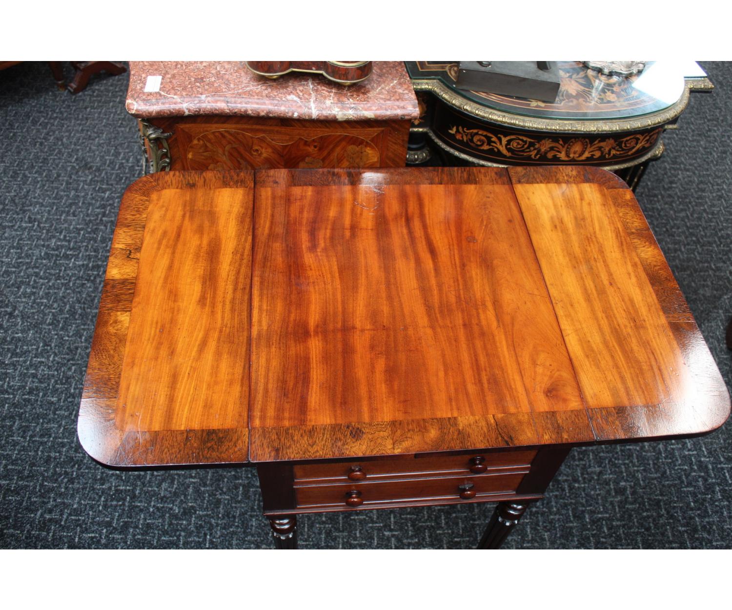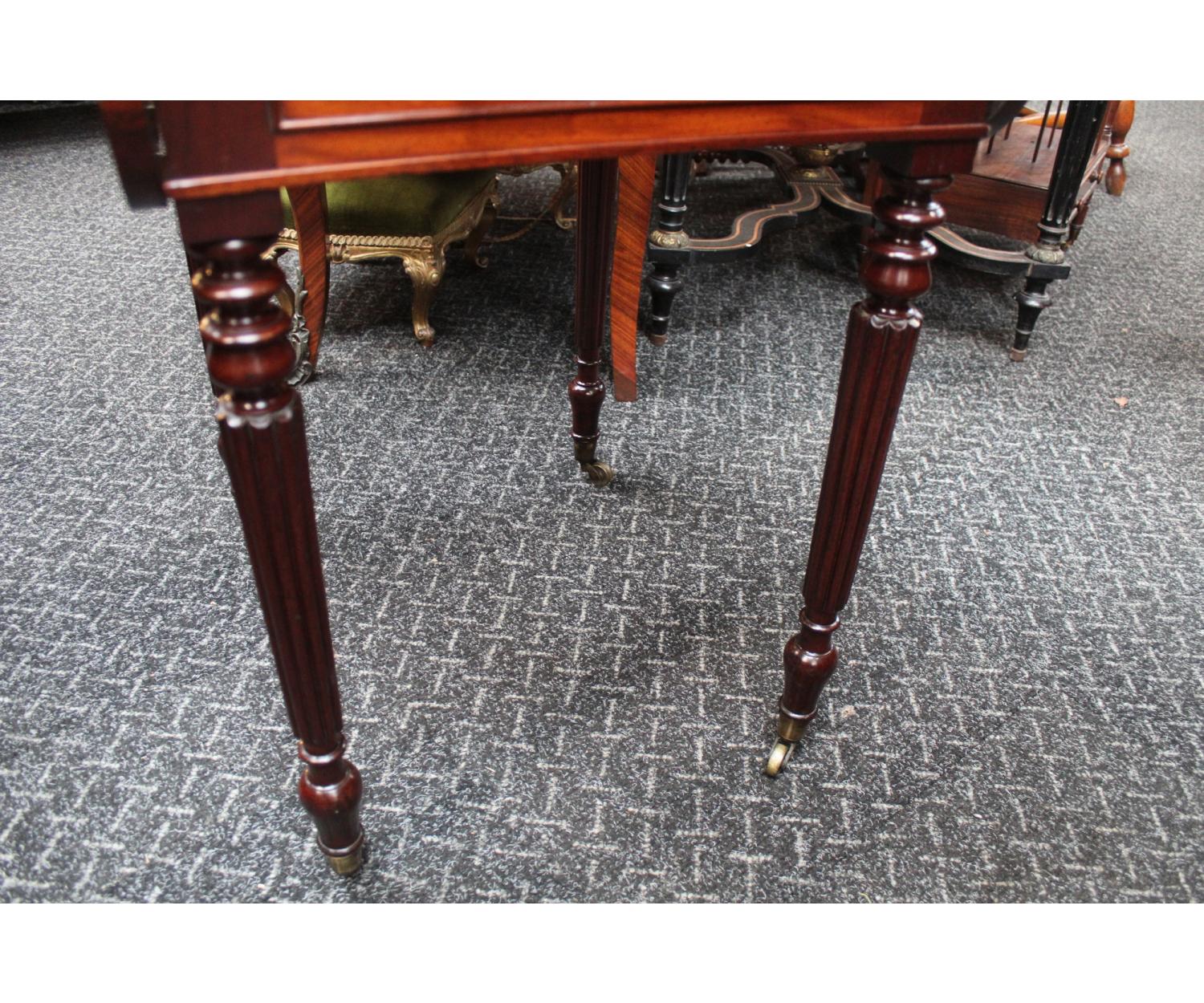 An English Mahogany Work Table with drop flap top, two full depth drawers dummy drawers opposite. Stands on turned and fluted legs and brass castors. Circa 1825