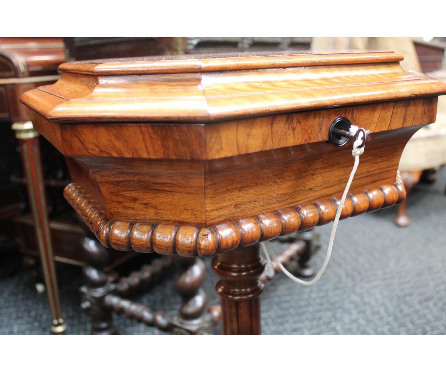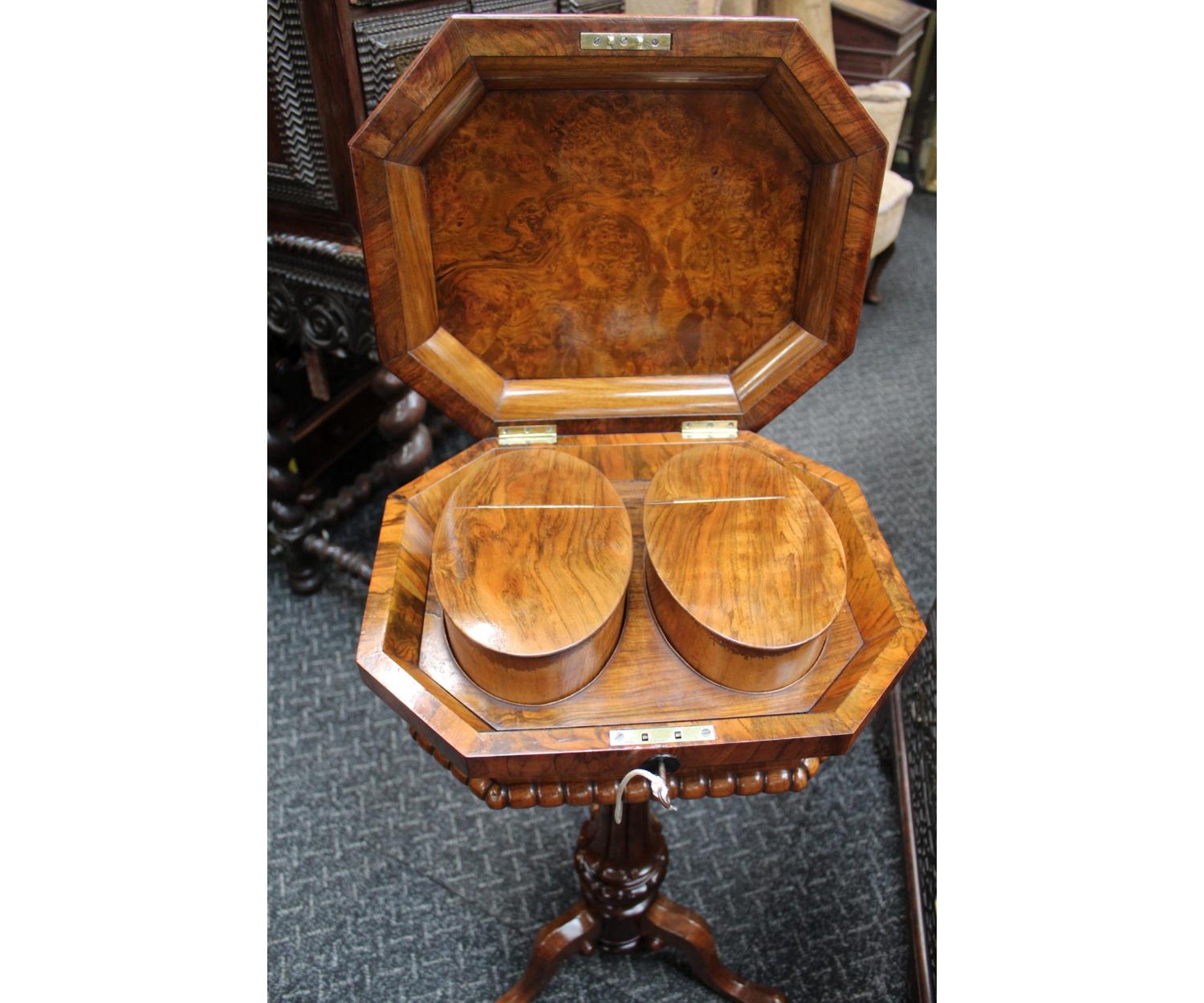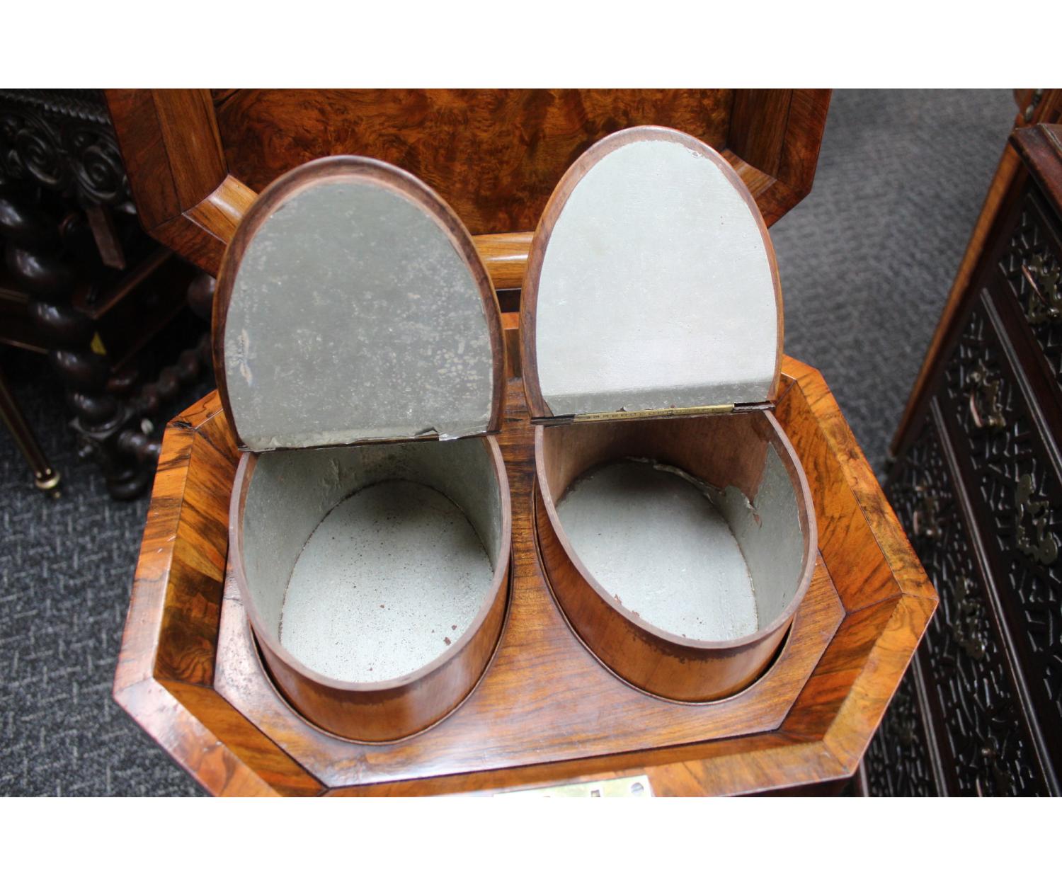 A Walnut Teapoy. Has central column and stands on three splayed feet. Inside two oval caddies. Circa 1860