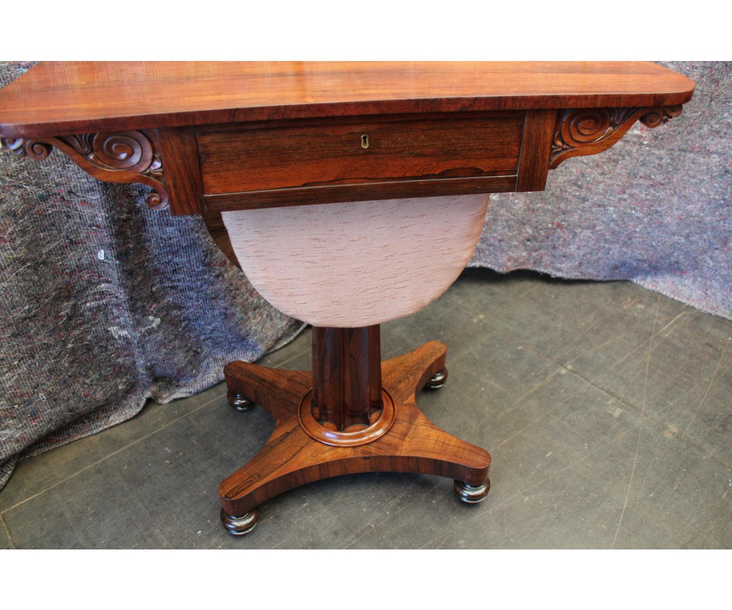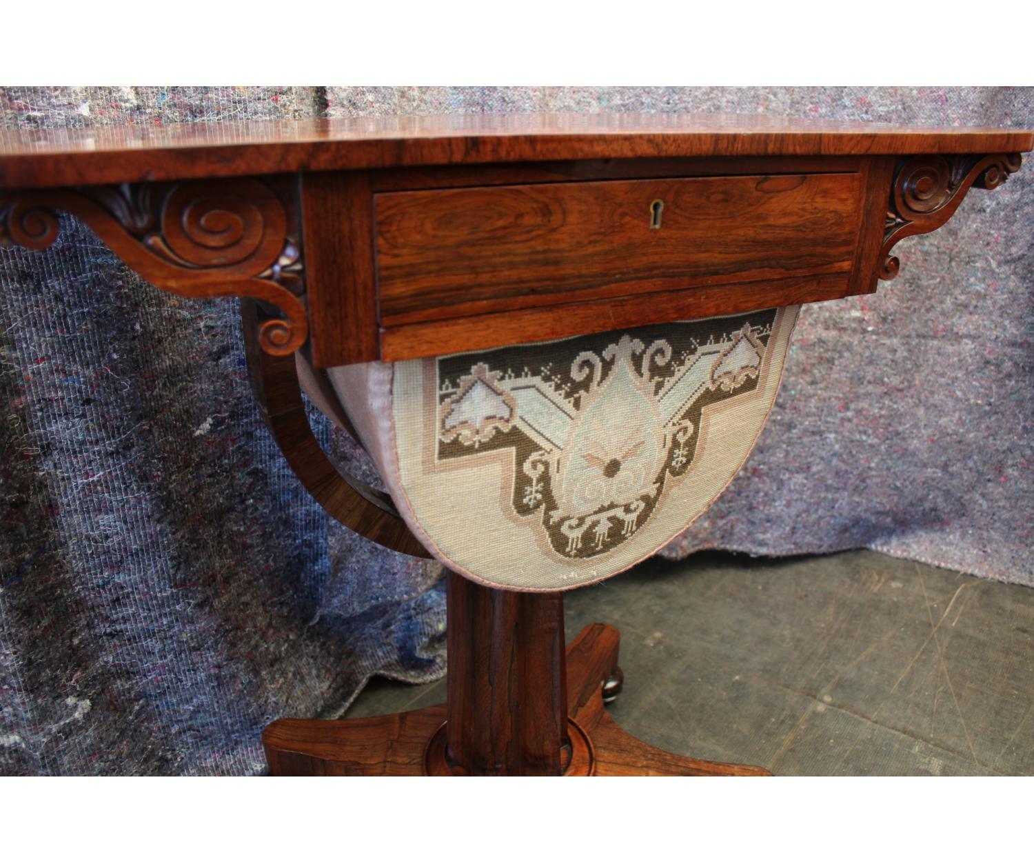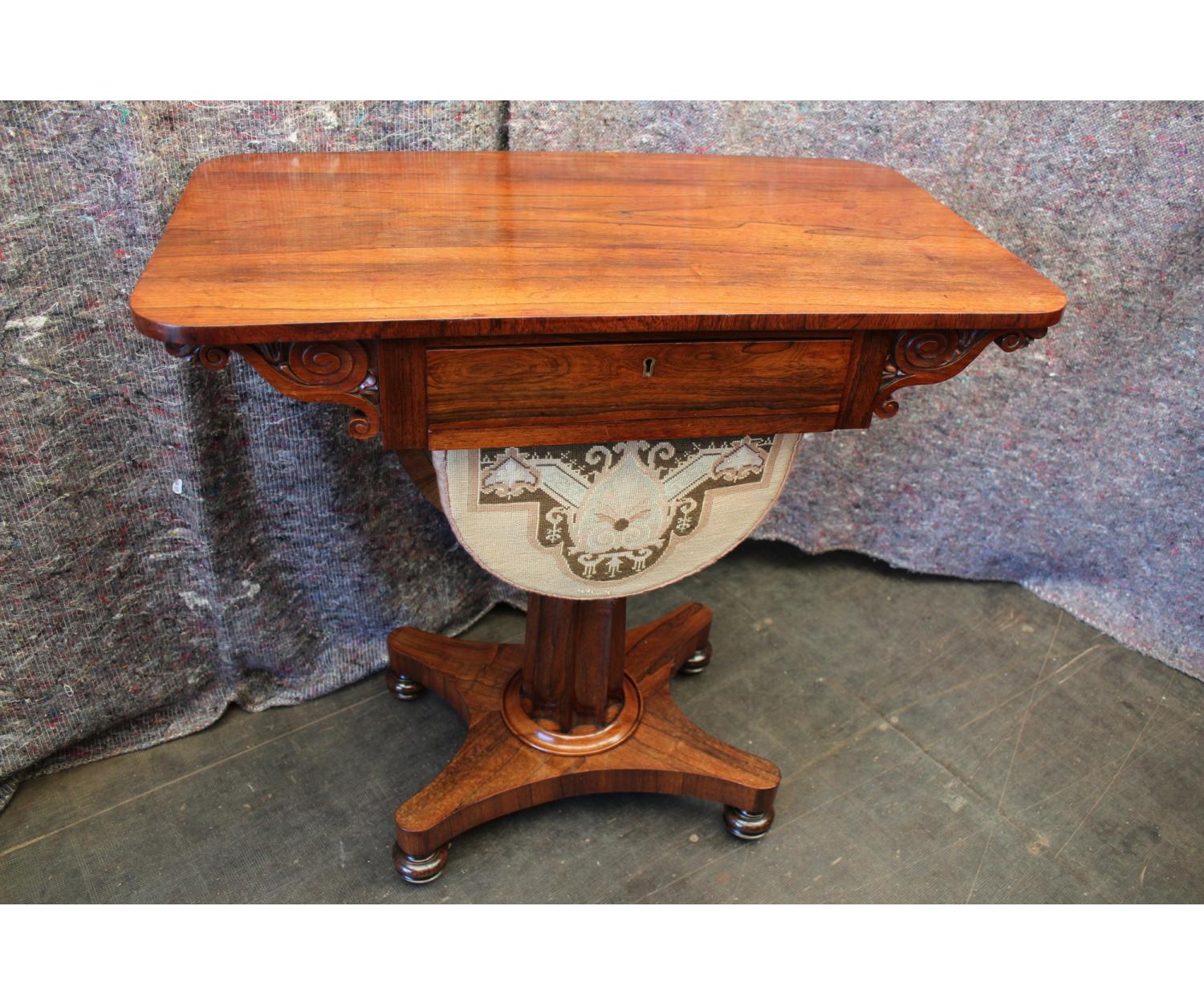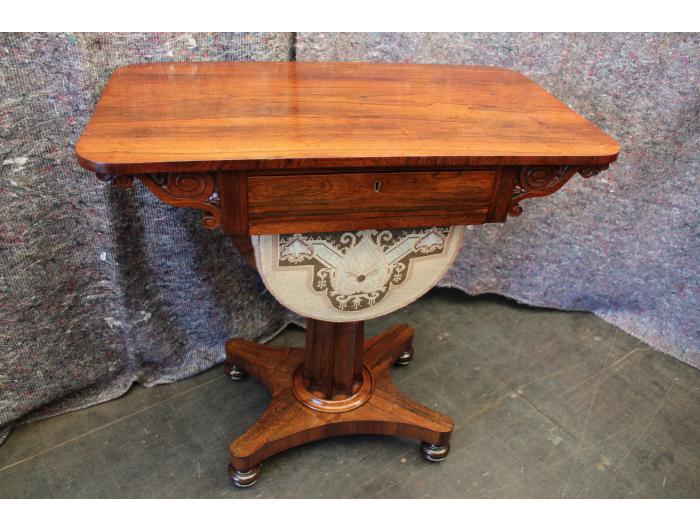 Rosewood Work Table. Has one drawer and basket with tapestry front. Supported on central column and splayed base. Circa 1860