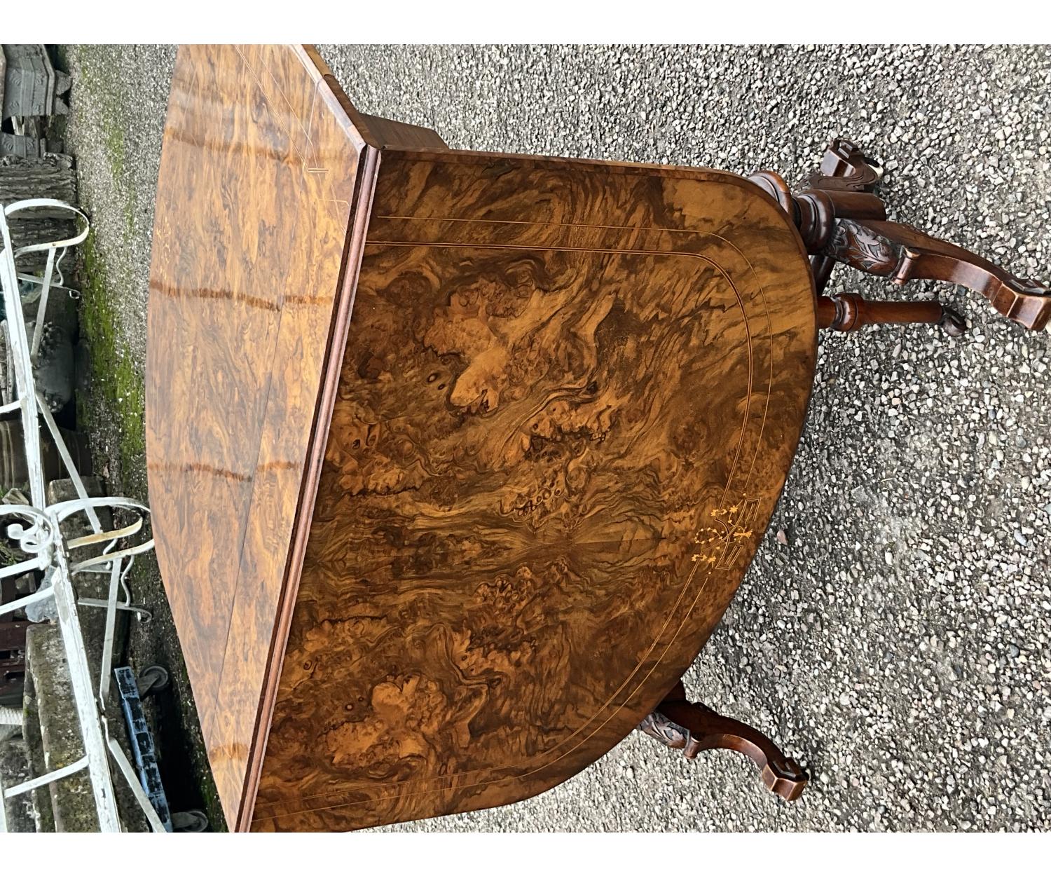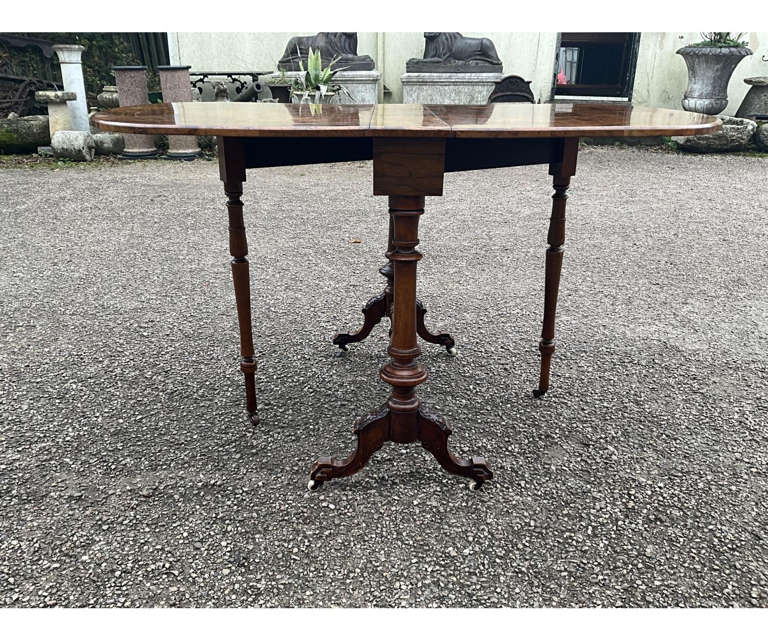 With its intricate detailing and inlay adding to its stylish design, this table is sure to impress any visitor. The perfect combination of form and function, it offers ample space for dining, displaying decorative items, or even using as a work table, folding to a tiny 13cm width at its smallest it’s a real space saver. Whether you're a collector of antique furniture or simply looking for a unique piece to add to your home, this Victorian Sutherland Table is sure to exceed your expectations. A Superior quality table. English Circa 1875.